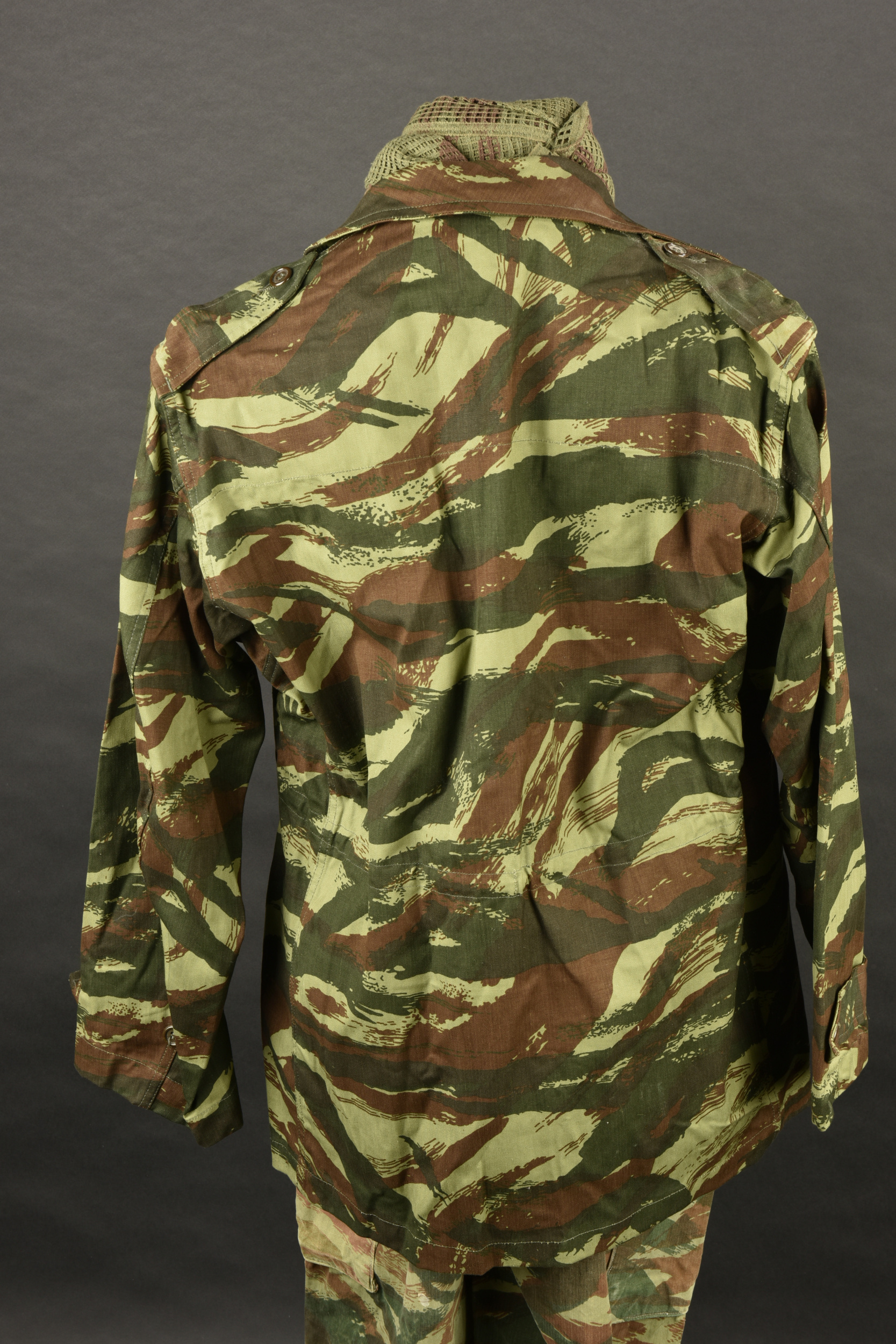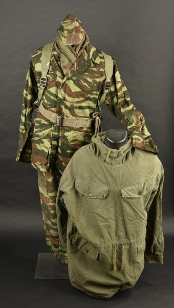 Lot TAP. Comprenant un foulard camouflé. Un brelage TAP 50/53. Un ceinturon TAP 53 Rapco. Une paire de cartouchières MAS 36 TAP modèle 50/51. Un pantalon 47/59 TTA camouflé. Une parka de montagne. Une veste 47/52 TTA camouflée années 70 et une casquett type Bigeard.