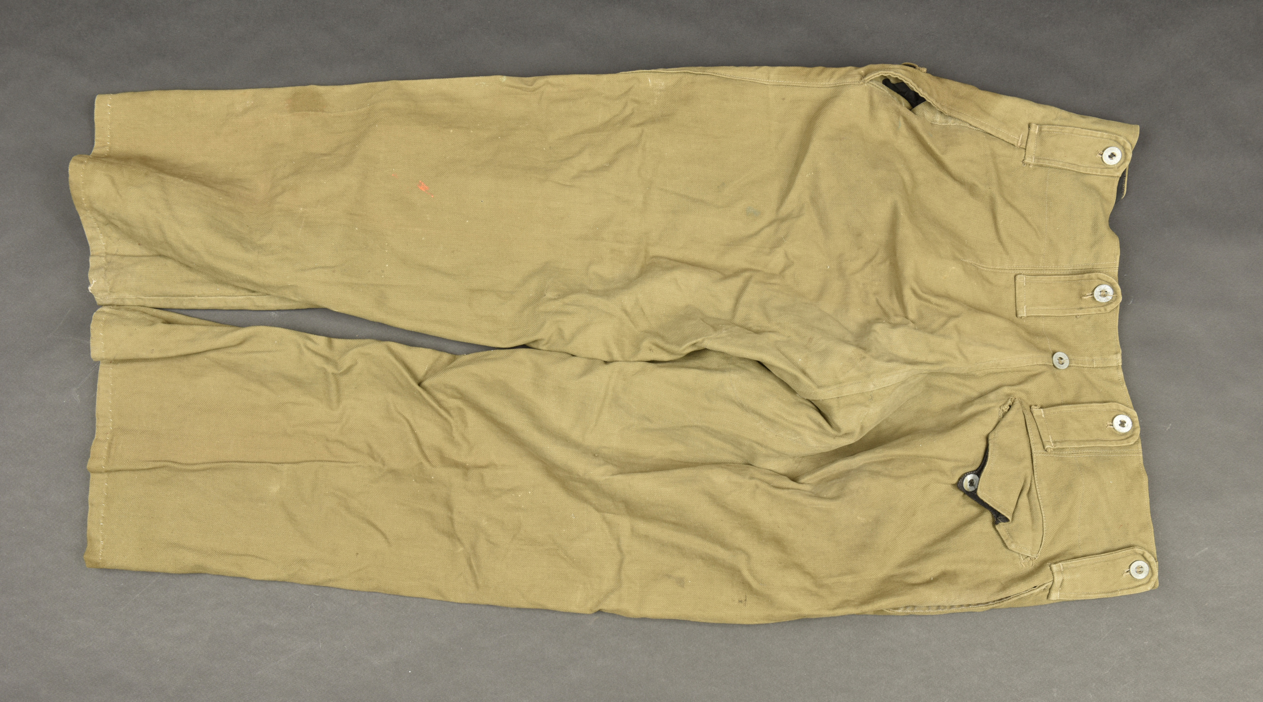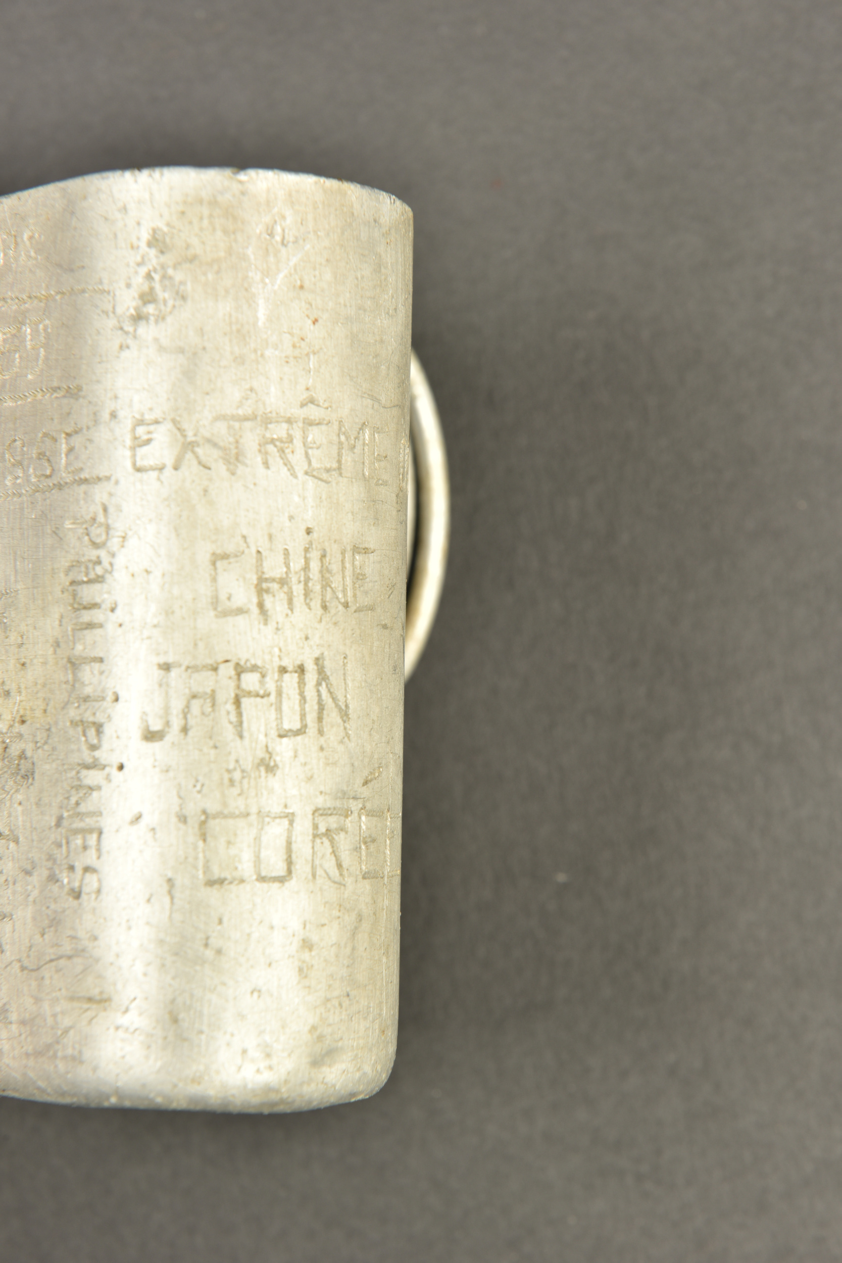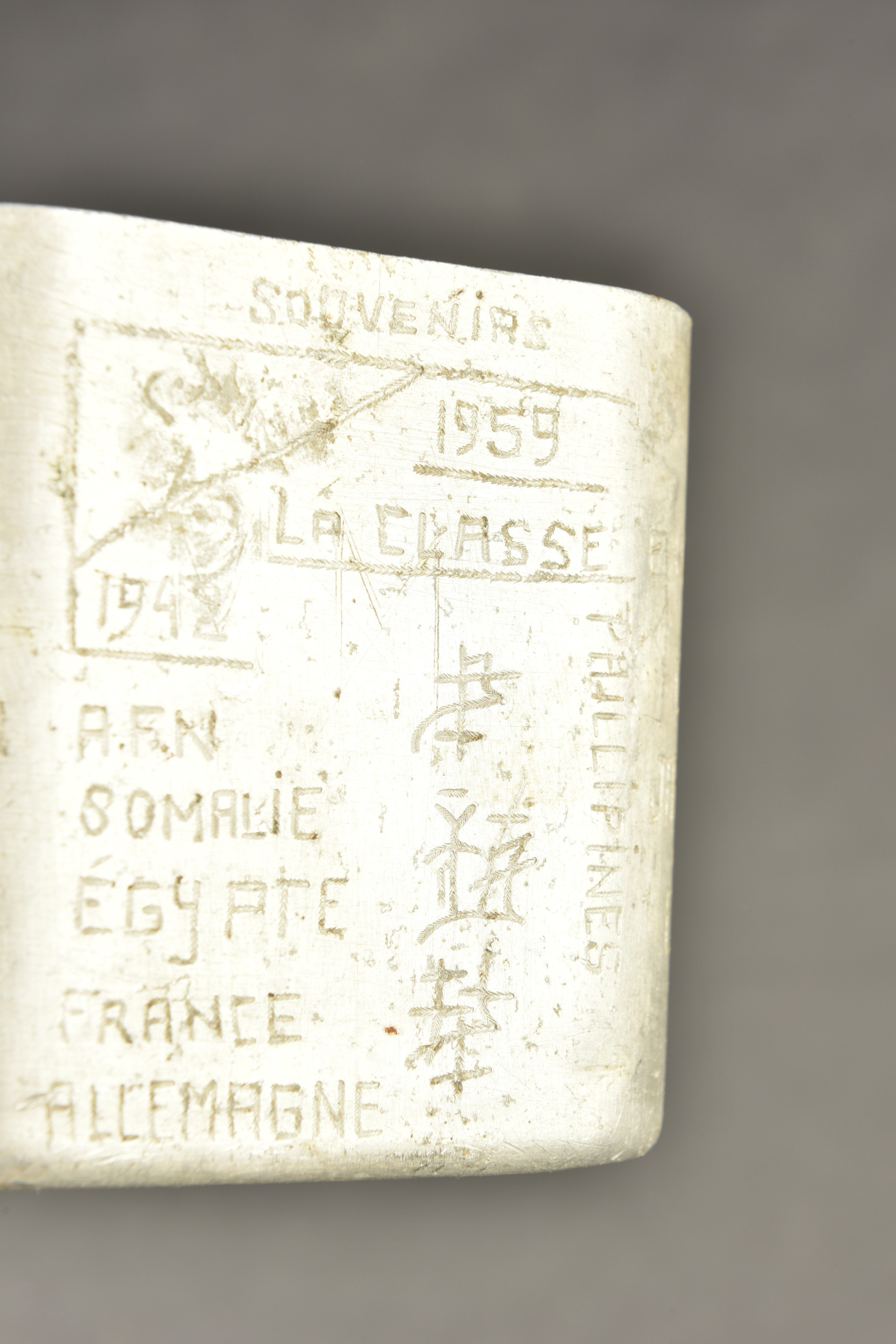 Lot uniformes Extrême Orient. Comprenant une combinaison britannique en tissu kaki datée 1945, deux boutons absents. Ce type de combinaison fut notamment porté par le commando Ponchardier. Un pantalon modèle 1944 français, doublure en satinette noire, un bouton absent, retaillé aux bas des jambes. Une paire de brodequins à jambière d’achat privé de très belle facture. Un quart gravé par le soldat Regnier à partir de 1942 et reprenant toute sa campagne en Extrême Orient.