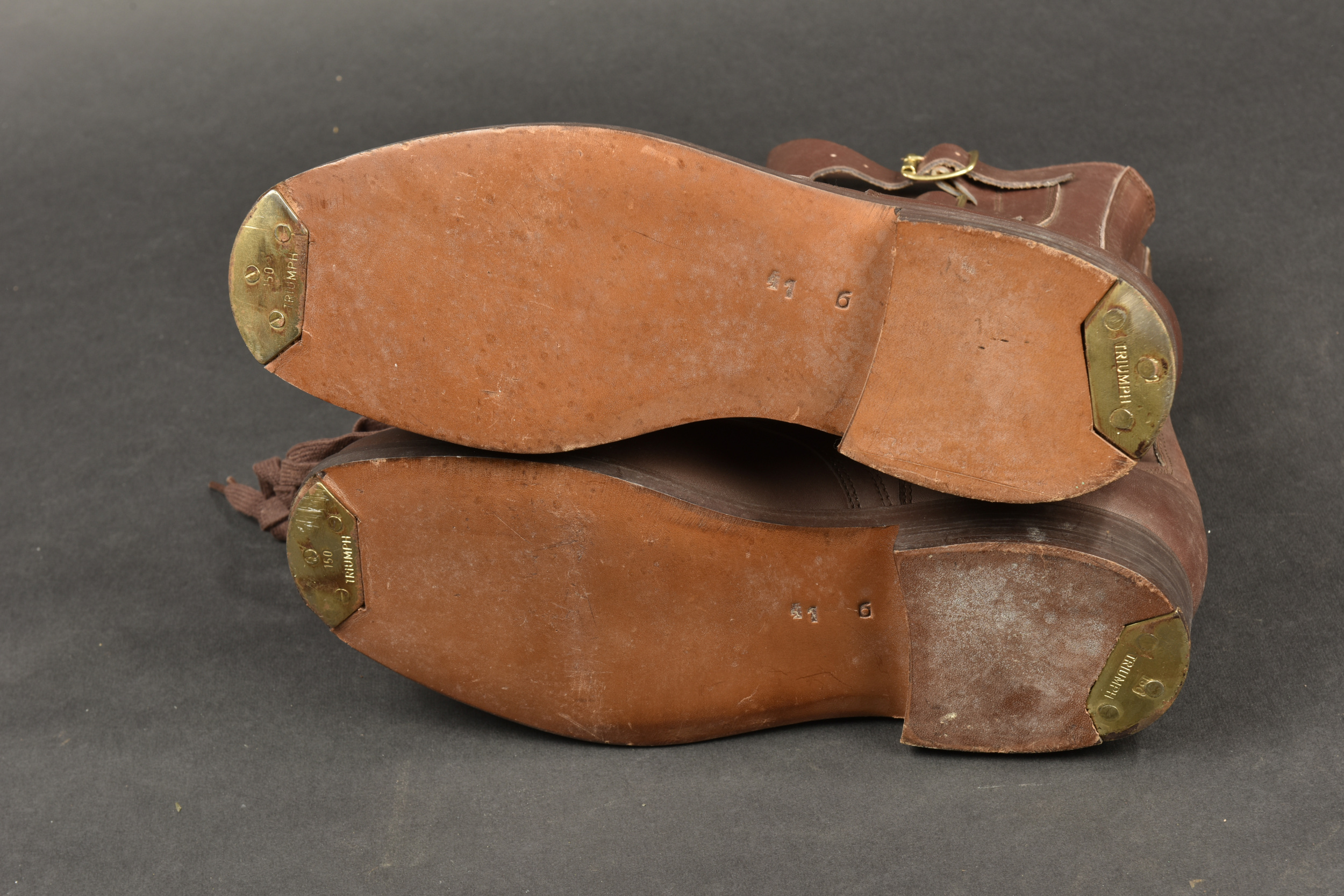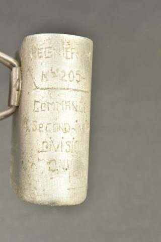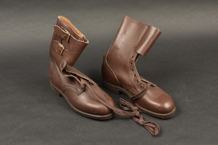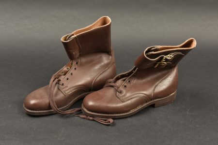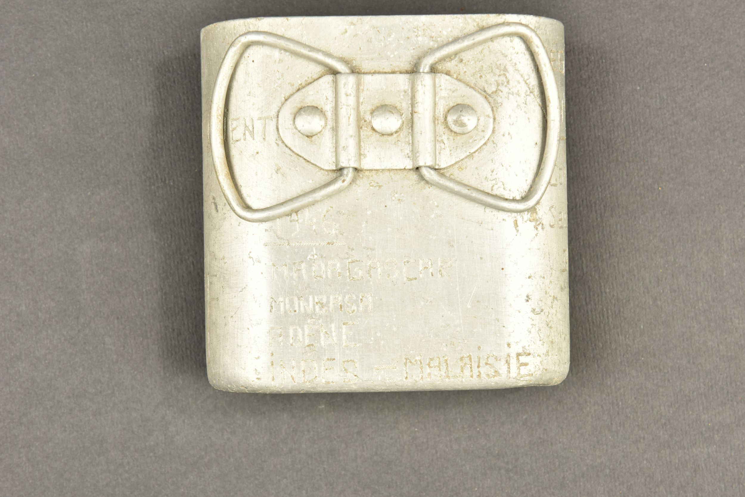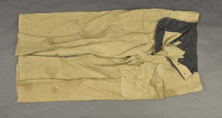Lot uniformes Extrême Orient. Comprenant une combinaison britannique en tissu kaki datée 1945, deux boutons absents. Ce type de combinaison fut notamment porté par le commando Ponchardier. Un pantalon modèle 1944 français, doublure en satinette noire, un bouton absent, retaillé aux bas des jambes. Une paire de brodequins à jambière d’achat privé de très belle facture. Un quart gravé par le soldat Regnier à partir de 1942 et reprenant toute sa campagne en Extrême Orient.