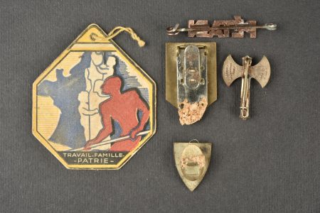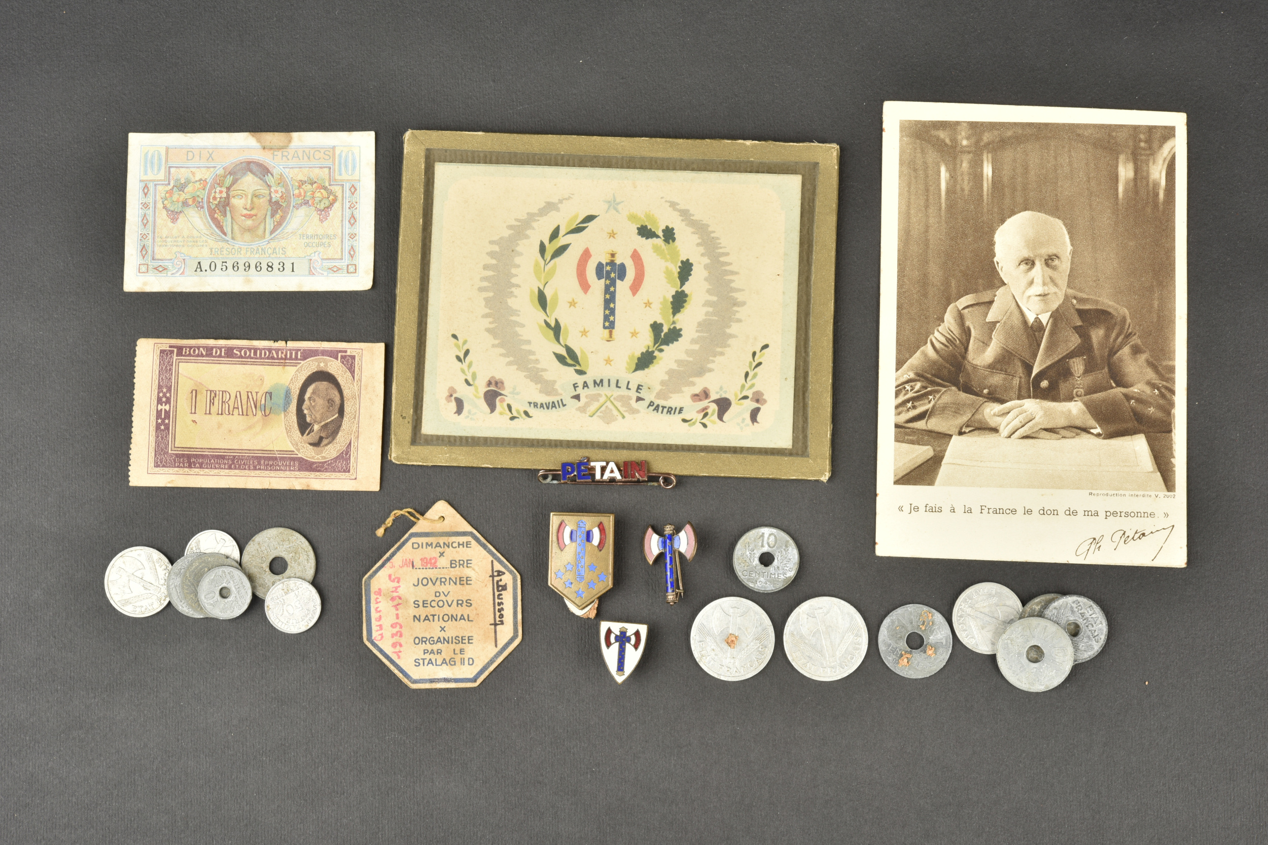 Maréchal Pétain. Comprenant quinze pièces de monnaie de l’Etat Français. Un billet de 10 francs et un billet de 1 francs à l’effigie du Maréchal Pétain. Un petit cadre contenant une carte postale en couleur Travail Famille Patrie. Une étiquette cartonnée du secours national. Une carte postale à l’effigie du Maréchal Pétain. Une épinglette en métal, marquée Maréchal Pétain, attache complète. Un insigne de la Francisque en métal émaillé, attache complète, fabrication Arthus Bertrand Paris. Un insigne de l’Etat Français en métal émaillé, modèle à boutonnière, maqué OA13. Un insigne en métal émaillé. A noter une certaine usure et patine de la pièce. Etat II+.