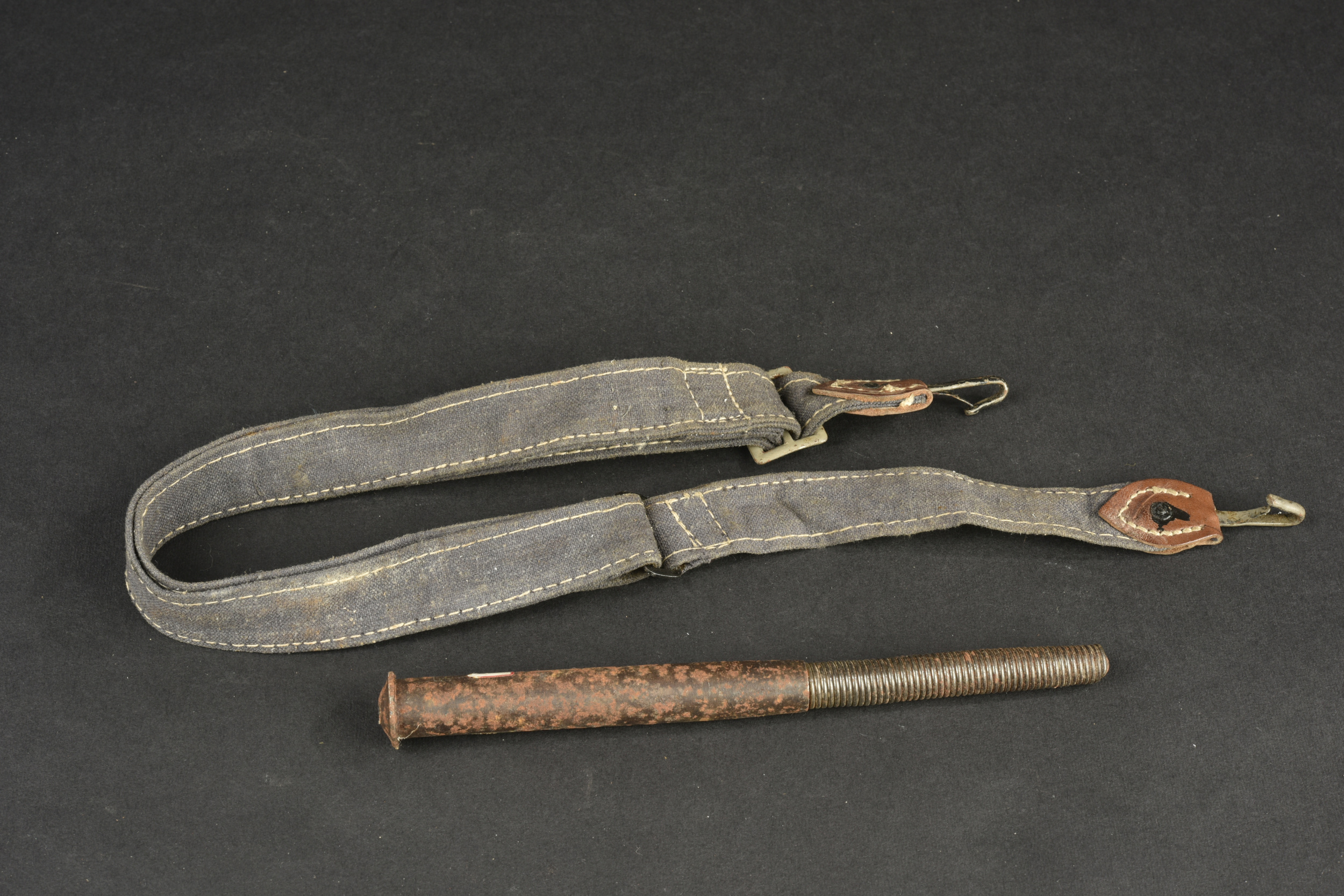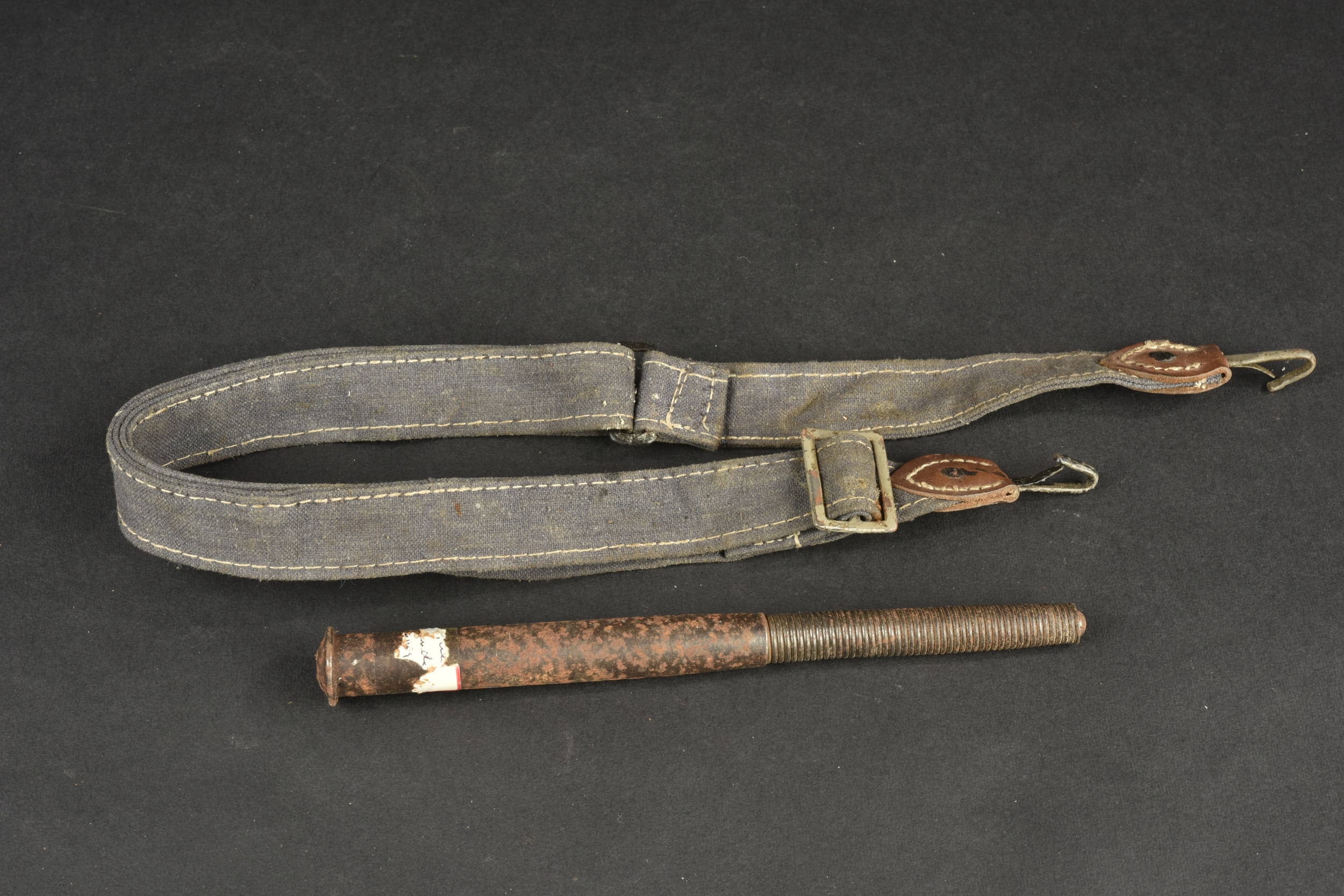 Détails de la vente >Matraque allemande. En métal, téléscopique. Fortement oxydé. Sans marquages visibles, incomplète. On y joint une bretelle de sac à pain de la Luftwaffe, en tissu coton gris/bleu, les... en savoir plus