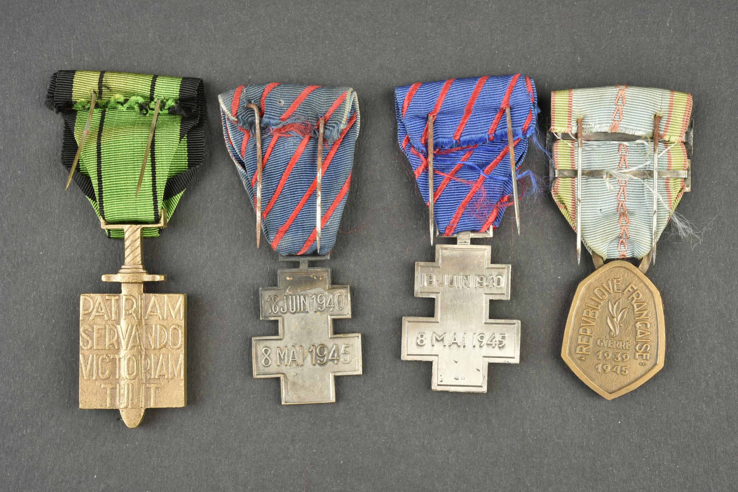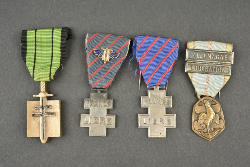 Médaille de la France Libre et Ordre de la Libération. Médaille de la France Libre avec miniature de l’insigne sur le ruban, une seconde marquée Corne d’Abondance, une reproduction de médaille de Compagnon de le Libération et une commémorative 40-45 avec agrafes Libération et Allemagne