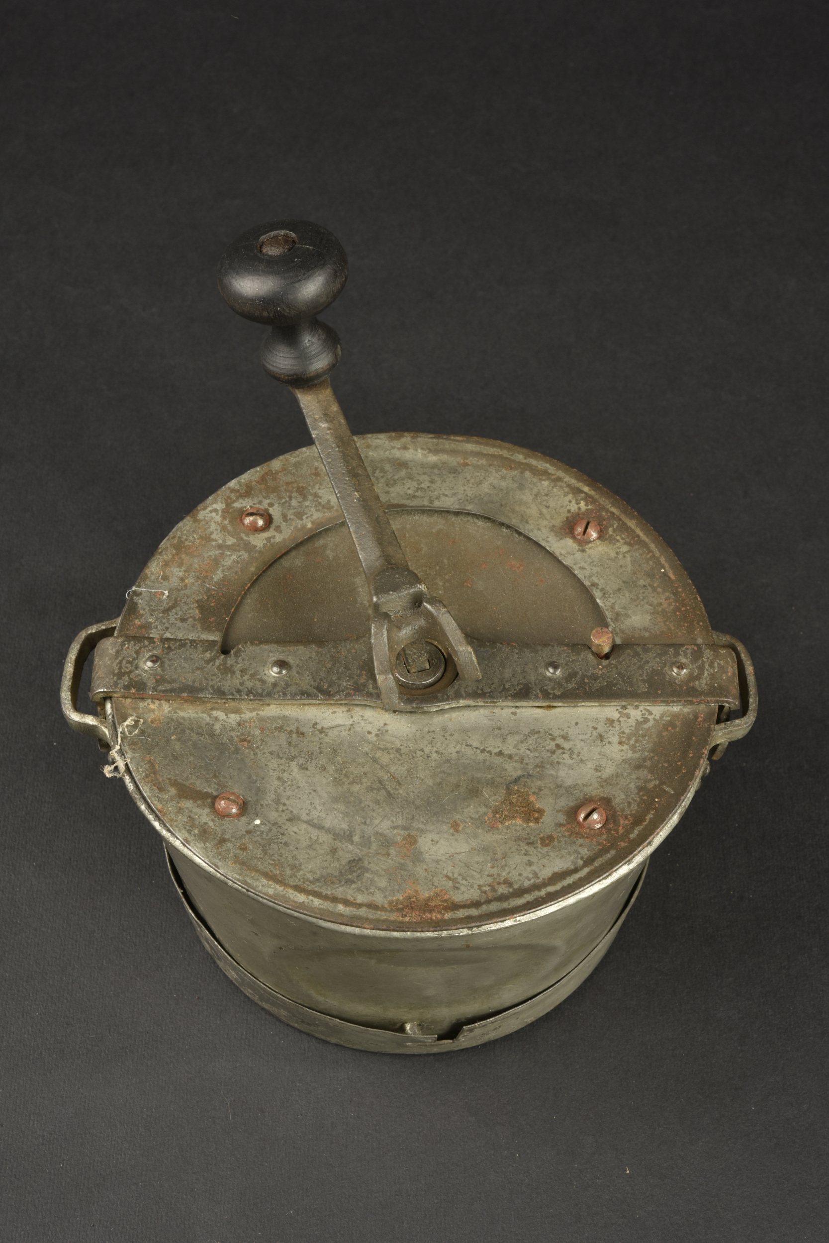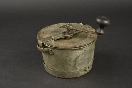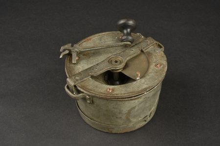Moulin à café Klepper. Moulin à café de Poilu, avec son tamis, son plat inférieur, sa manivelle. Têton d’ouverture du clapet remplacé. Bon état