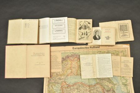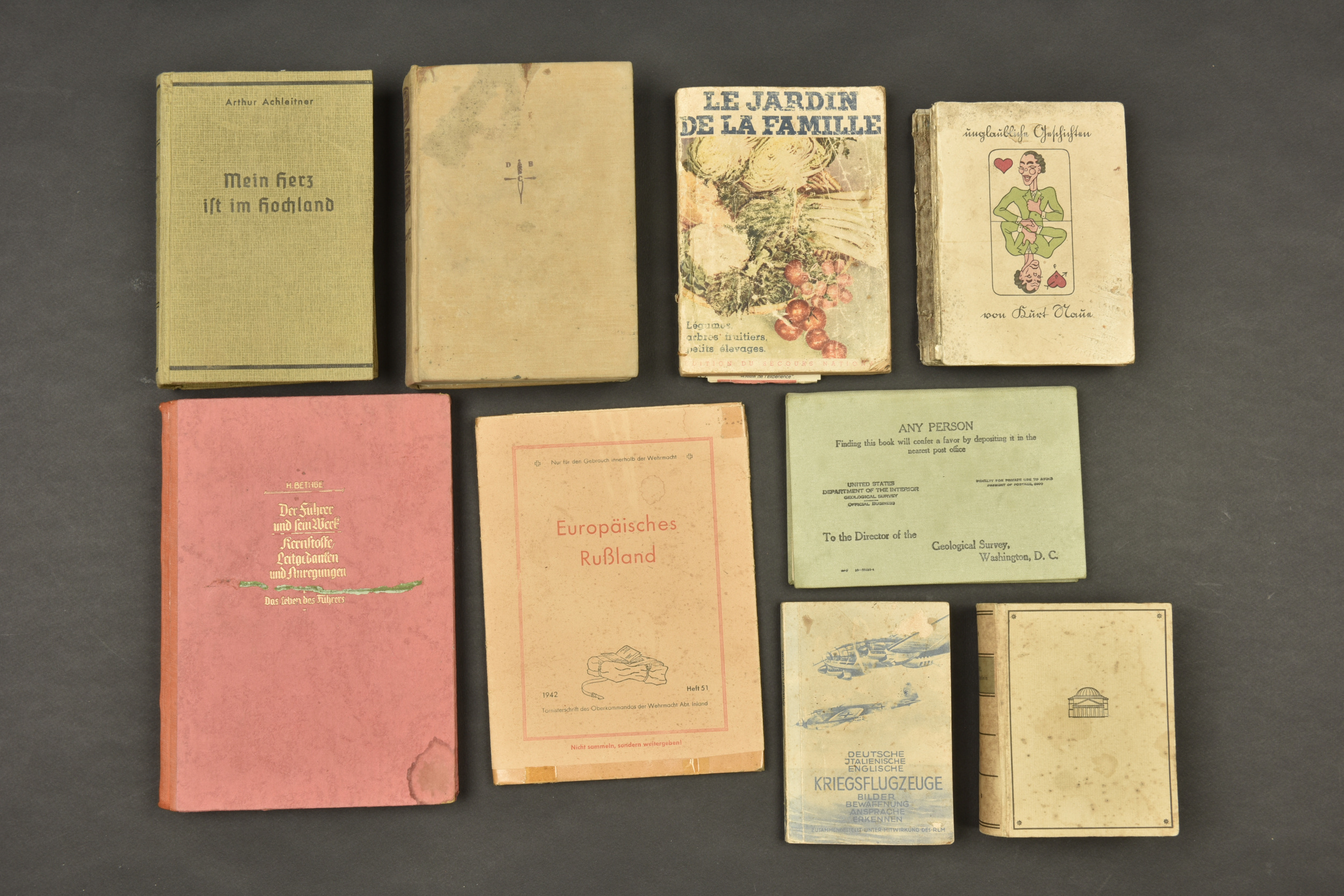 Ouvrages divers. Comprenant un livret Kriegsflugzeuge. Une carte Europäisches Russland 1942. Un ouvrage de H Bethge. Un livre Mein Herz ist im Hochland. Un livre The case of Mosquito. Un livre Secours National Le jardin de la famille. Un livret Any Person. Un livre allemand. Un livre Schatzkälstein. A noter une certaine usure et patine des picèes. Etat II+.