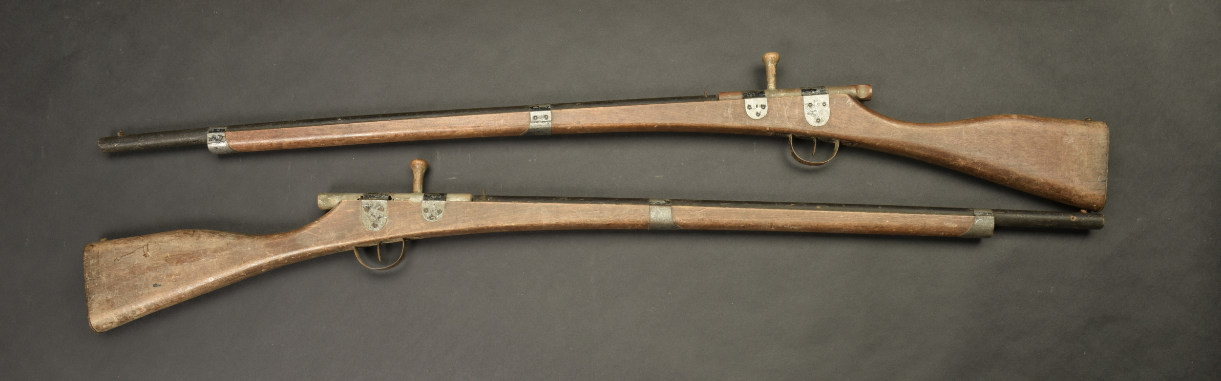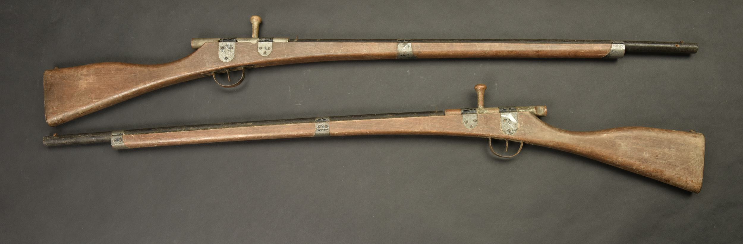 Paire de fusils bataillons scolaires en bois. Fusils destinés au maniement des armes pour les bataillons scolaires. Culasses et canons également en bois. Les deux portent le marquage du fabricant P.Hud à Albi.