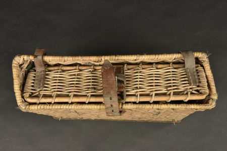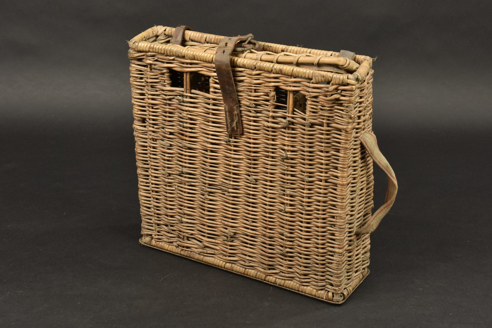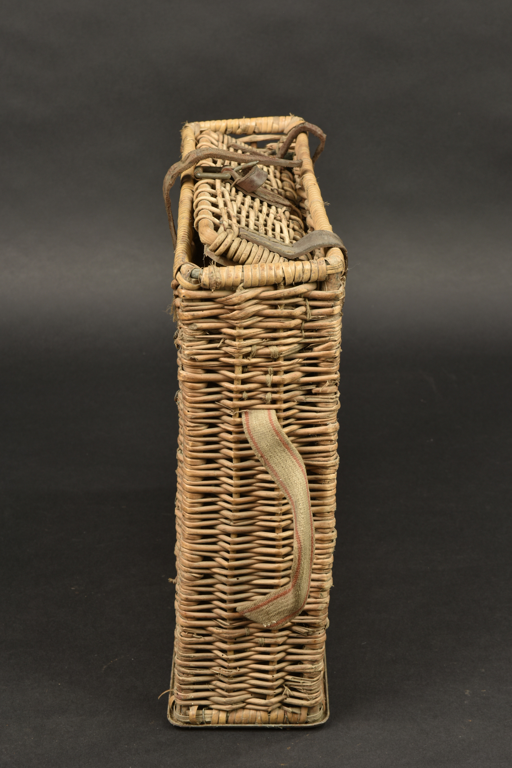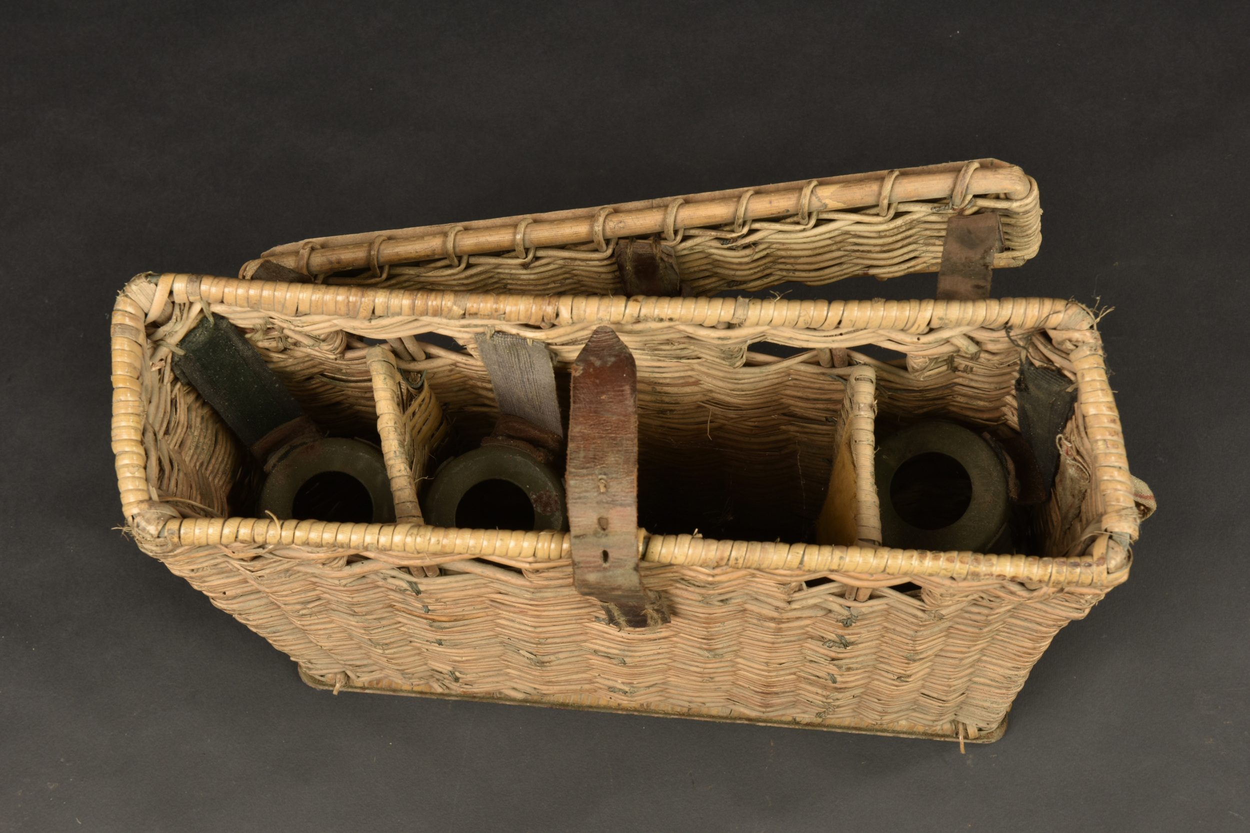 Panier à obus allemand. En osier, couvercle en métal. 3 compartiments. Toutes les sangles en cuir sont complètes. Daté 1940. Restes de marquages illisibles. A noter une certaine usure et patine de la pièce. Etat II+.