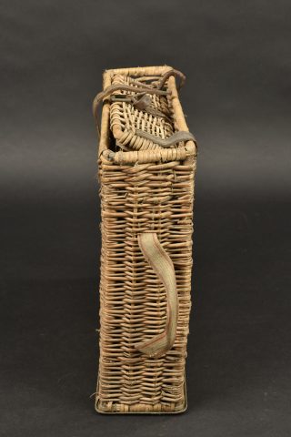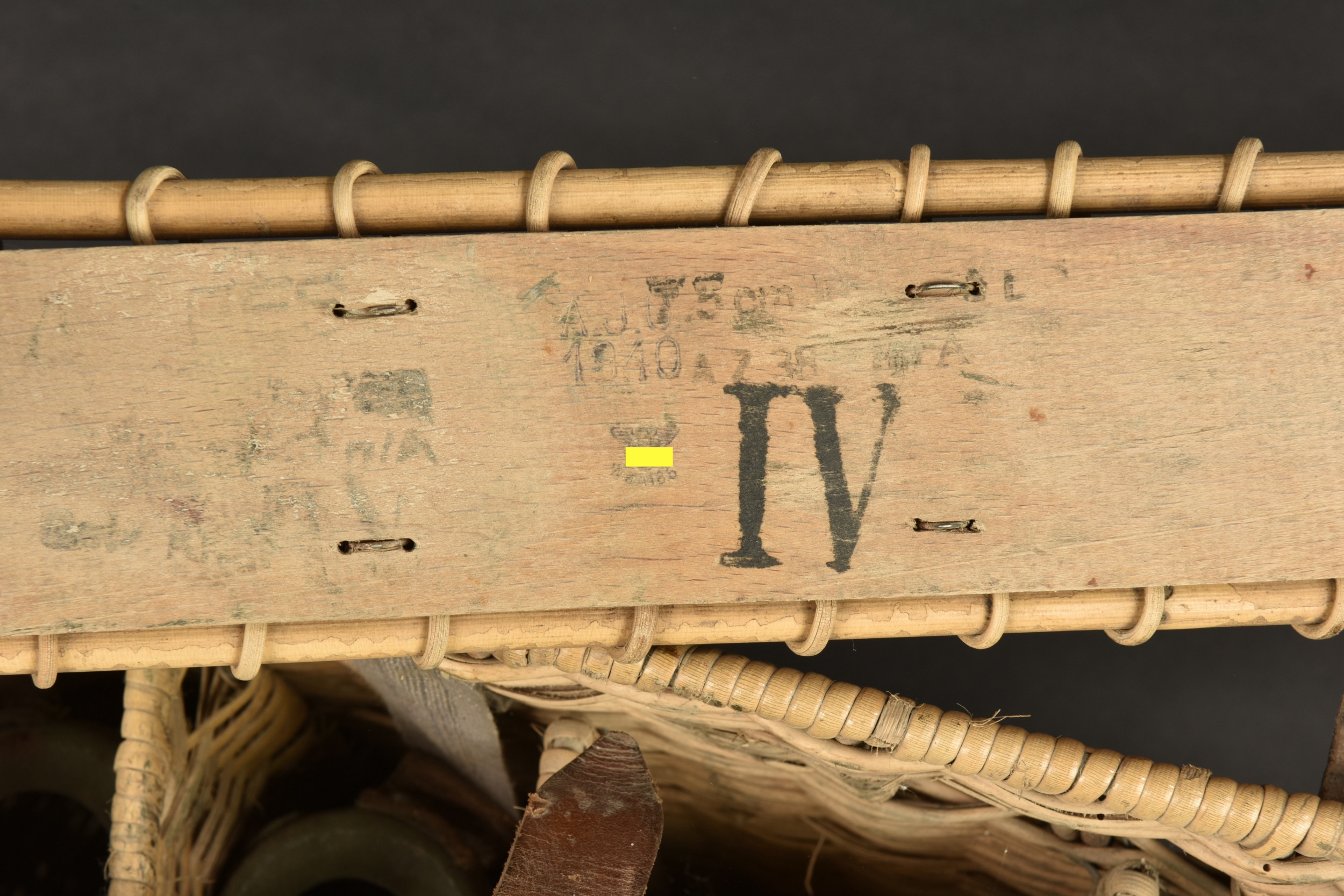 Détails de la vente >Panier à obus allemand. En osier, couvercle en métal. 3 compartiments. Toutes les sangles en cuir sont complètes. Daté 1940. Restes de marquages illisibles. A noter une certaine usure et... en savoir plus
