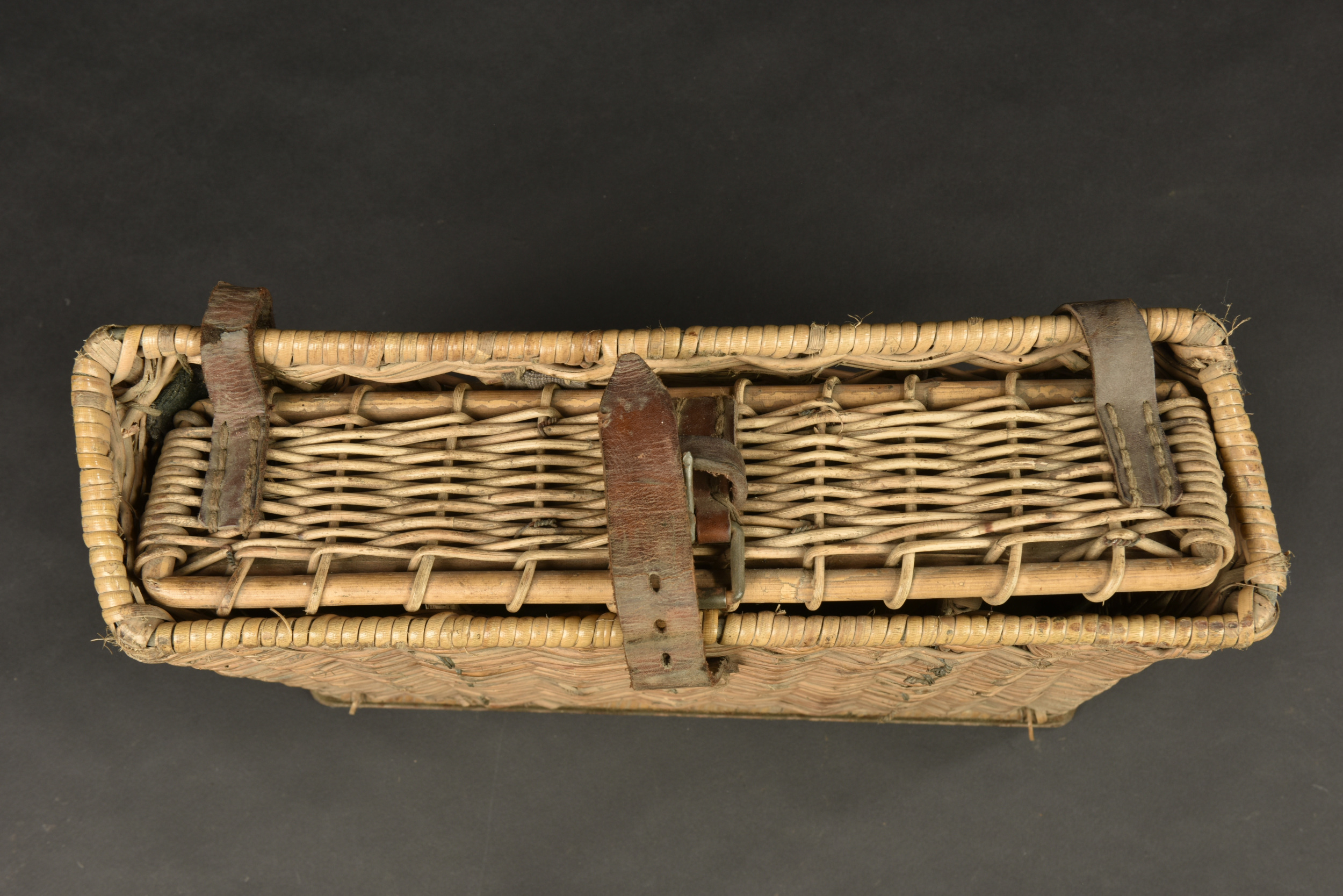 Panier à obus allemand. En osier, couvercle en métal. 3 compartiments. Toutes les sangles en cuir sont complètes. Daté 1940. Restes de marquages illisibles. A noter une certaine usure et... en savoir plus