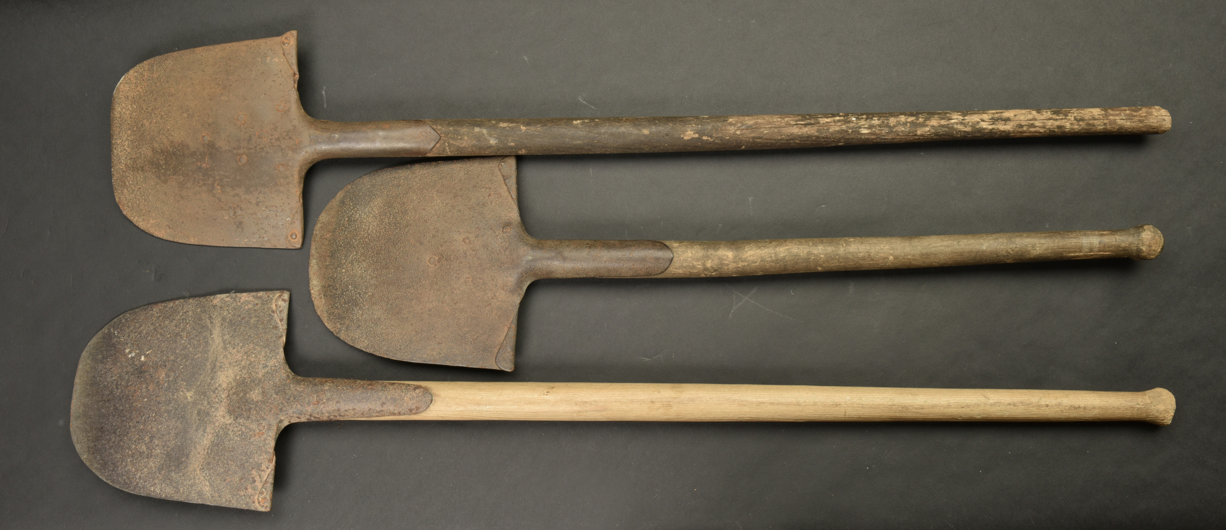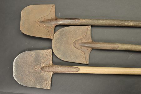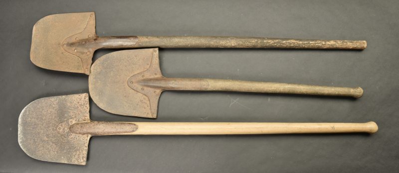 Pelles allemande. Trois pelles dont un modèle plus court. Marquages illisibles. Nombreux trous de vers au niveau des manches en bois. Toutes les parties métalliques sont oxydées. A noter une forte usure et oxydation des pièces. Etat II-.