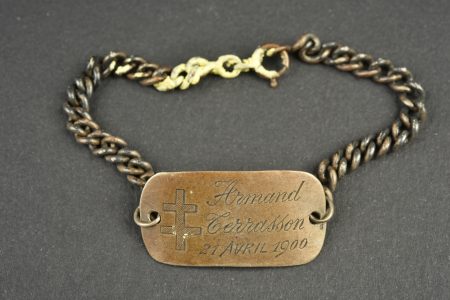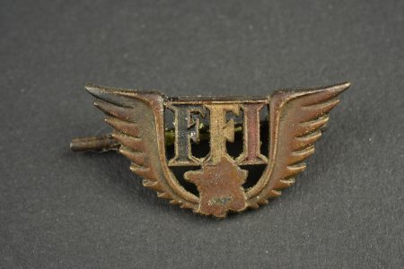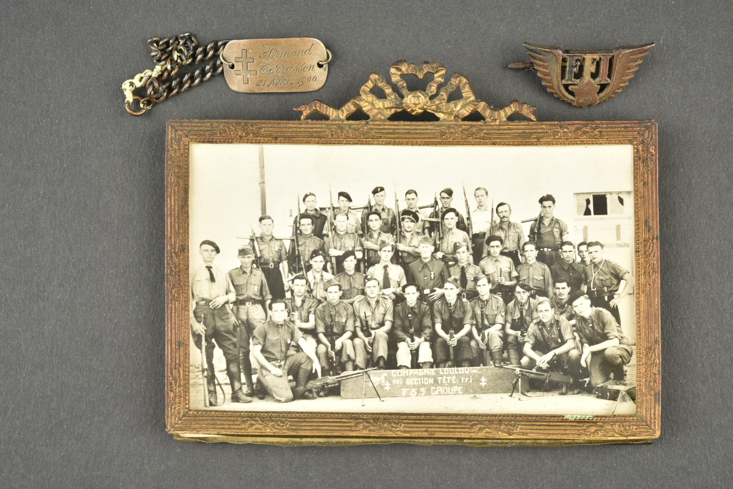 Photo, gourmette et insigne d’un résistant Compagnie Loulou des FFI. Ensemble du même homme comprenant une photo de groupe portant la mention Compagnie Loulou, section Tété 7e, 8e, 9e Groupe. Sa gourmette portant le nom Armand Terrasson 21 avril 1900 et une croix de Lorraine, et son insigne FFI portant le numéro 192580. On trouve notamment une Compagnie Loulou dans le Groupement du Louhannais en Saone et Loire. Patine, restes de patafix jaune facilement nettoyable
