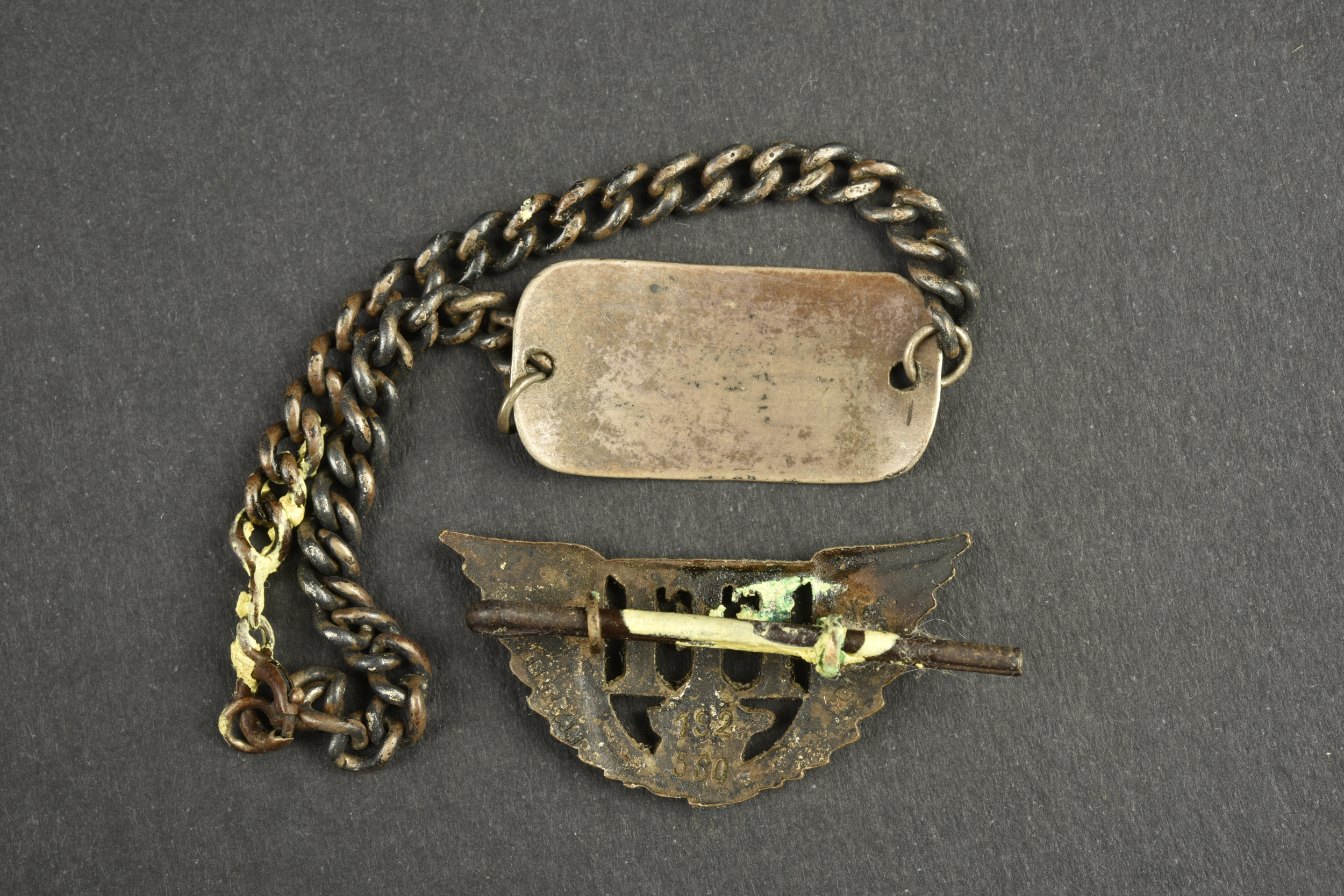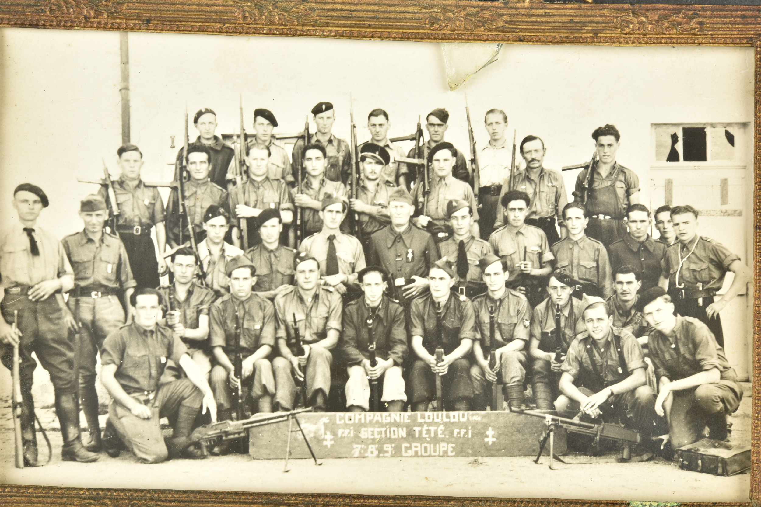 Détails de la vente >Photo, gourmette et insigne d’un résistant Compagnie Loulou des FFI. Ensemble du même homme comprenant une photo de groupe portant la mention Compagnie Loulou, section Tété 7e, 8e, 9e... en savoir plus