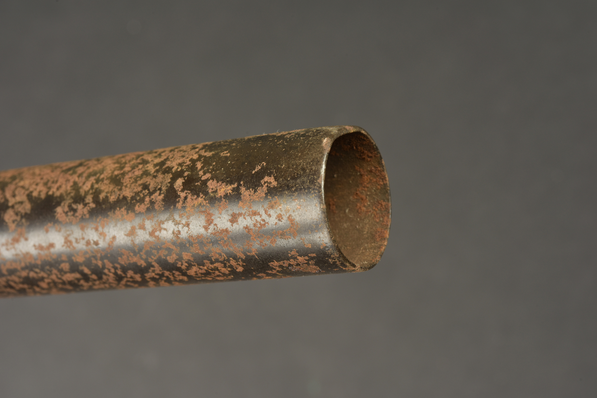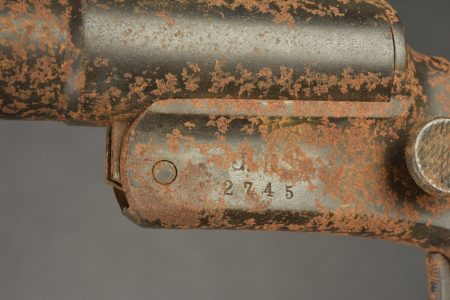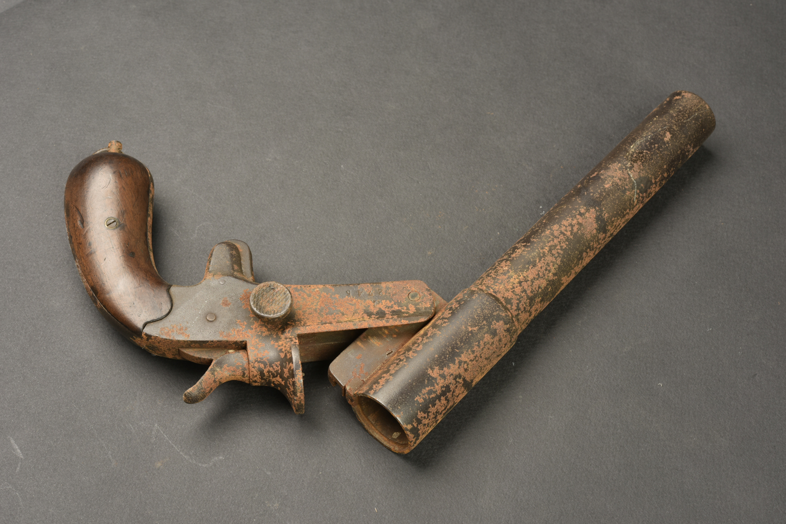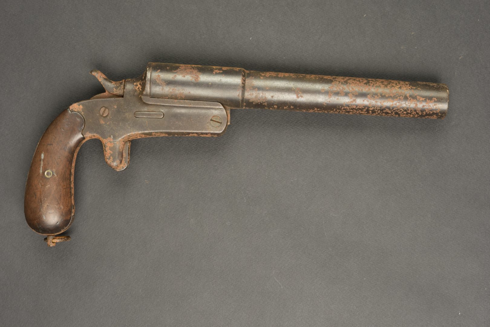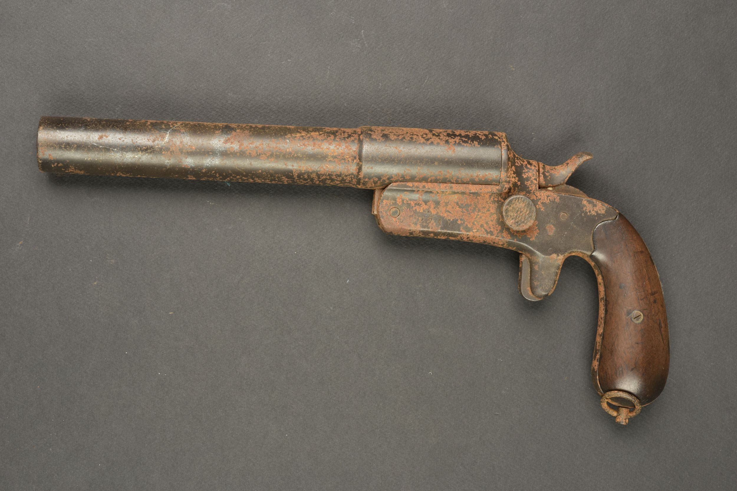 Détails de la vente >Pistolet lance fusée allemand Druckknopf de la 1e Guerre. En métal bronzé, oxydation sur la quasi-totalité des parties métalliques, à nettoyer. Plaquettes bois. Anneau de grenadière... en savoir plus