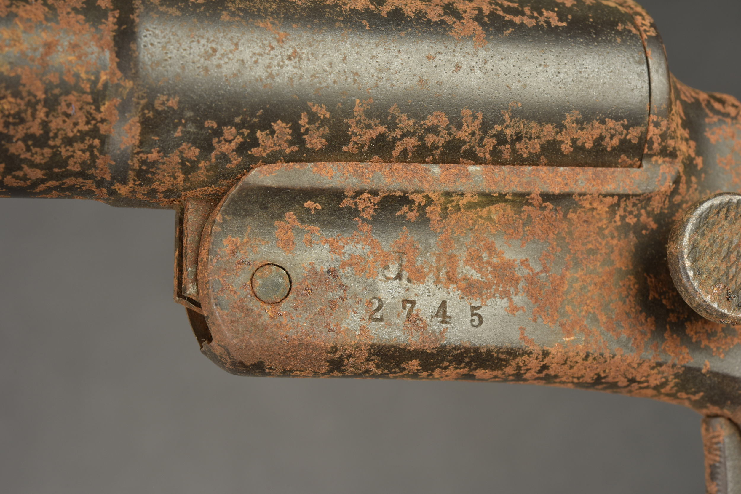 Pistolet lance fusée allemand Druckknopf de la 1e Guerre. En métal bronzé, oxydation sur la quasi-totalité des parties métalliques, à nettoyer. Plaquettes bois. Anneau de grenadière présent. Fabricant JK, numéro de série 2745. Mécanisme fonctionnel, un peu grippé.