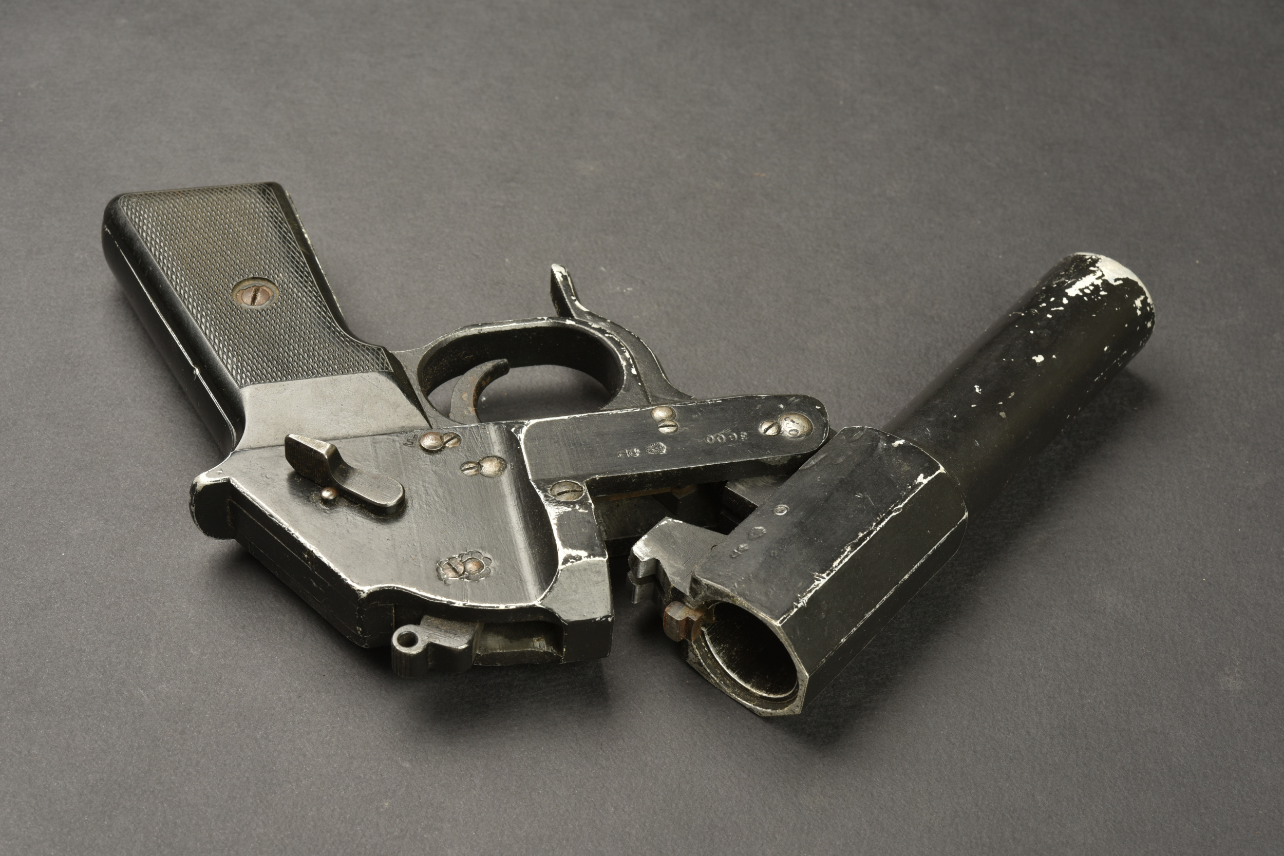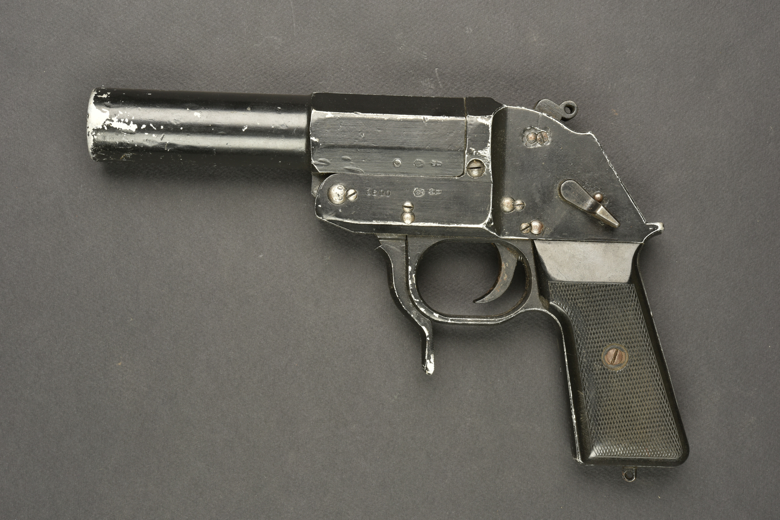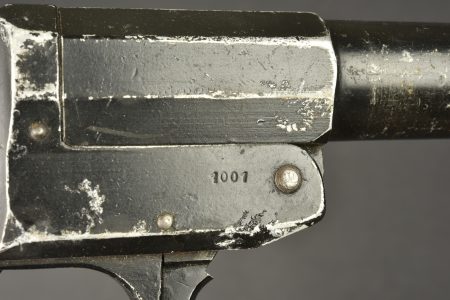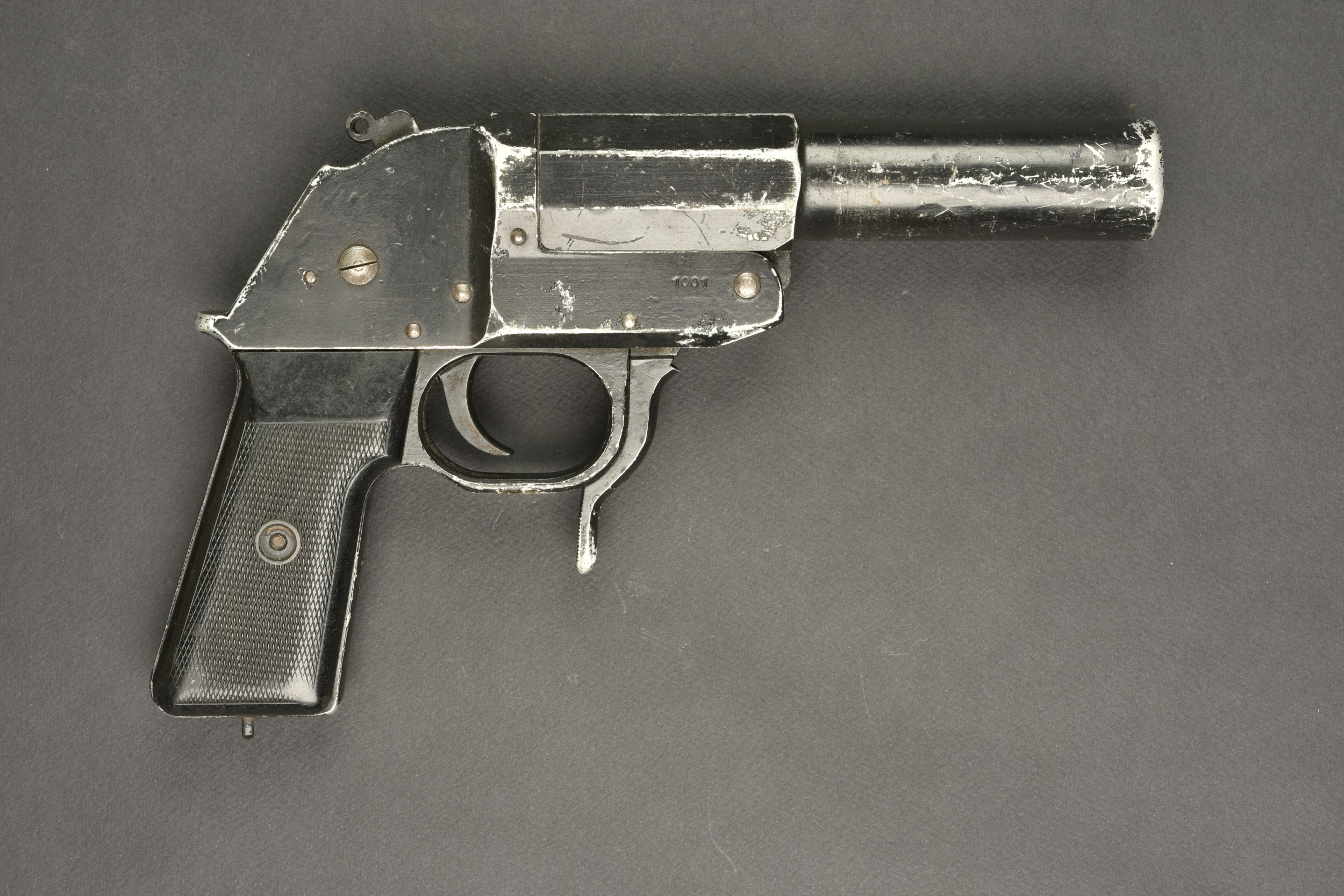 Détails de la vente >Pistolet lance fusées 1001 de la NVA. Peu courant Signalpistole 1001 de l’ex-Allemagne de l’Est, conception basée sur le Modell 1928. En aluminium peint en noir. Marqué 1001 sur le... en savoir plus