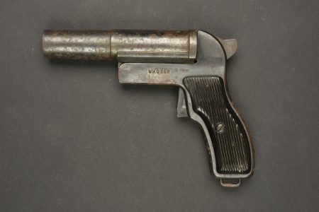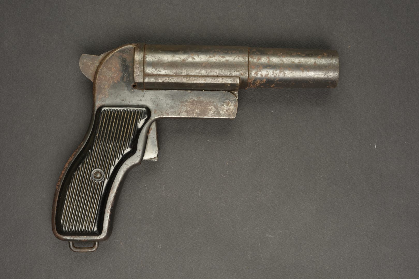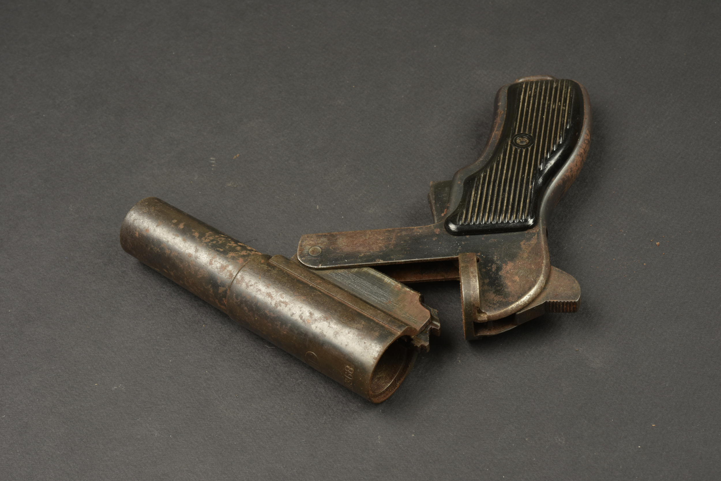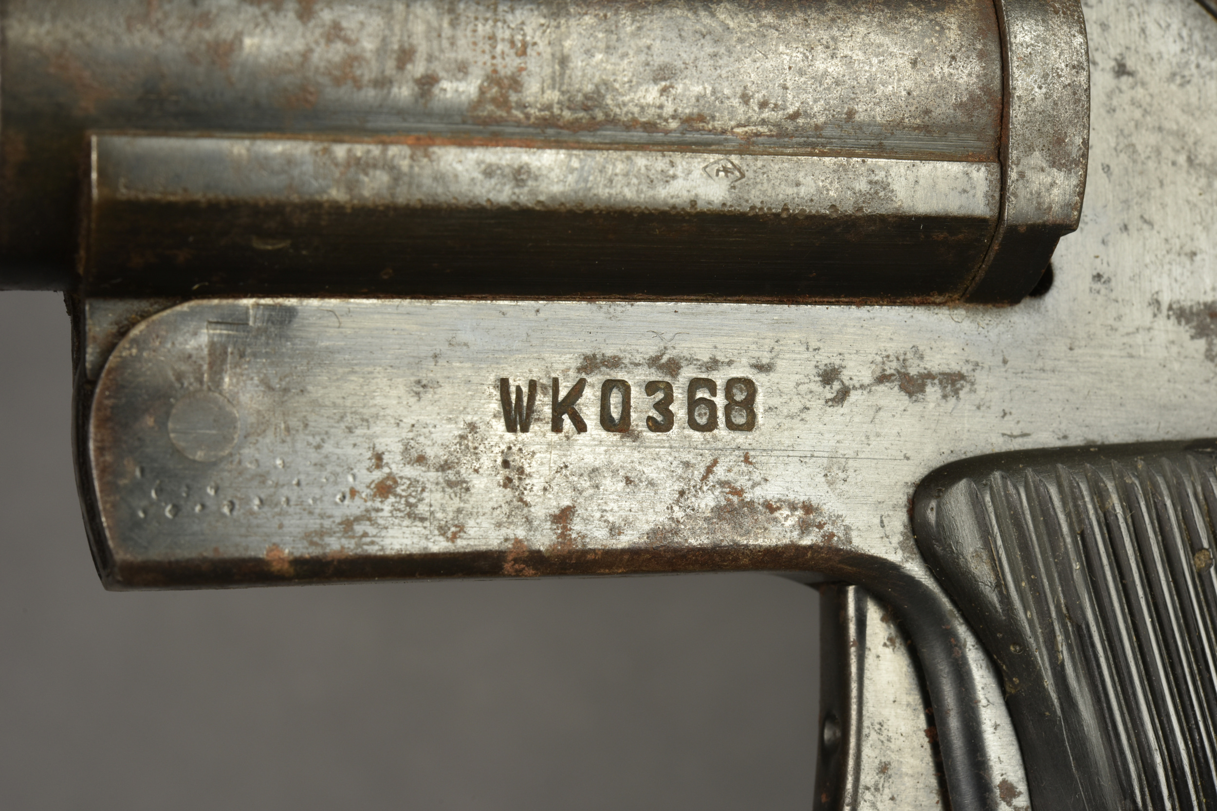 Pistolet lance fusée Pacte de Varsovie. Lance fusée du bloc de l’Est, polonais ou Bulgare, sur la base du lance fusée russe SPSH44. Marquage 11 dans un ovale sur le dessus du canon. Numéro WK0368 sur la carcasse et le canon. Rouille superficielle. Mécanisme fonctionnel.