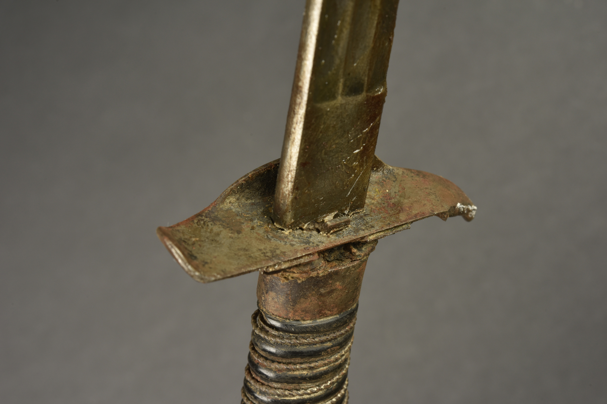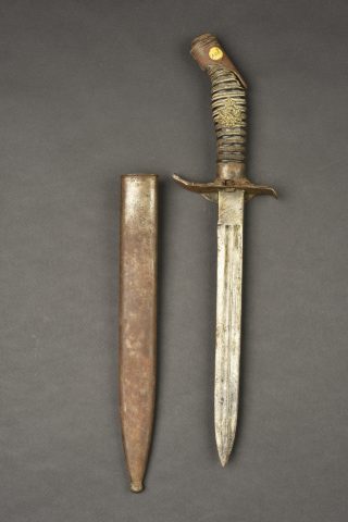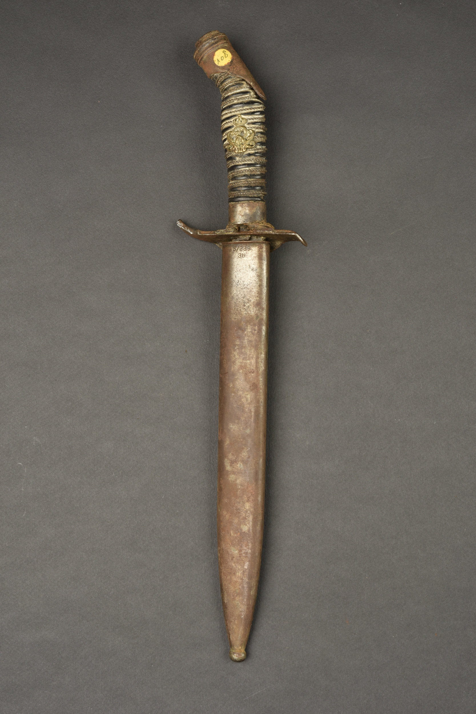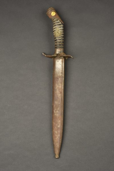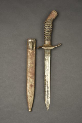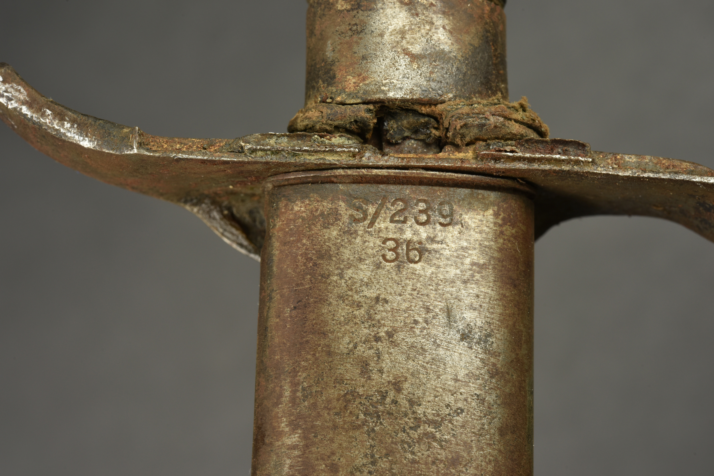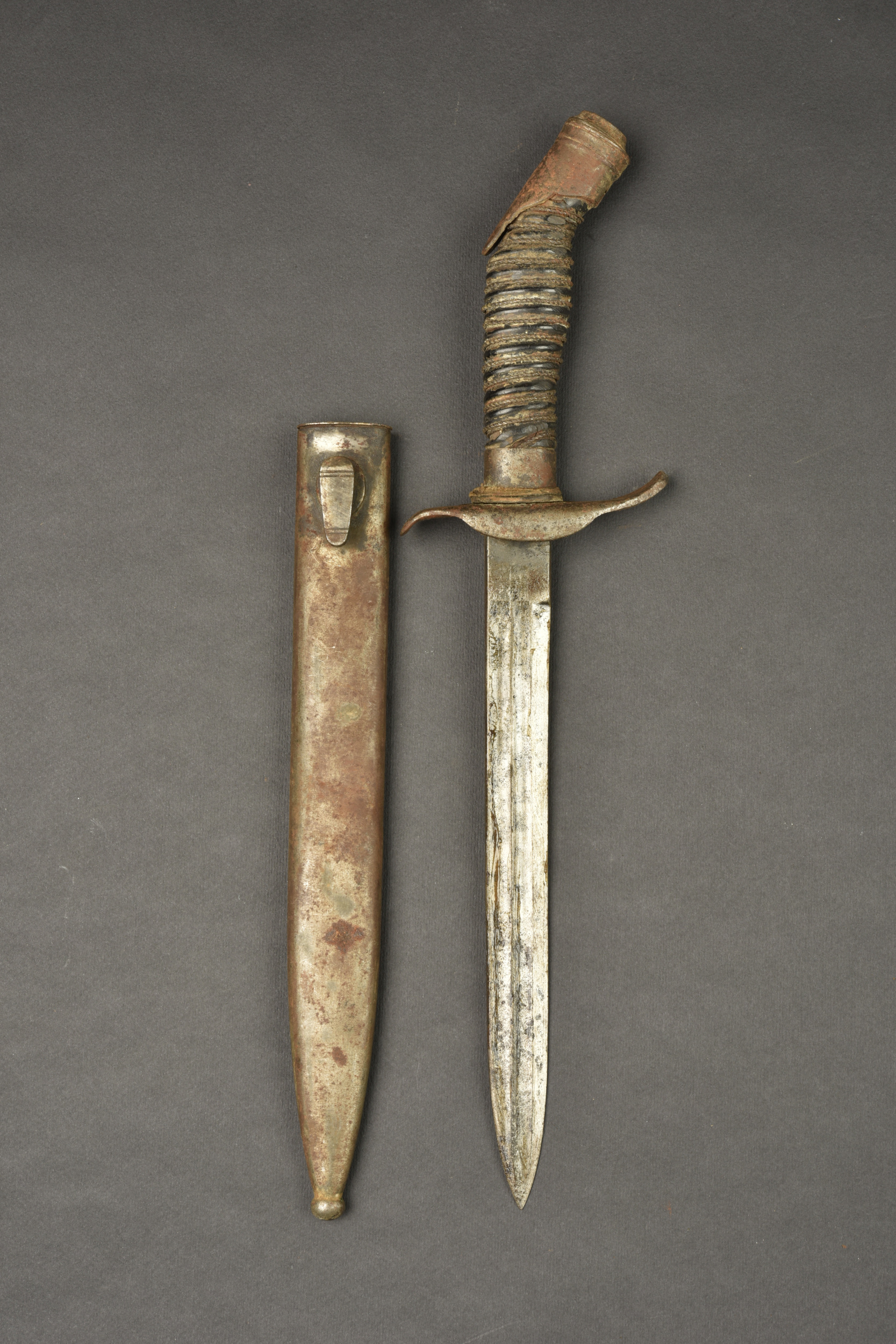 Poignard artisanal sur base d’un sabre d’officier allemand. Poignée et lame d’un sabre d’officier prussien IOD 1889 fabrication de guerre en fer, avec monogramme WRII sur le poignée. Garde retirée. Lame raccourcie, d’une longueur de 23,5 cm. Dans un fourreau fer d’une baïonnette 98K daté 1936. Usure, patine, rouille superficielle, à nettoyer