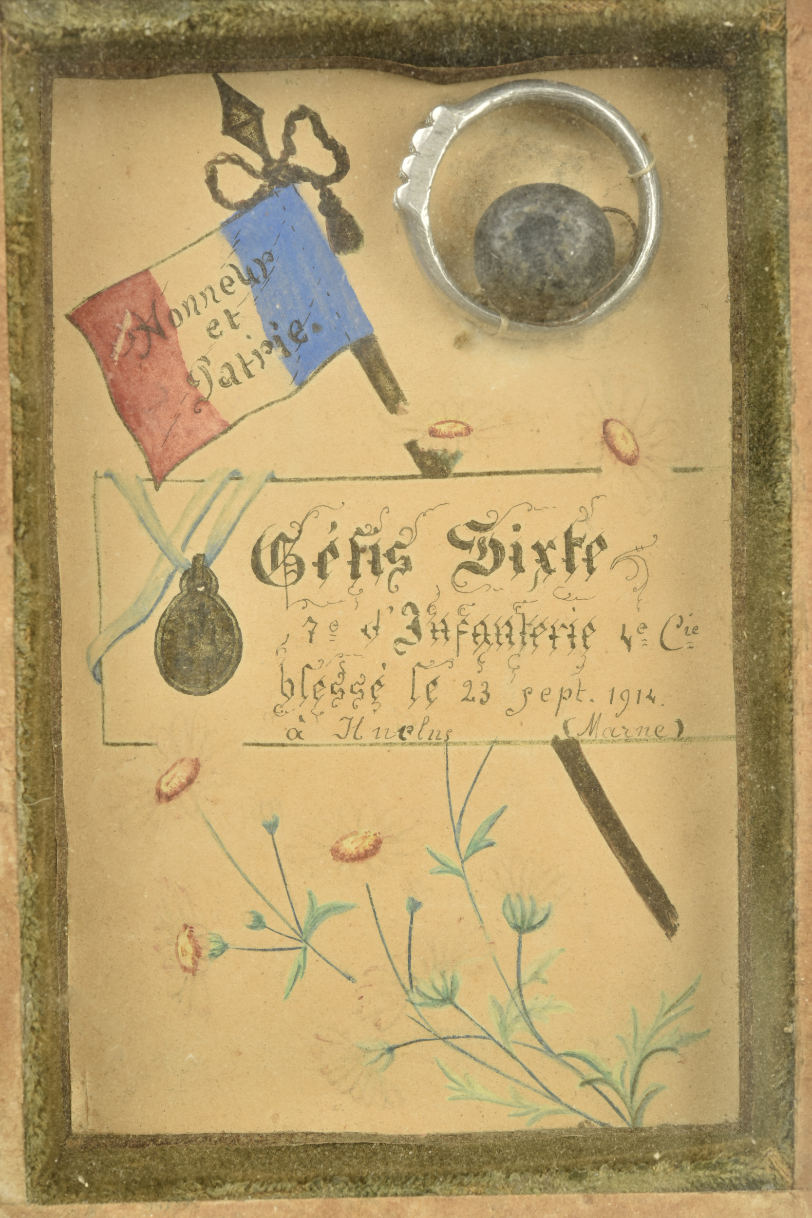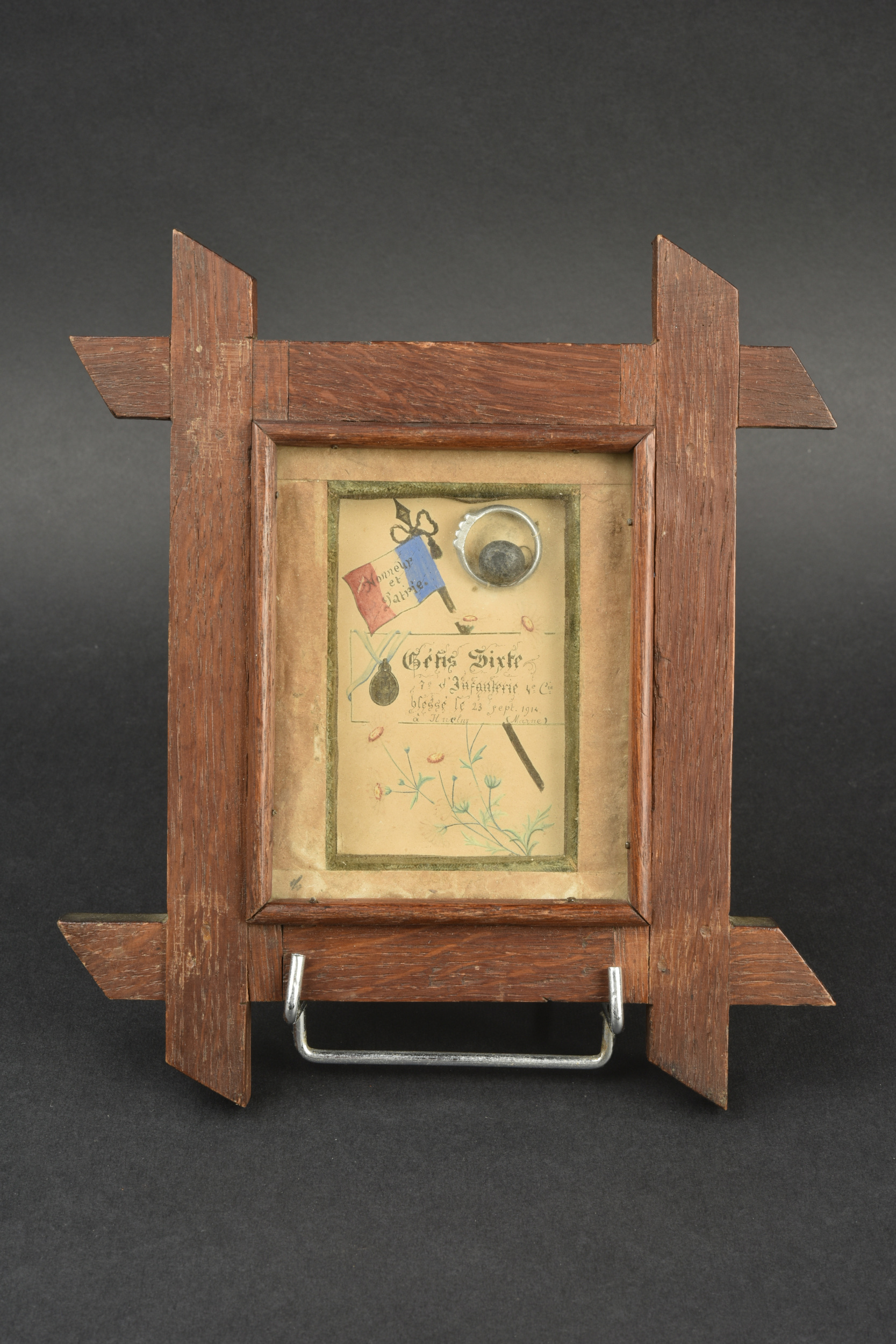 Reliquaire soldat blessé. Petit cadre contenant le shrapnel ayant blessé le soldat G.Sixte du 7ème d’infanterie, 4ème compagnie, blessé le 23 septembre 1914 à Hurlus dans la Marne. Une bague de type artisanat de tranchées entoure le shrapnel.