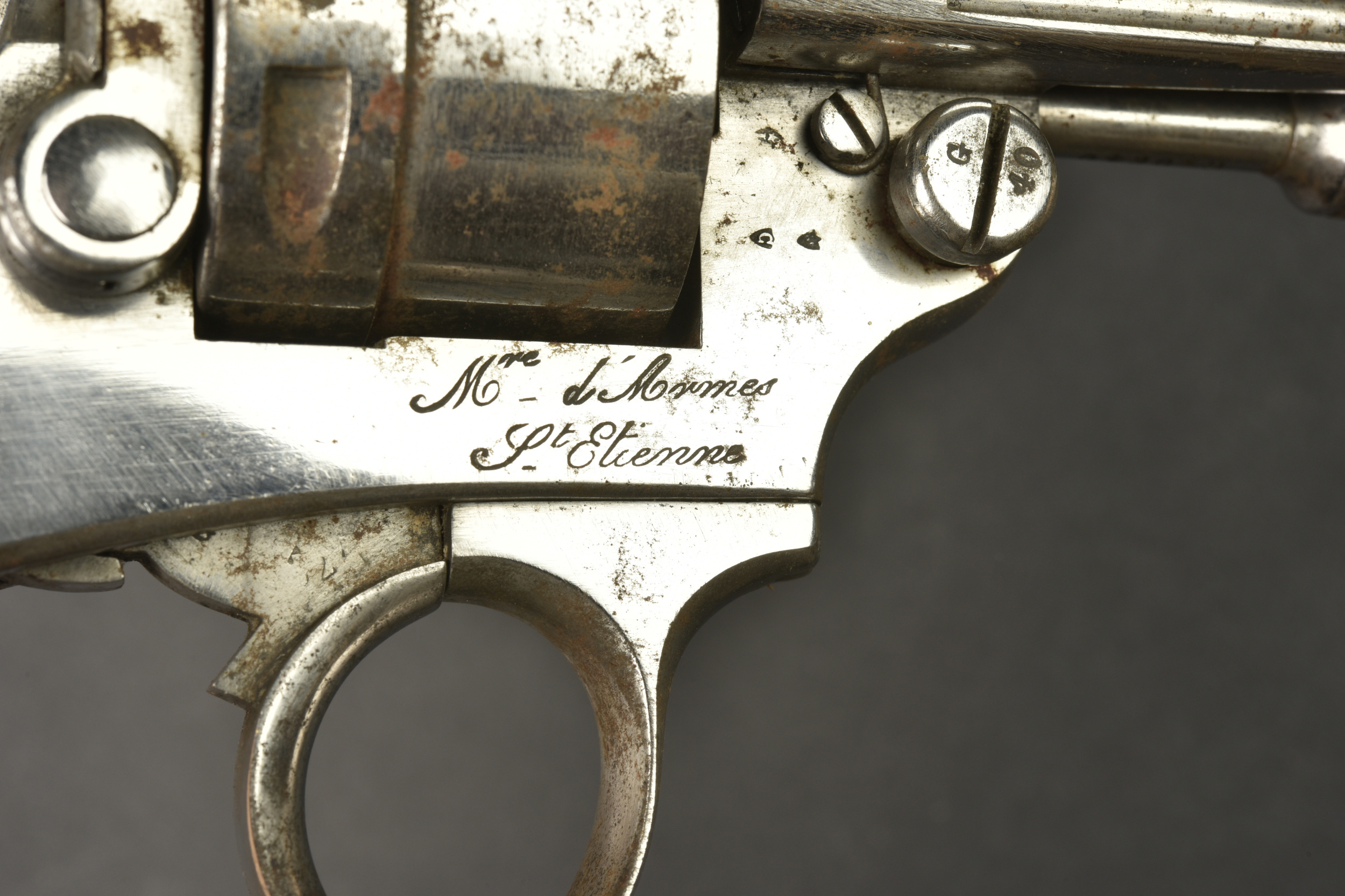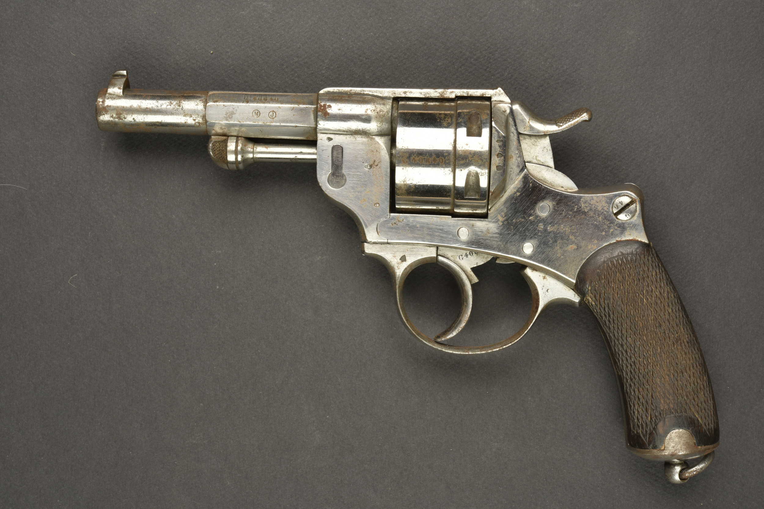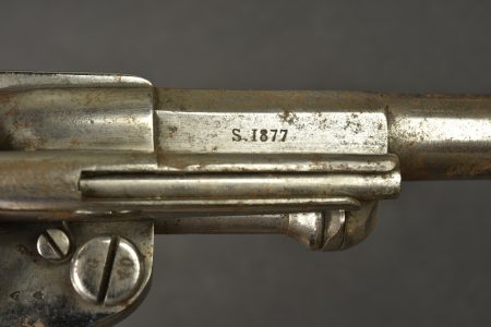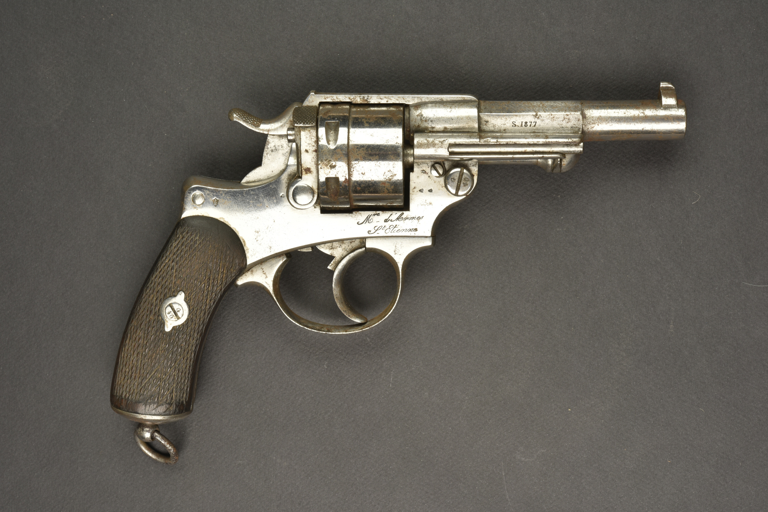 Détails de la vente >Revolver d’ordonnance modèle 1873. En acier poli, rouille superficielle facilement nettoyable. Manufacture d’armes de St Etienne, daté 1877. Toutes pièces au même numéro de série... en savoir plus