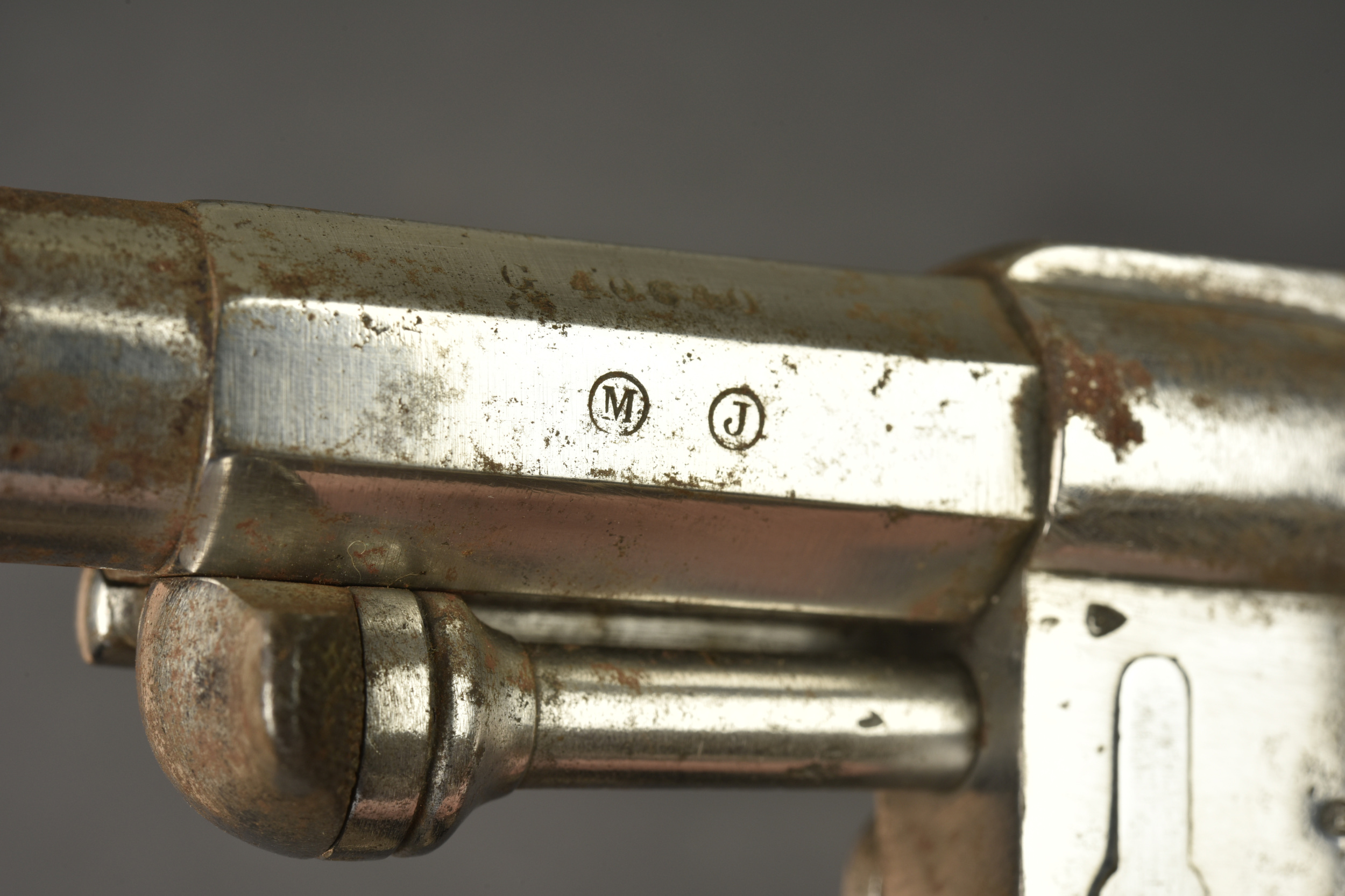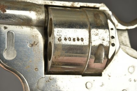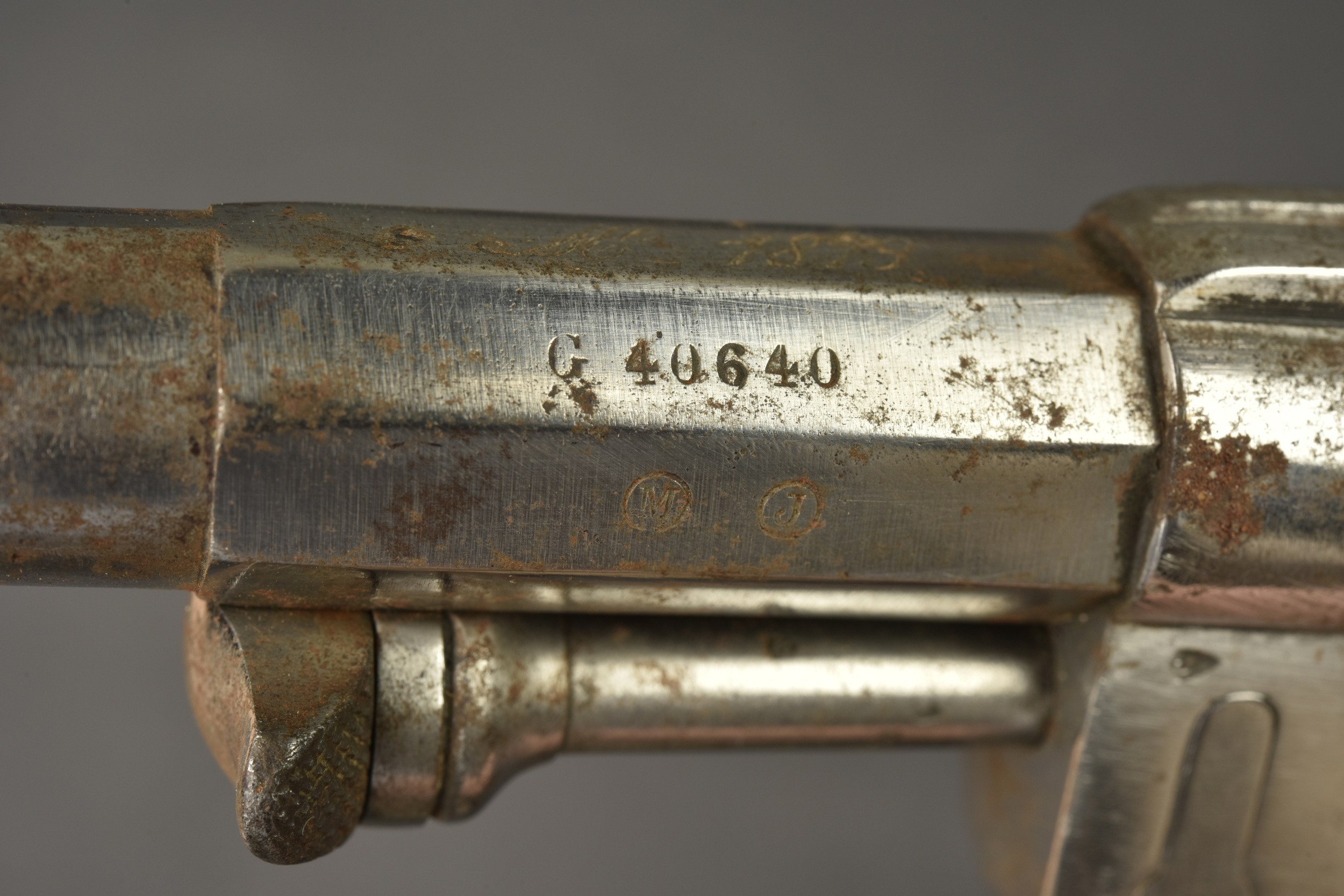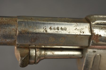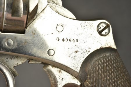 Revolver d’ordonnance modèle 1873. En acier poli, rouille superficielle facilement nettoyable. Manufacture d’armes de St Etienne, daté 1877. Toutes pièces au même numéro de série G40640. Intérieur du canon à nettoyer mais avec de belles rayures. Plaquettes en noyer avec quadrillages. Mécanisme fonctionnel. Aptitude au tir non vérifiée. Arme de Catégorie D alinéa e) modèle d’avant 1900. Vente libre aux personnes majeures, art R311-2 du Csi.