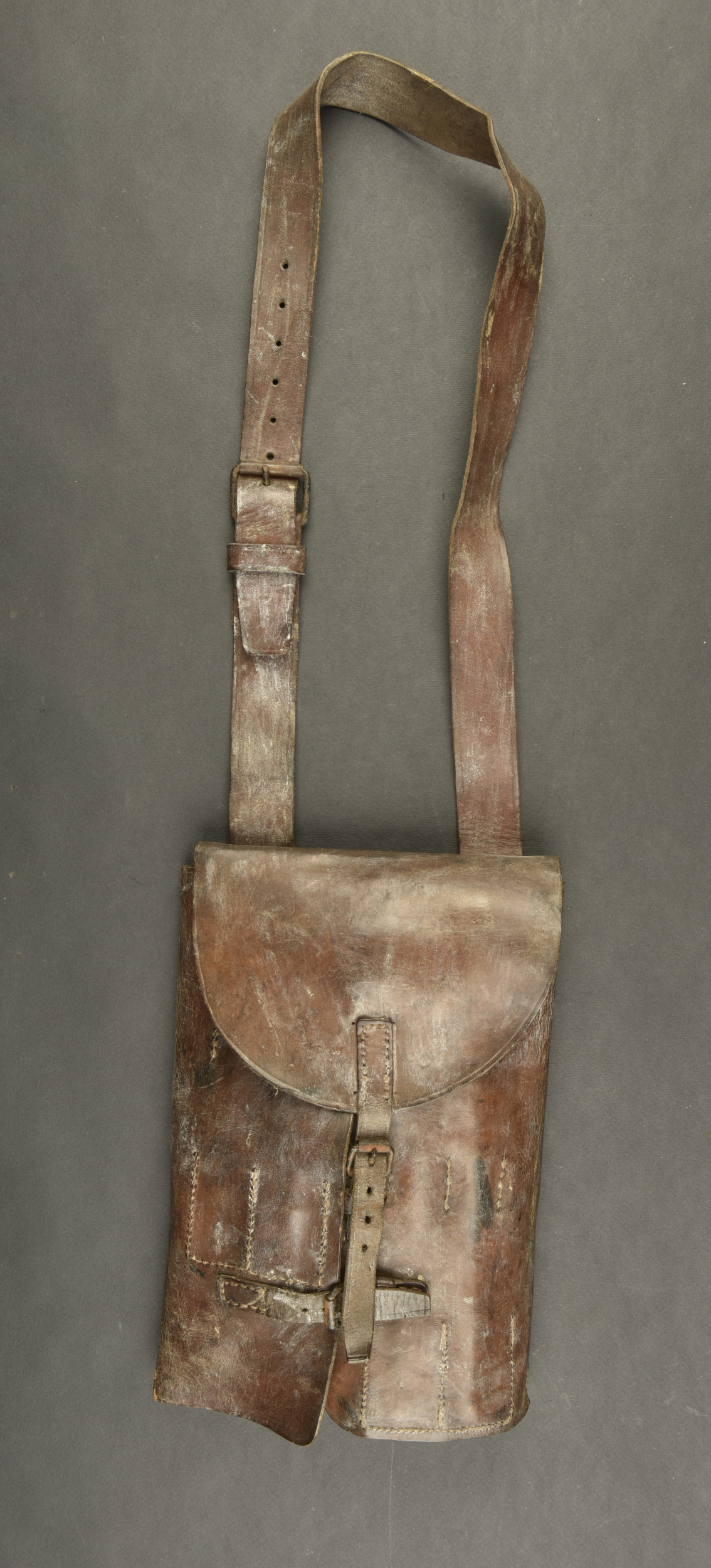Sacoche pour pistolet lance fusée français. Pour modèles 1917 et 1918. Fabriquée après 1918. En cuir marron, à 2 volets et 1 rabat. Avec ses logements internes. Sangle de transport en cuir. Pas de marquage visible Etat moyen