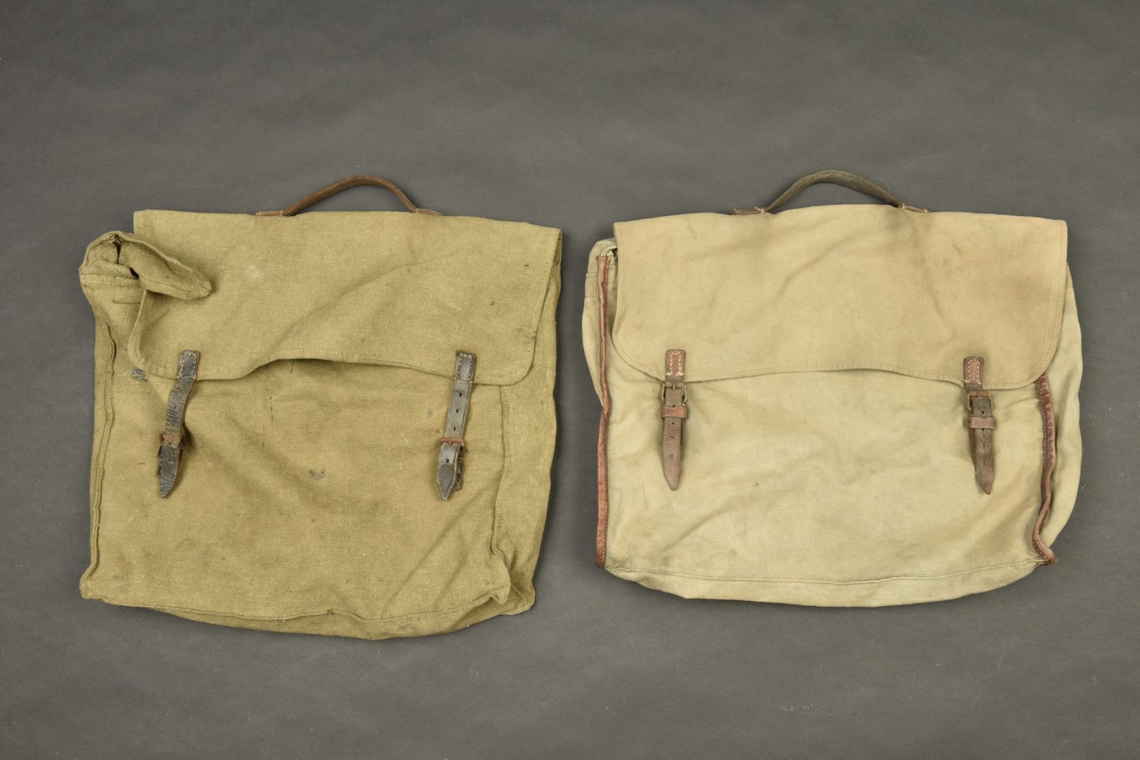 Sacoches allemande. Comprenant une sacoche en toile Feldgrau, les attaches en cuirs sont présentes. Sans marquages visibles. Une sacoche en toile grise et cuir marron, les sangles sont présentes. Sans marquages visibles. A noter une certaine usure et patine des pièces, ainsi que des tâches et accrocs. Etat II+.
