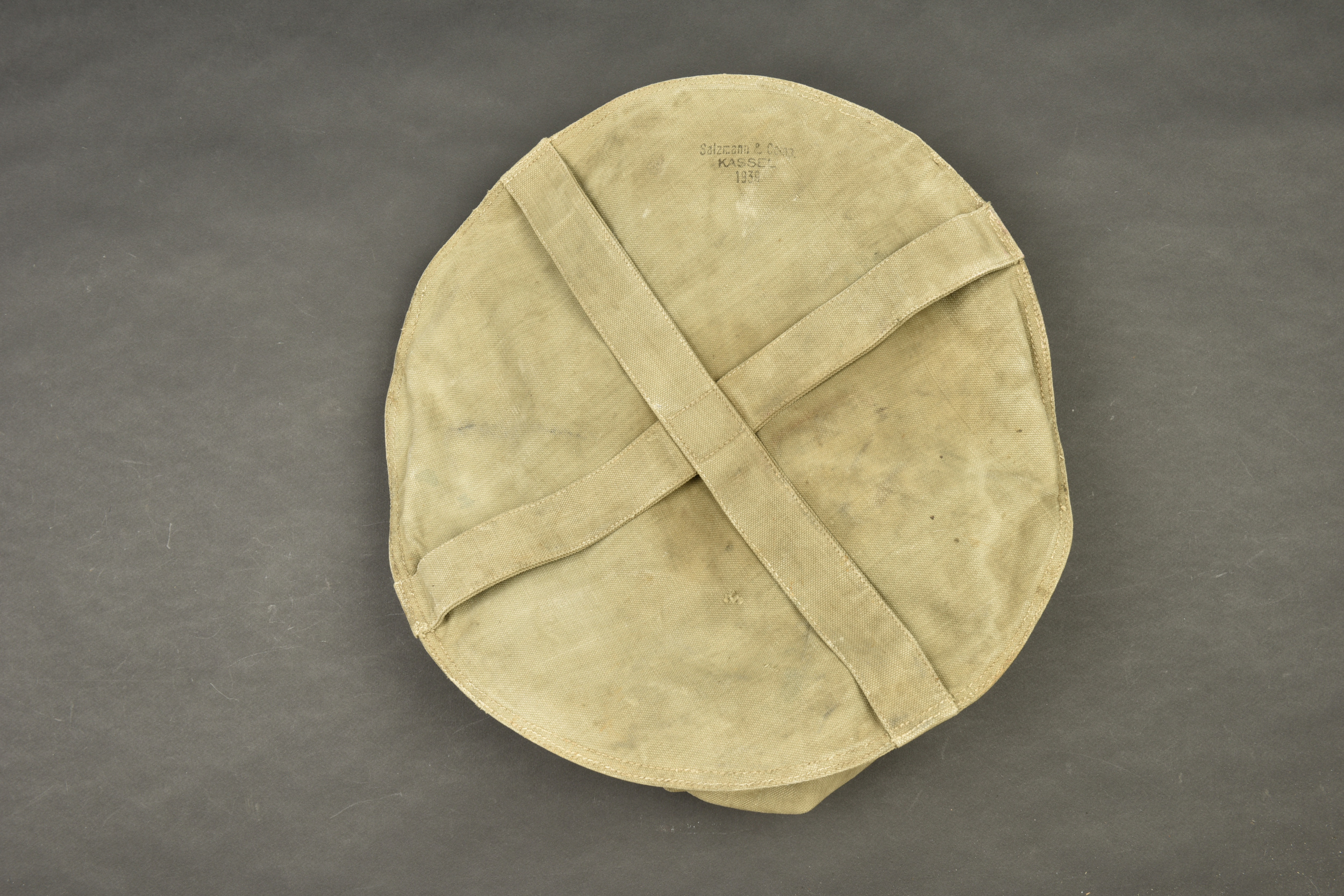 Détails de la vente >Vache à eau allemande. En épaisse toile Feldgrau. Les poignées de transport sont en bois. Fabrication Salzmann Kassel 1938. A noter une certaine usure et patine de la pièce, ainsi que quelques... en savoir plus