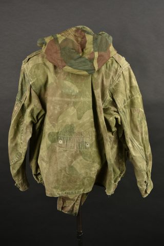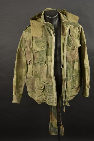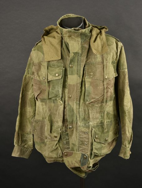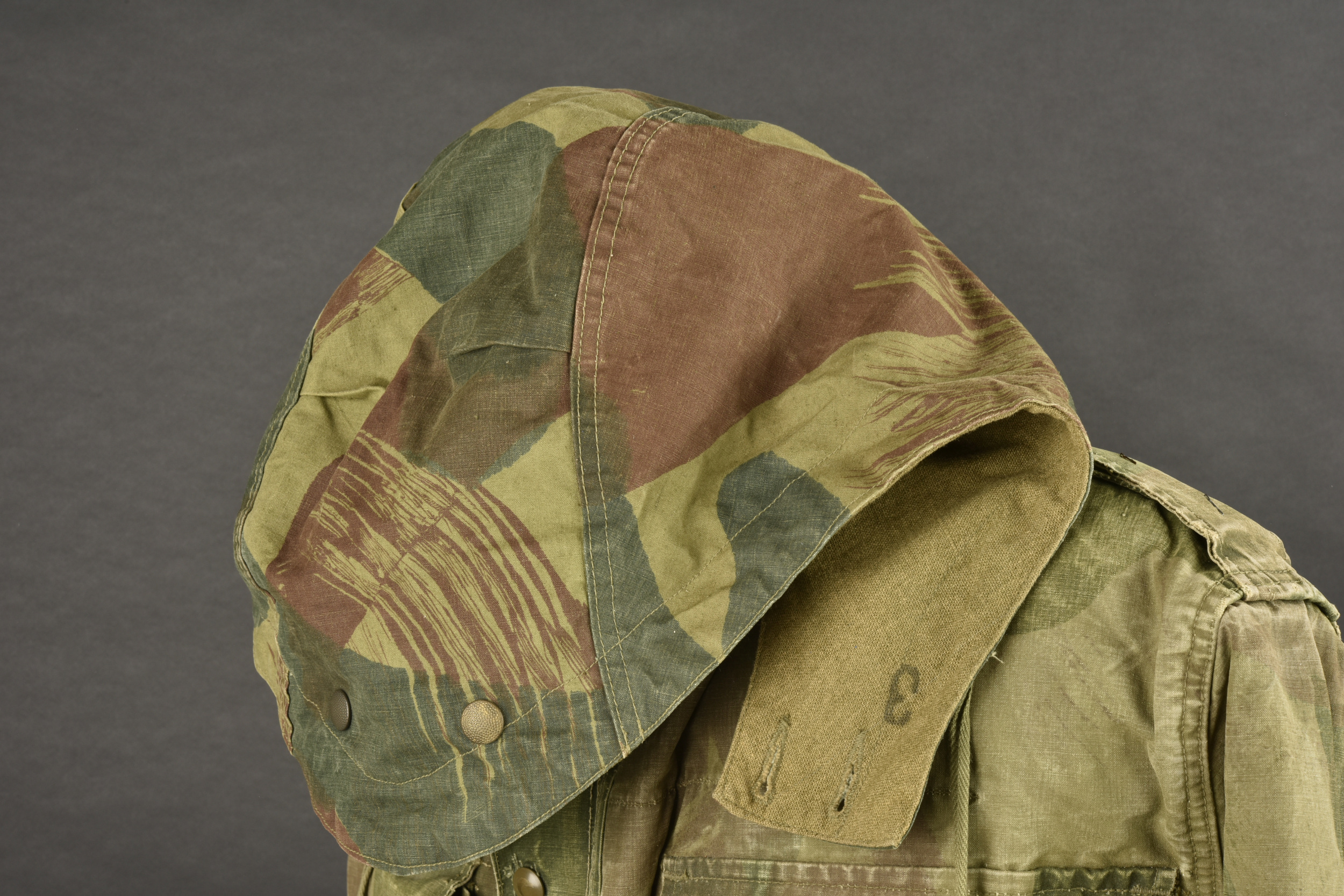 Veste de commando parachutiste belge type Denison Smock. Veste camouflée type Denison Smock avec queue de castor. Modèle avec fermeture des poches par boutons pression. Etiquette ABL 1956. Fermeture éclair fonctionnelle. Usure d’usage, légèrement délavée. Avec une capuche camouflée.
