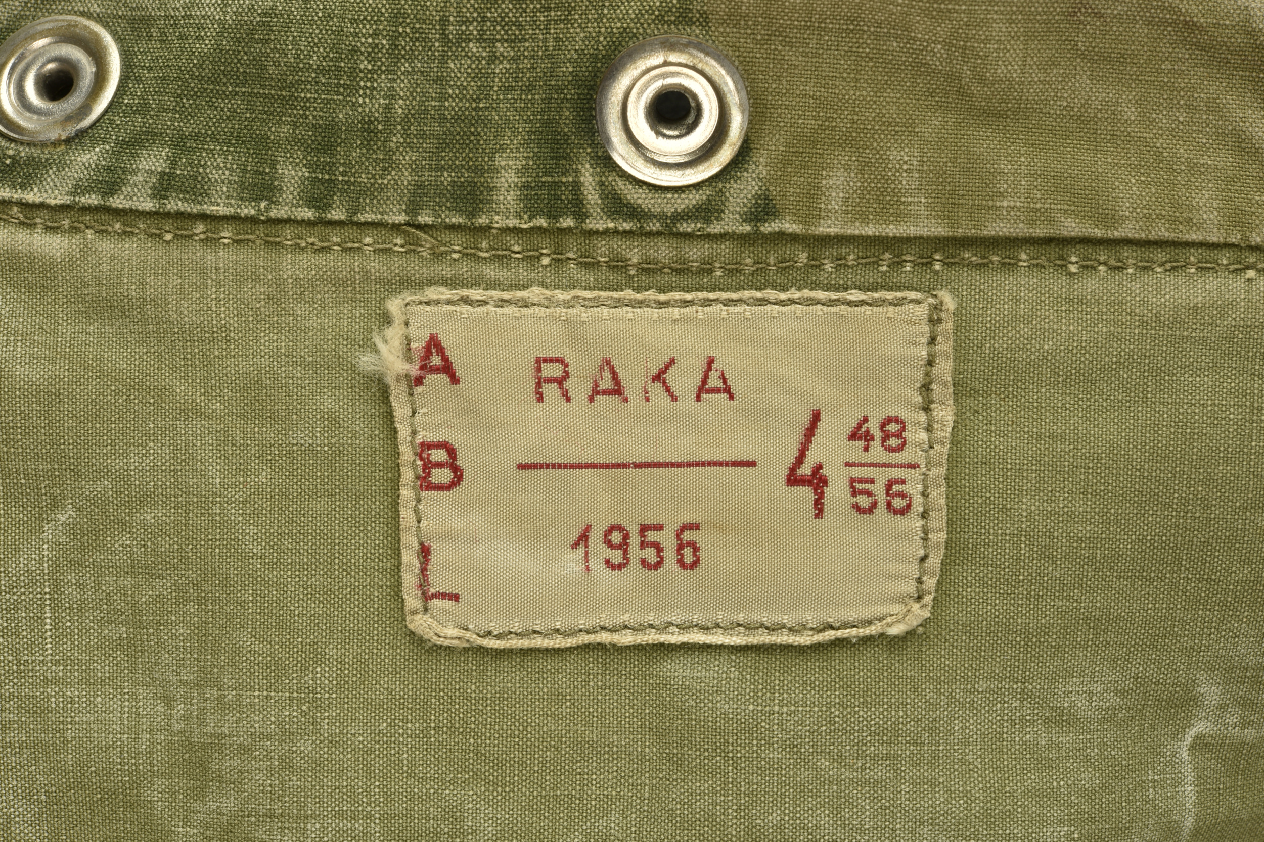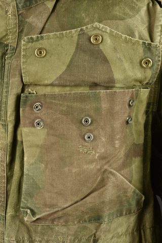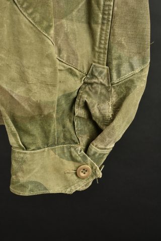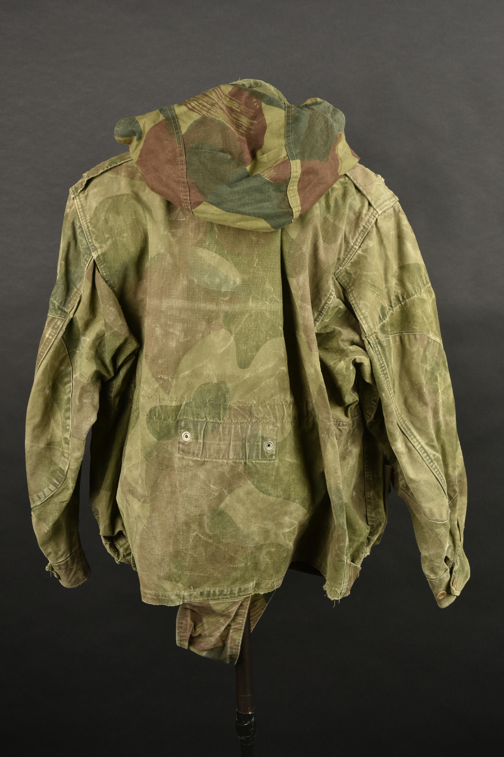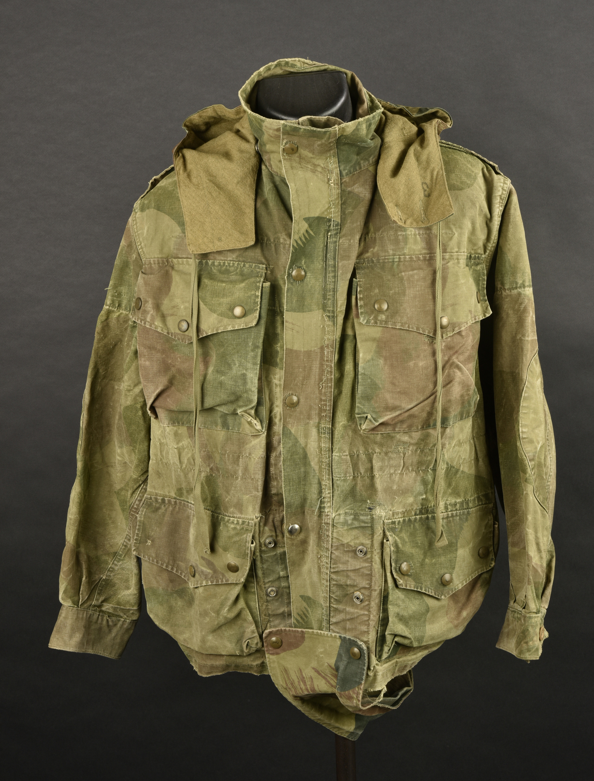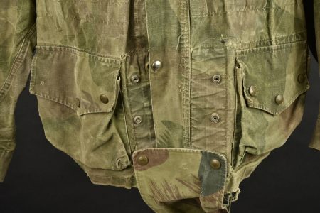 Détails de la vente >Veste de commando parachutiste belge type Denison Smock. Veste camouflée type Denison Smock avec queue de castor. Modèle avec fermeture des poches par boutons pression. Etiquette ABL 1956.... en savoir plus