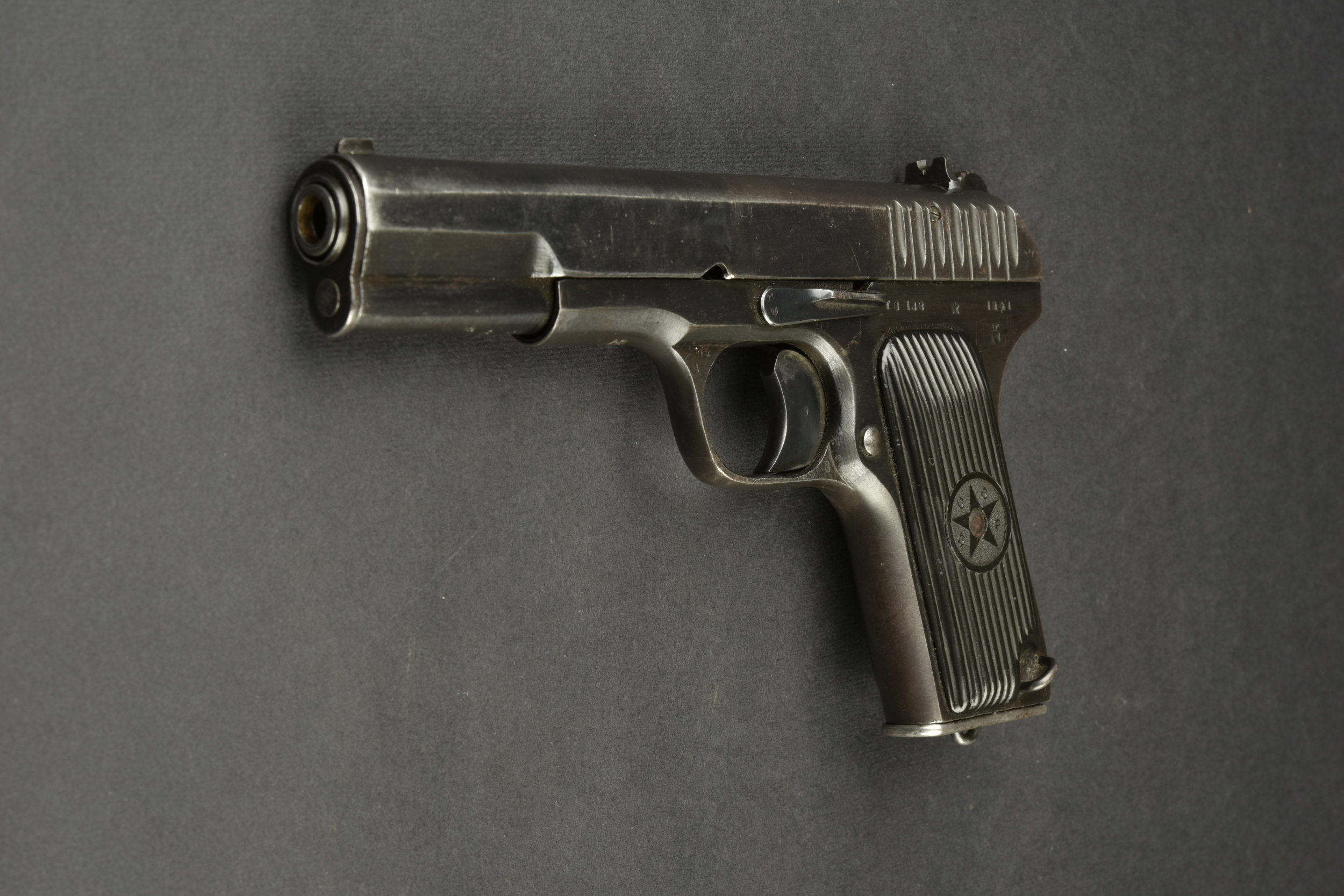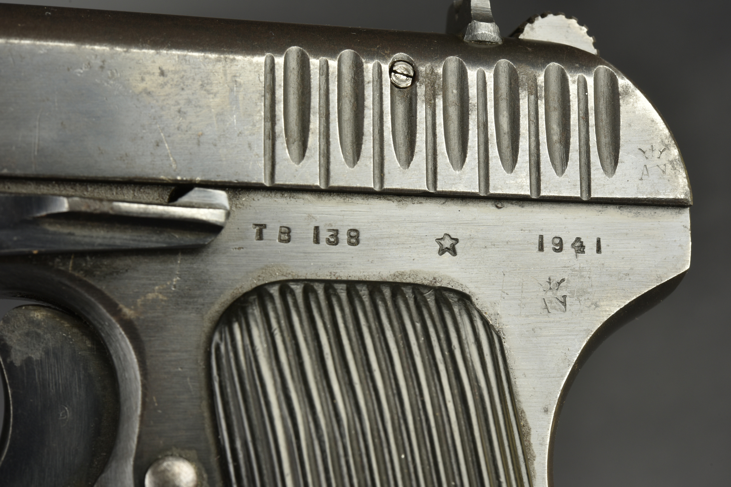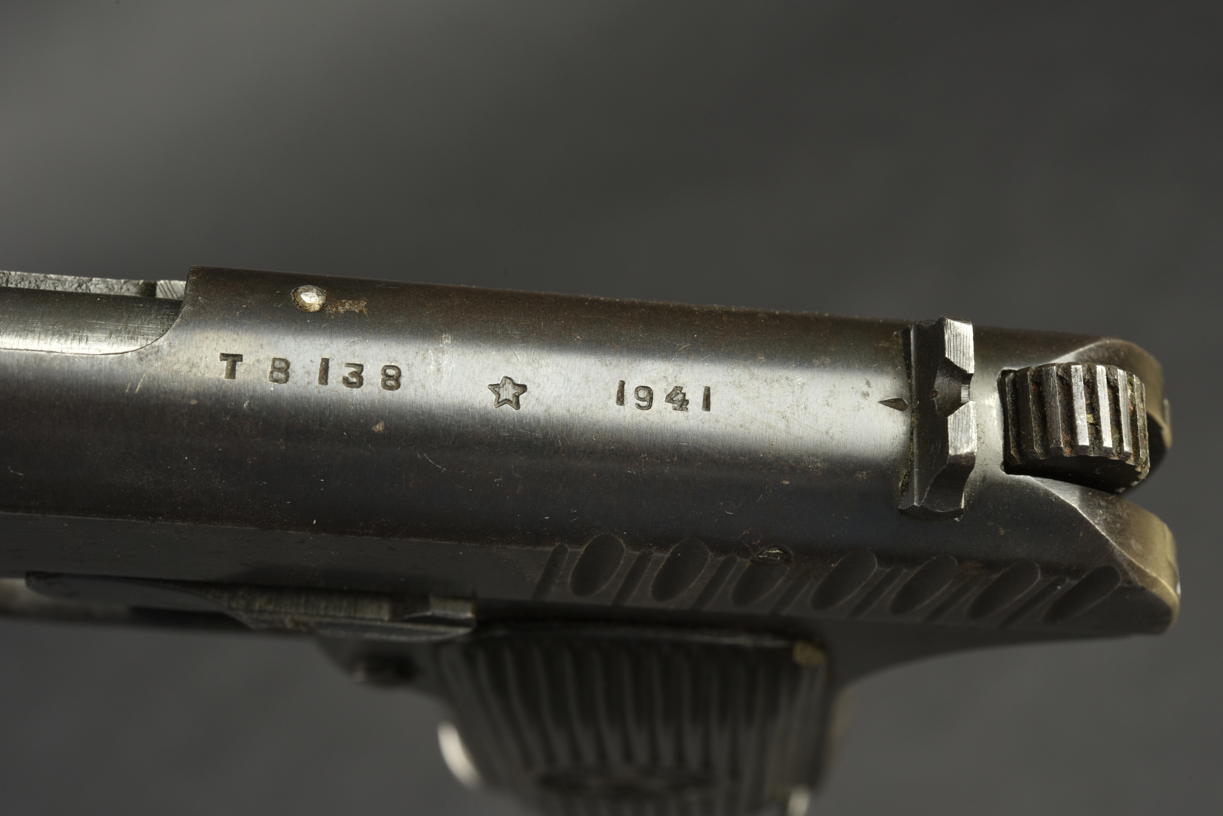 Pistolet TT33. Bronzage à 80%. Plaquette en bakélite noire. Chargeur bloqué par la neutralisation. Culasse rendue mobile par une neutralisation +. Daté 1941. Numéro TB 138. Catégorie C9.... en savoir plus