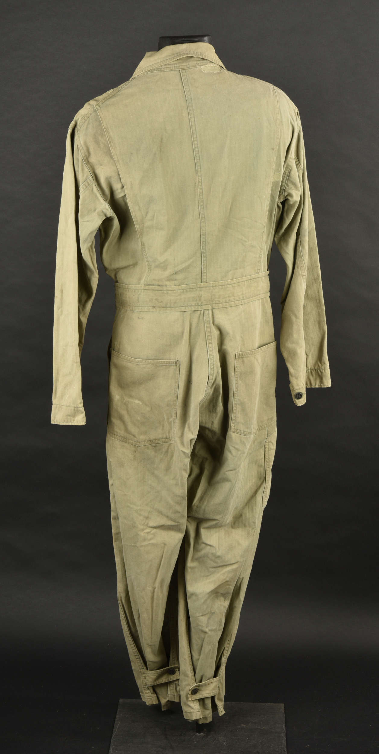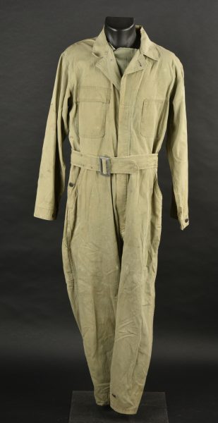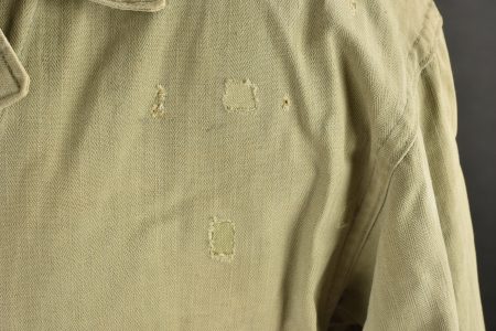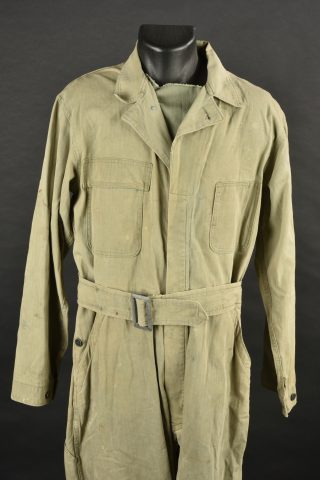 Combinaison HBT. En tissu coton OD 3 HBT. Tous les boutons ont présents. Les couleurs sont passées par le soleil. La bavette anti-gaz est d’une couleur différente par rapport au reste de l’uniforme. La ceinture est présente. Etiquette fabricant absente. A noter une certaine usure et patine de la pièce, ainsi que des tâches, accrocs et réparations. Etat II-.
