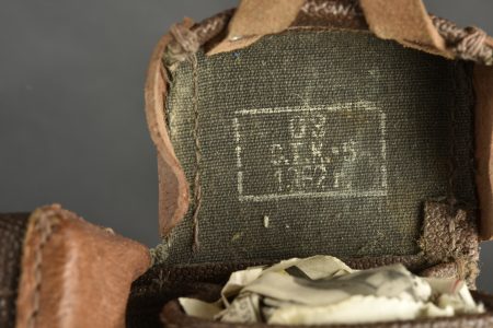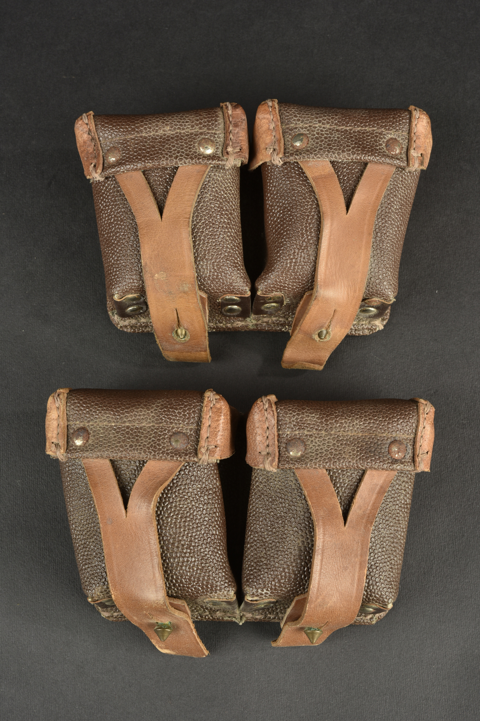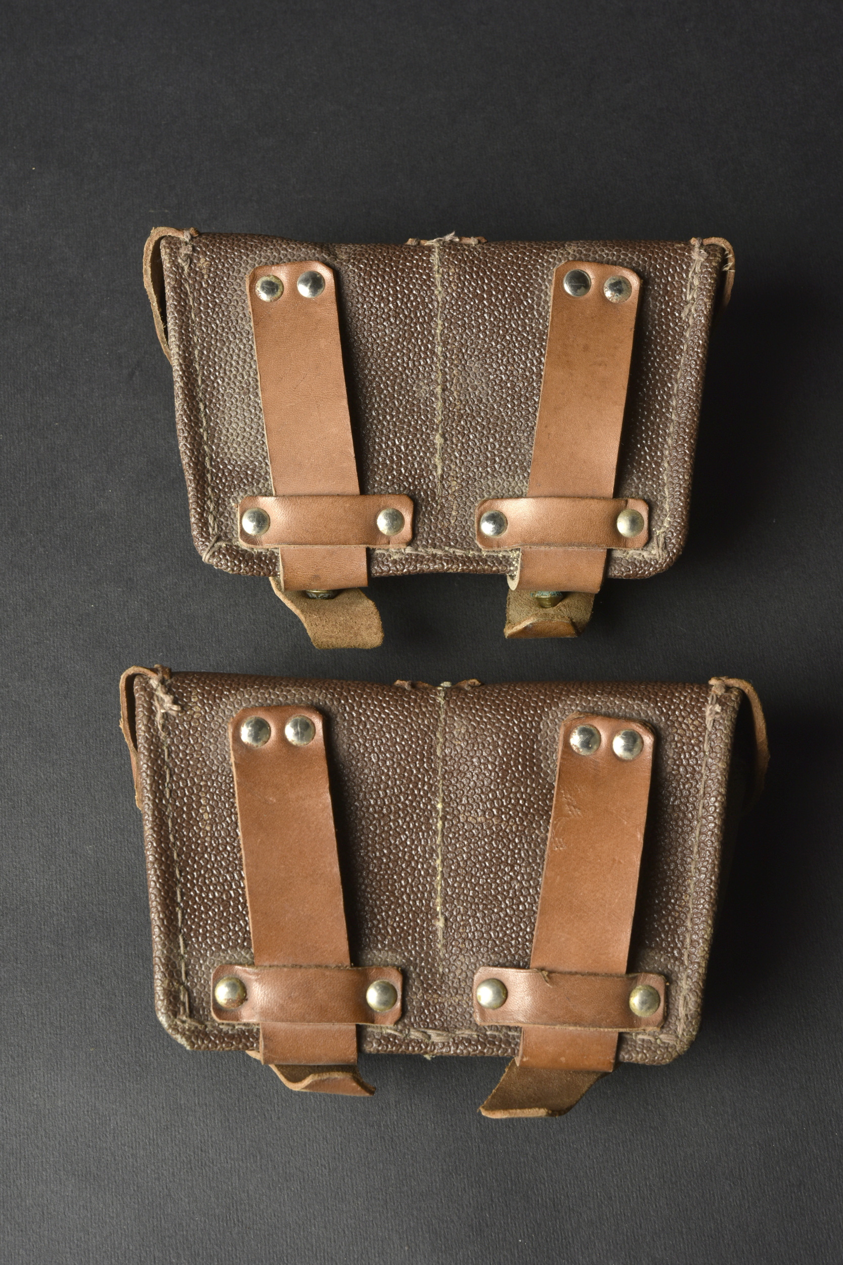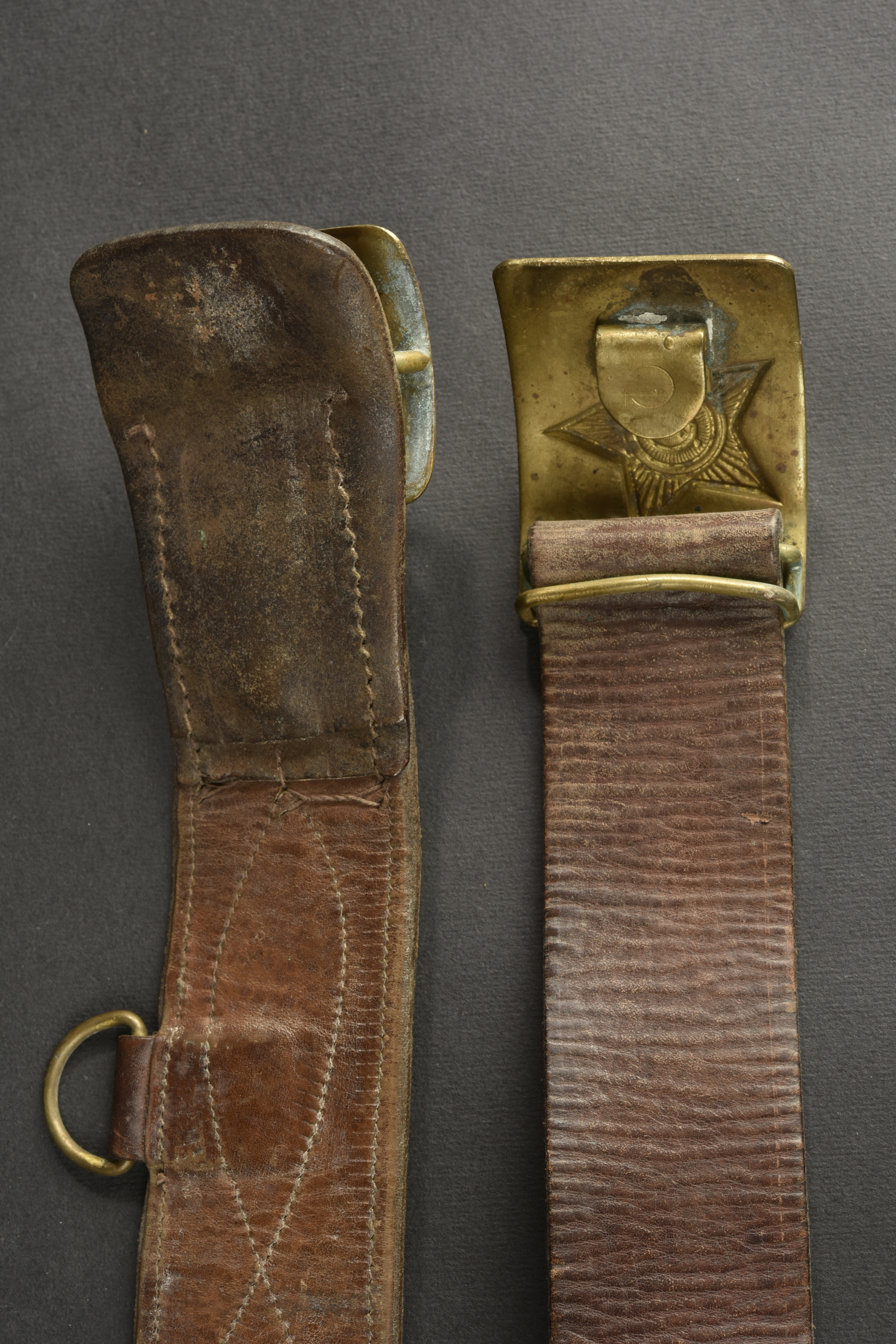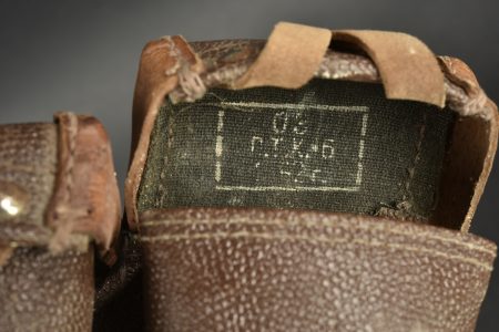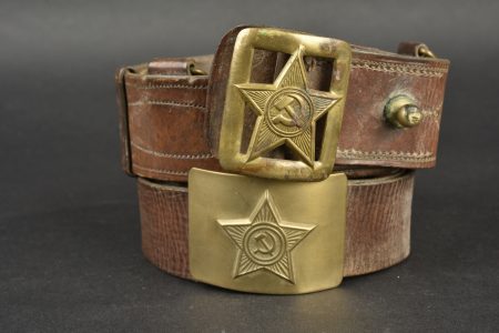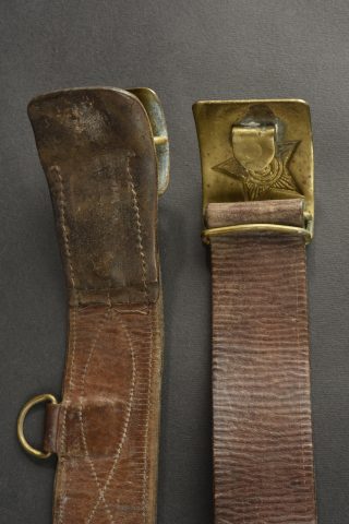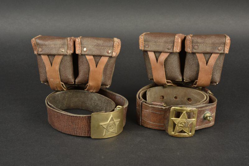 Accessoires russe. Comprenant deux ceinturon en cuir, et deux modèles différentes de boucle de ceinturon en laiton. Sans marquages visibles. Une paire de cartouchière en cuir bicolore. Les marquages sont illisibles. A noter une certaine usure et patine des pièces. Etat II+.