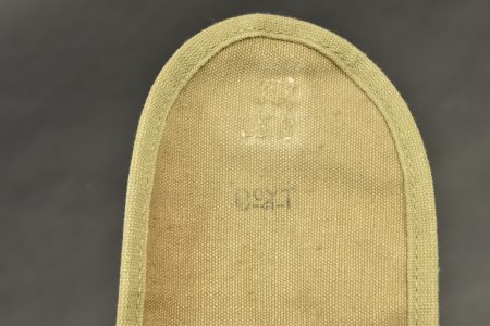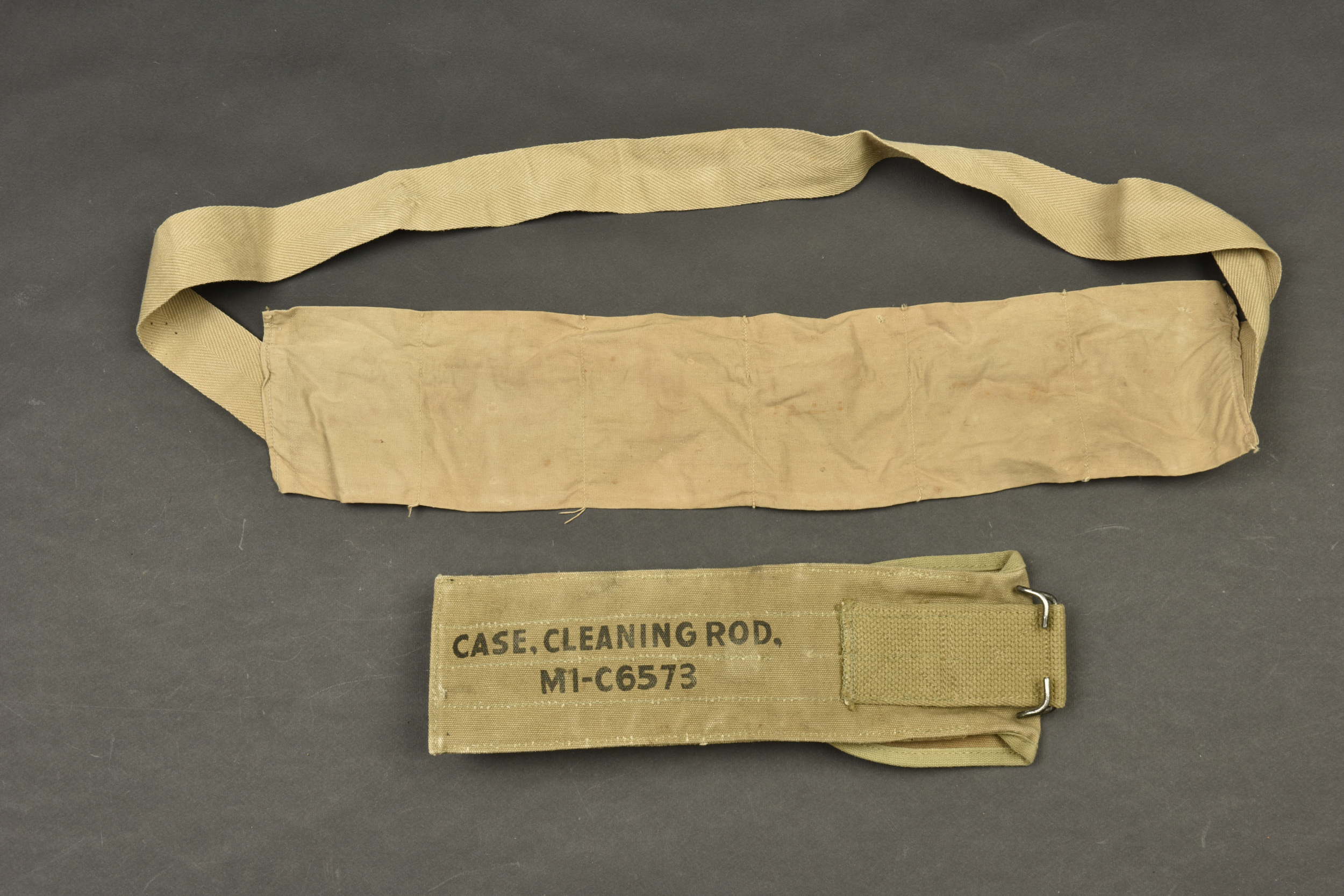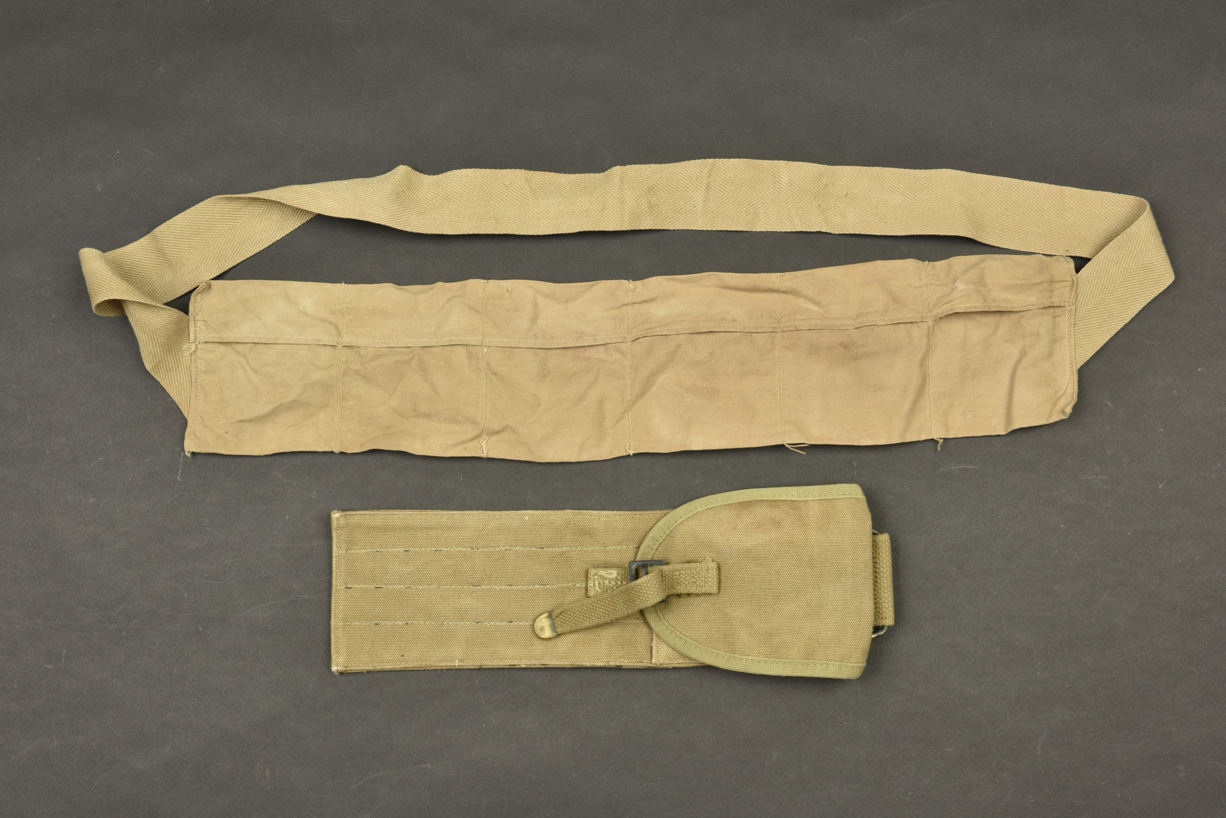 Accessoires US. Comprenant une housse pour accessoires de nettoyage de mitrailleuse de 30, en forte toile OD, le crochet de fixation au ceinturon est présent, vide. Marquée Case Cleaning prod M1-C6573. Un bandoleer en toile beige, complet, sans marquages visibles. A noter une certaine usure et patine des pièces. Etat II+.