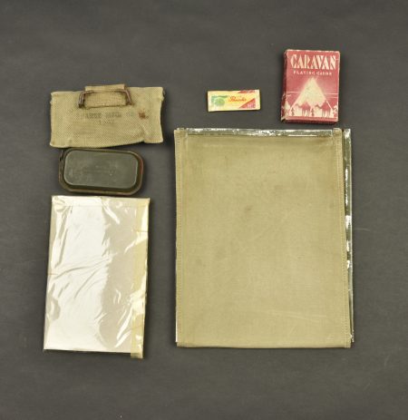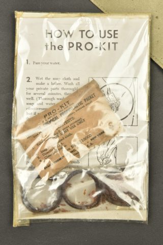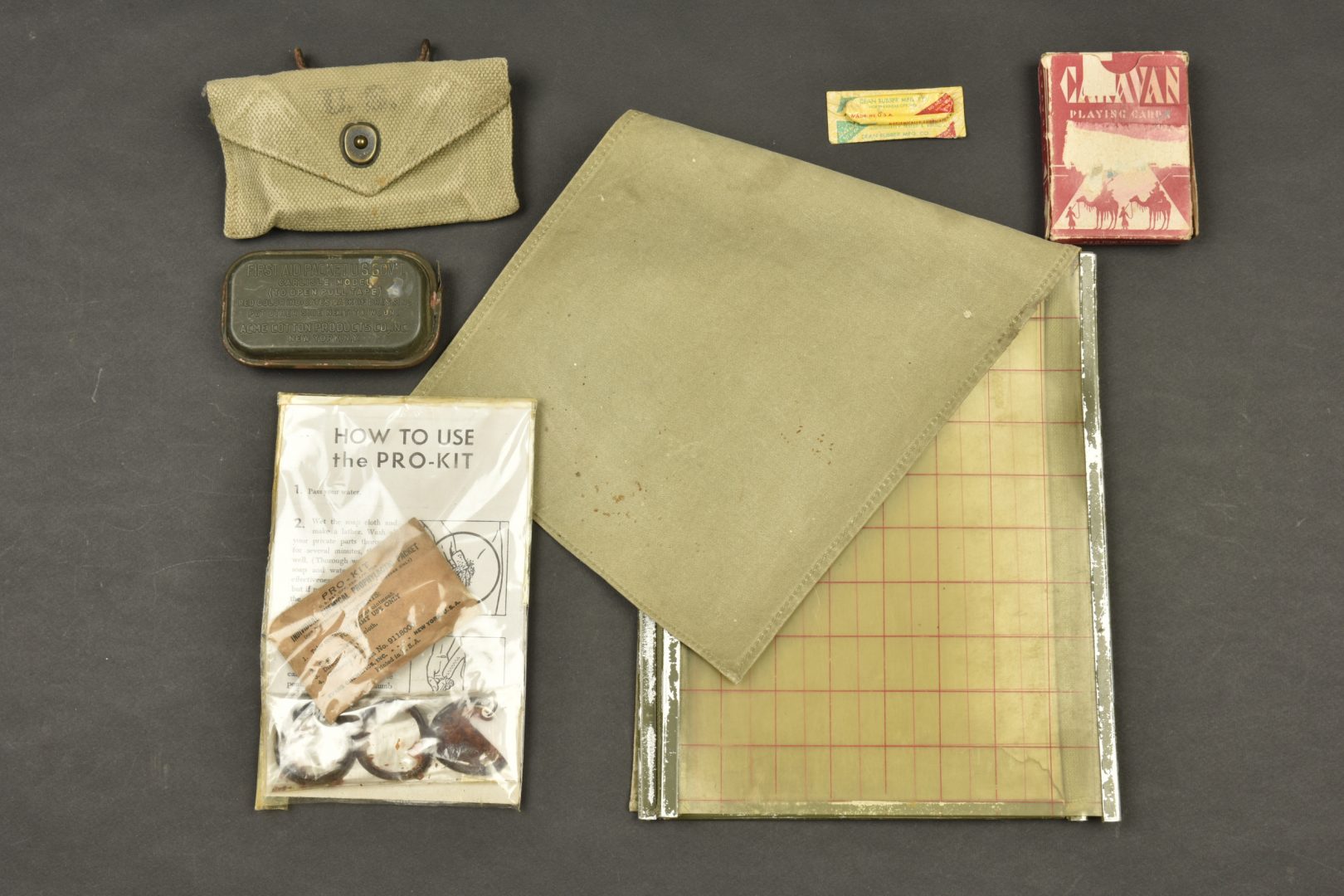 Accessoires US. Comprenant trois préservatifs de fouille. Un sachet complet, marqué Pro Kit Individual Chemical Prophylatic Packet. Un jeu de carte Caravan, nombreuses réparations au scotch.... en savoir plus