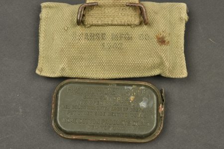Accessoires US. Comprenant trois préservatifs de fouille. Un sachet complet, marqué Pro Kit Individual Chemical Prophylatic Packet. Un jeu de carte Caravan, nombreuses réparations au scotch. Une planche en mica et toile kaki, pour les portes carte US. Un préservatif dans son emballage d’origine. Une pochette pour pansement en forte toile OD, le crochet de fixation au ceinturon est présent. Fabrication illisible, bouton pression fonctionnel, reste de marquage US sur le rabat. Un pansement dans sa boite en métal kaki. A noter une certaine usure et patine des pièces. Etat II+.