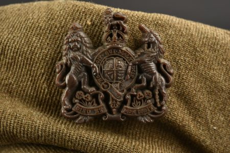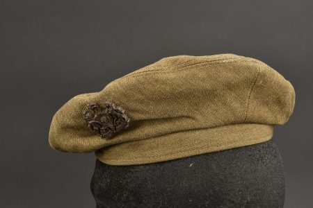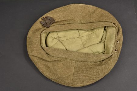 Béret du General Service Corps. En tissu coton marron. Cap badge en plastique du General Service Corps, première version. Intérieur doublé en tissu kaki. Sans marquages visibles. Deux œillets d’aération. A noter une certaine usure et patine de la pièce, ainsi que quelques tâches. Etat II+.