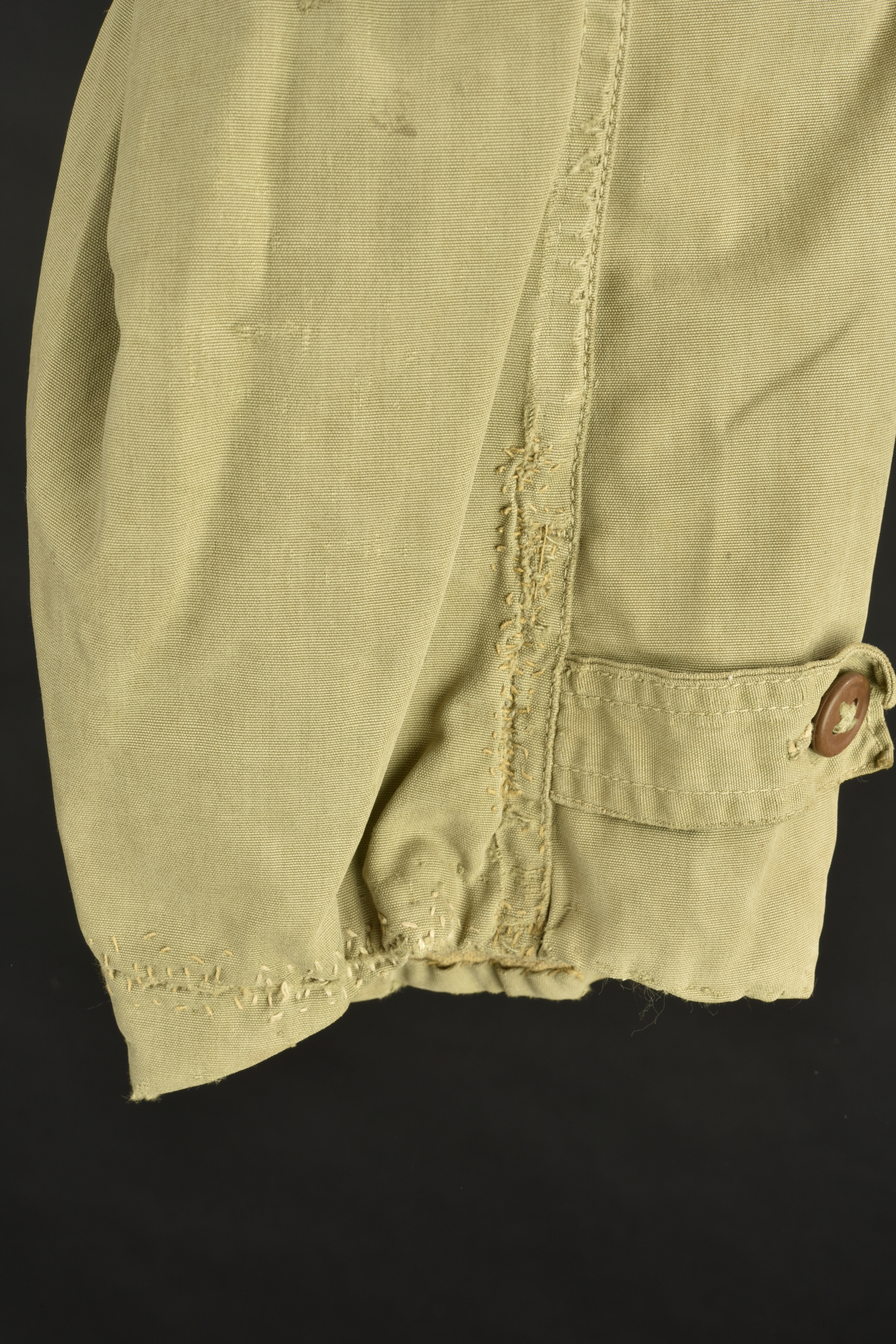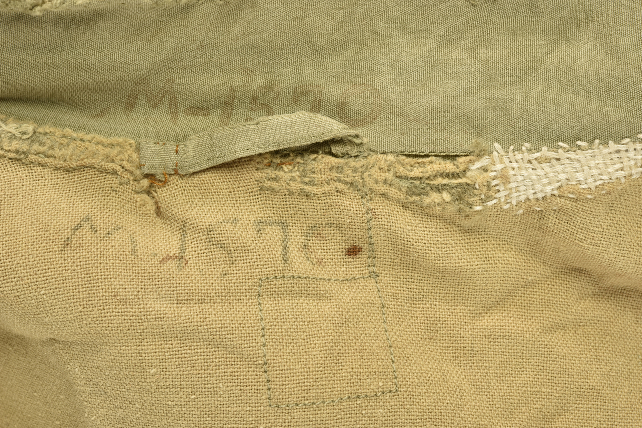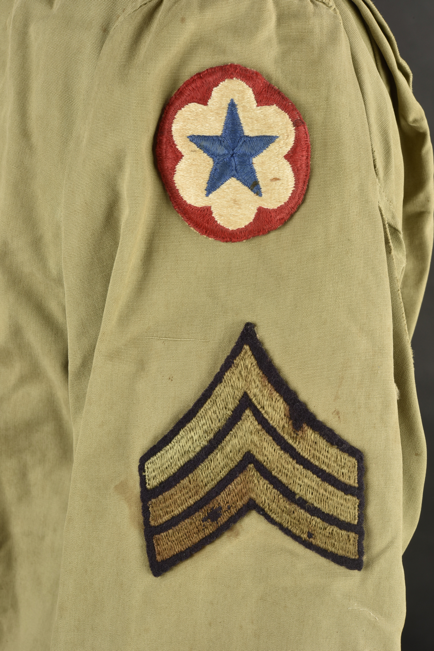Blouson M-41 de l’Army Services Forces. En popeline kaki. La majorité des boutons sont présents. Fermeture éclaire fonctionnelle, fabrication Talon. Indication nominative Morris, présente au bas de la veste. Grade de Sergent cousu main au niveau des manches. Insigne de l’Army Services Forces, également cousu main au niveau de la manche gauche. Intérieur doublé en drap écru. Nombreux laundry numbers visibles au niveau du col et de la boutonnière, M-1570. Trace d’une étiquette au niveau du col. Etiquette fabricant absente. A noter de nombreuses marques d’usures et tâches sur l’ensemble de la pièce, ainsi que des réparations visiblement d’époque. Etat II+.