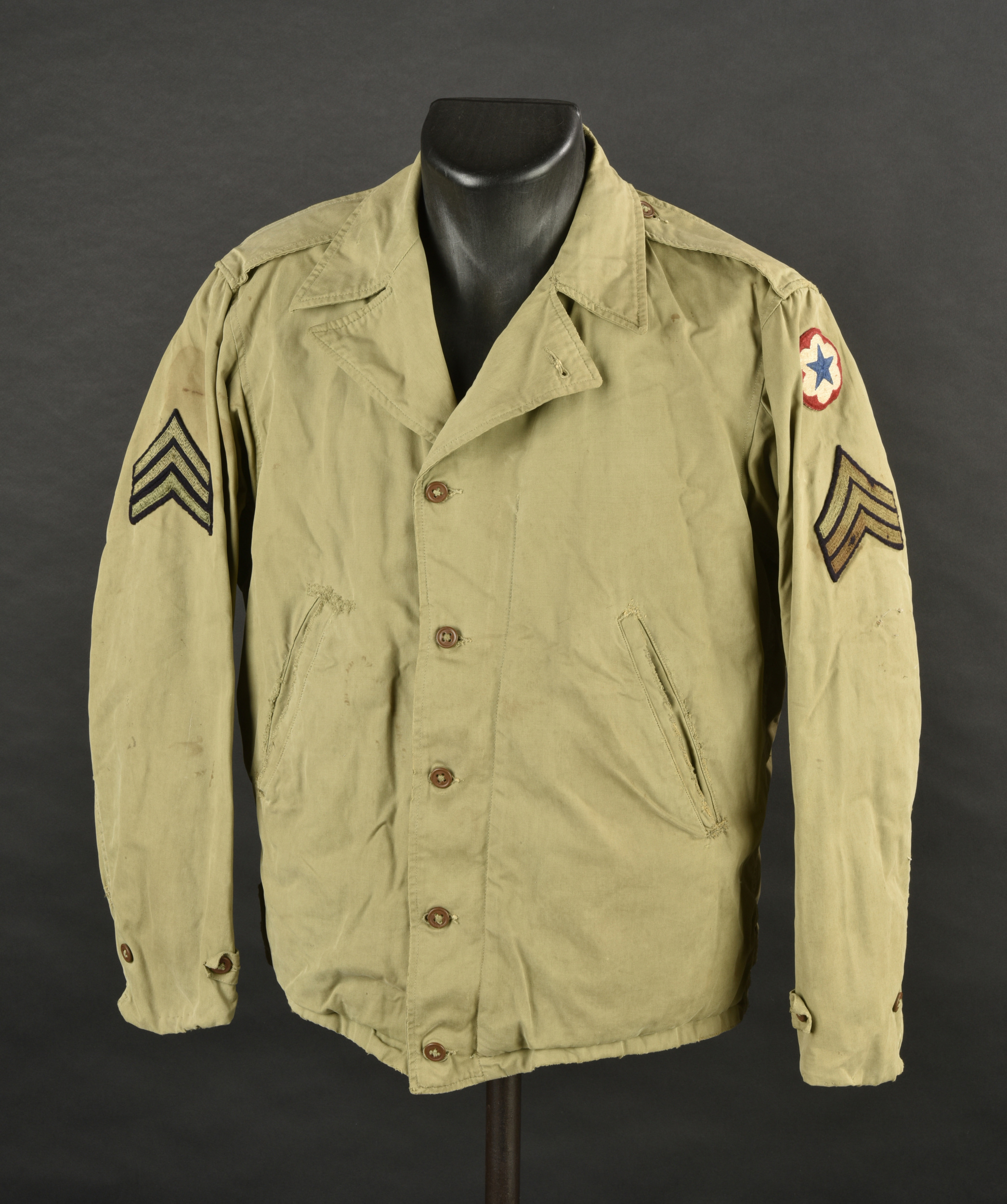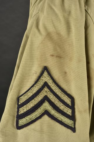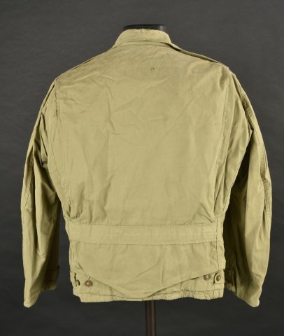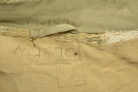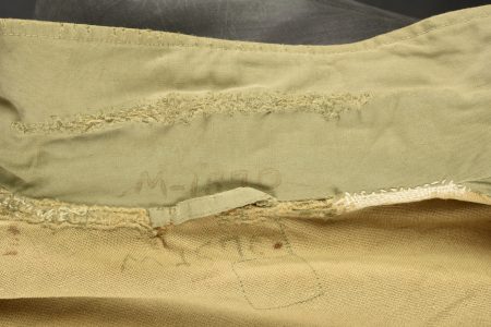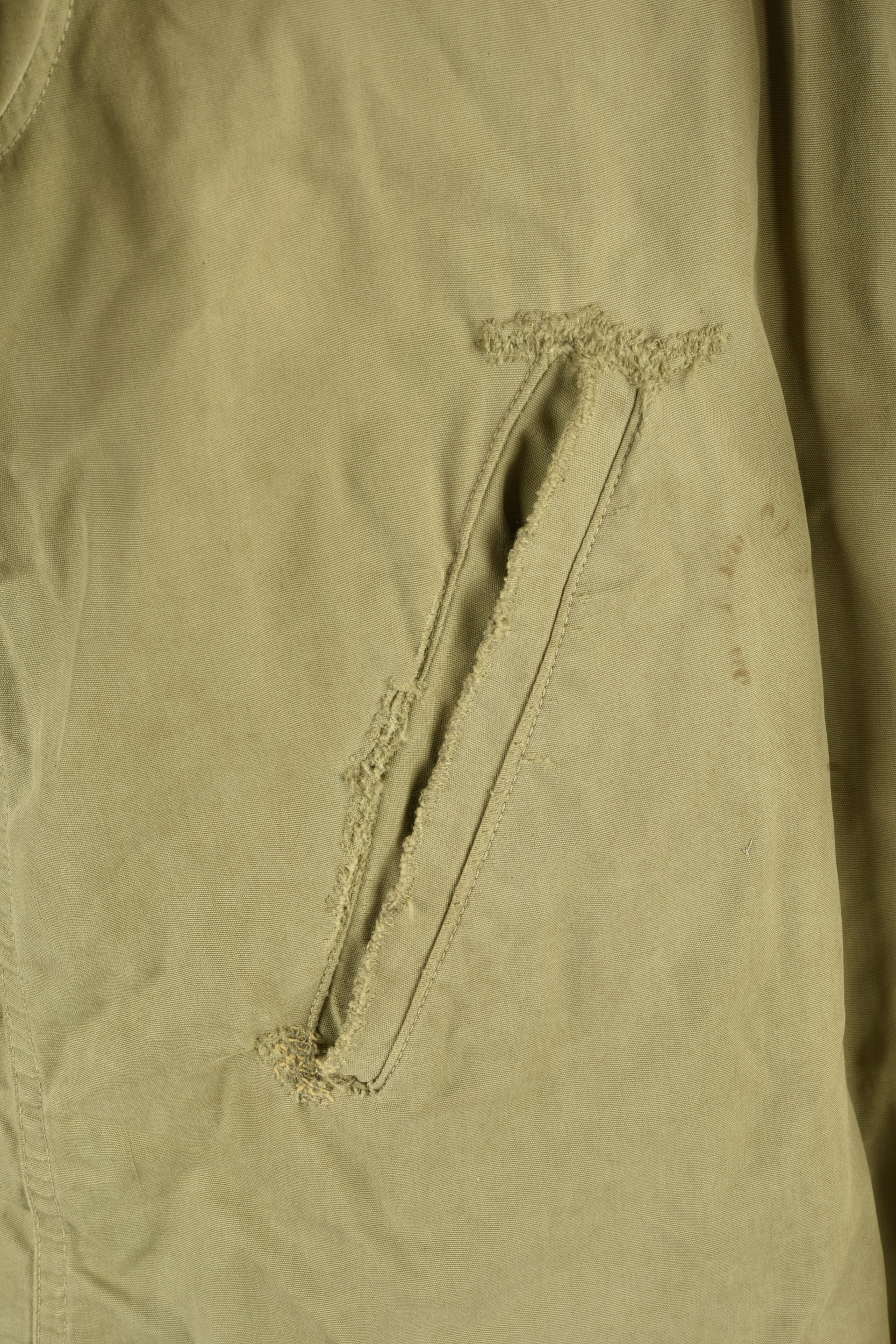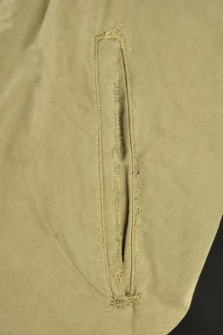 Blouson M-41 de l’Army Services Forces. En popeline kaki. La majorité des boutons sont présents. Fermeture éclaire fonctionnelle, fabrication Talon. Indication nominative Morris, présente au bas de la veste. Grade de Sergent cousu main au niveau des manches. Insigne de l’Army Services Forces, également cousu main au niveau de la manche gauche. Intérieur doublé en drap écru. Nombreux laundry numbers visibles au niveau du col et de la boutonnière, M-1570. Trace d’une étiquette au niveau du col. Etiquette fabricant absente. A noter de nombreuses marques d’usures et tâches sur l’ensemble de la pièce, ainsi que des réparations visiblement d’époque. Etat II+.