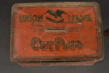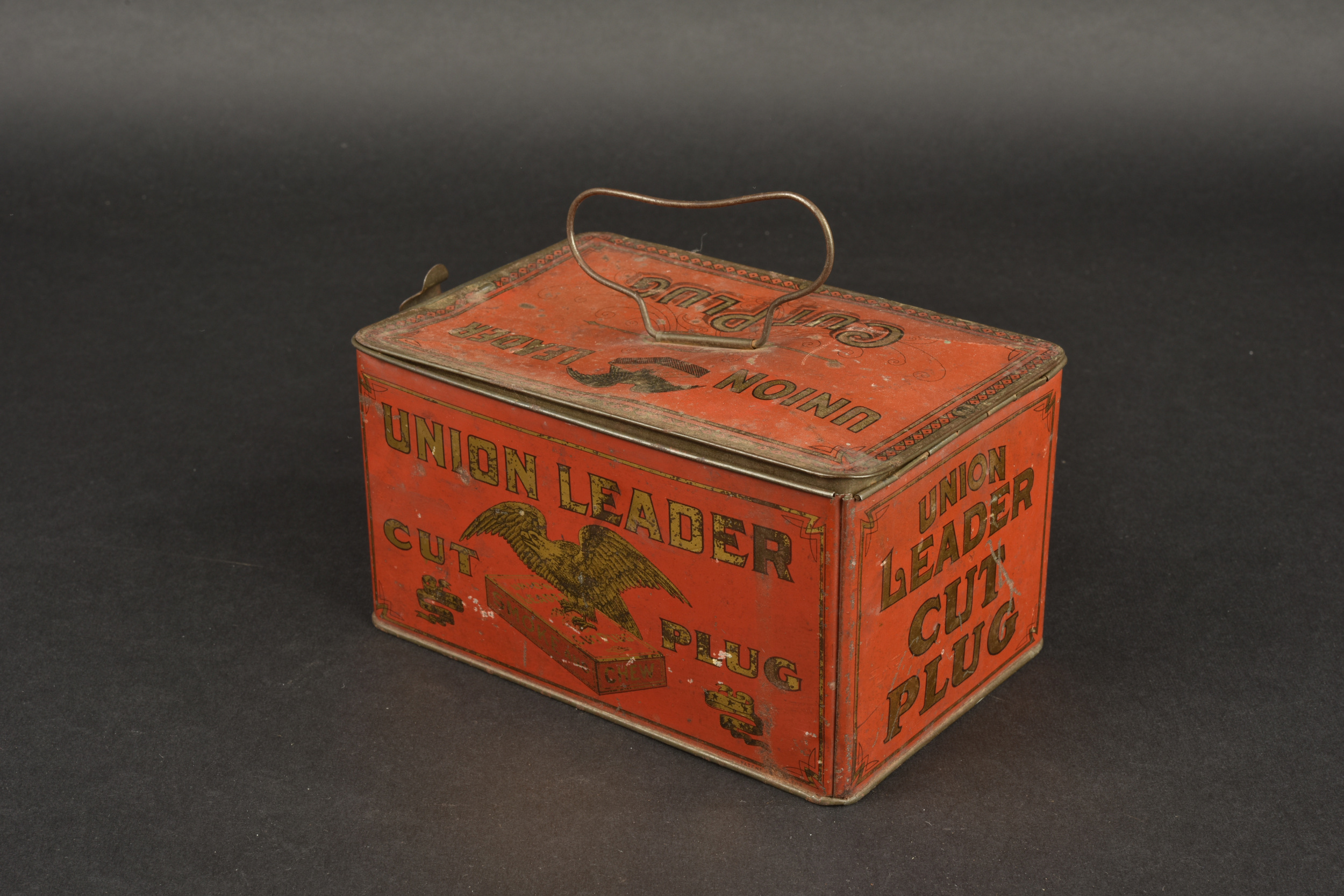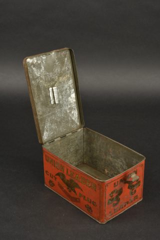 Boite Union Leader. En métal, vide. La poignée de transport est présente, ainsi que les crochets de fermeture. Les décors sont en très bon état. A noter une certaine usure et patine de la pièce. Etat II+.