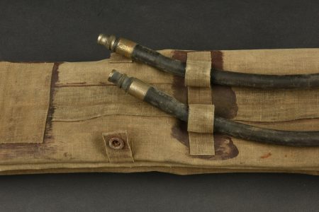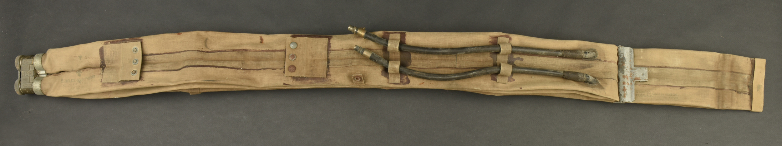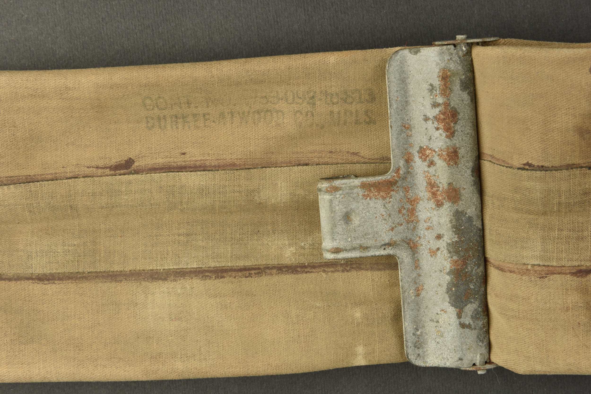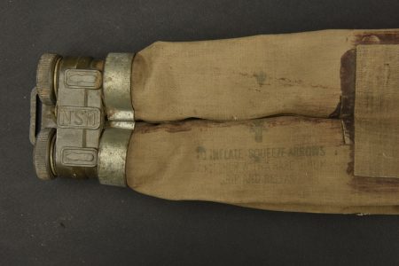 Bouée de sauvetage US Navy. En forte toile caoutchouté. Le crochet de fermeture est complet. Les tuyaux de gonflage à la bouche sont présents. Beau marquage USN au niveau du fermoir. Trois boutons pressions. Fabrication Durkee atwood Co MPLS. Date illisible. A noter une certaine usure et patine de la pièce, ainsi que quelques tâches. Etat II+.