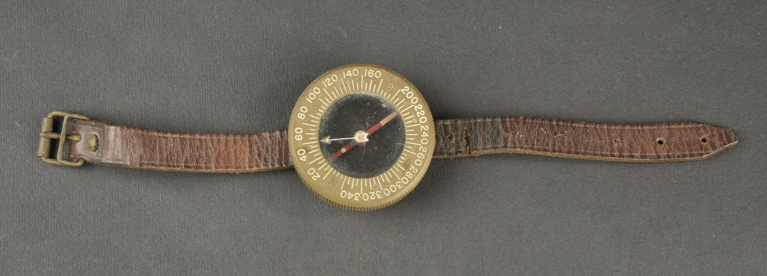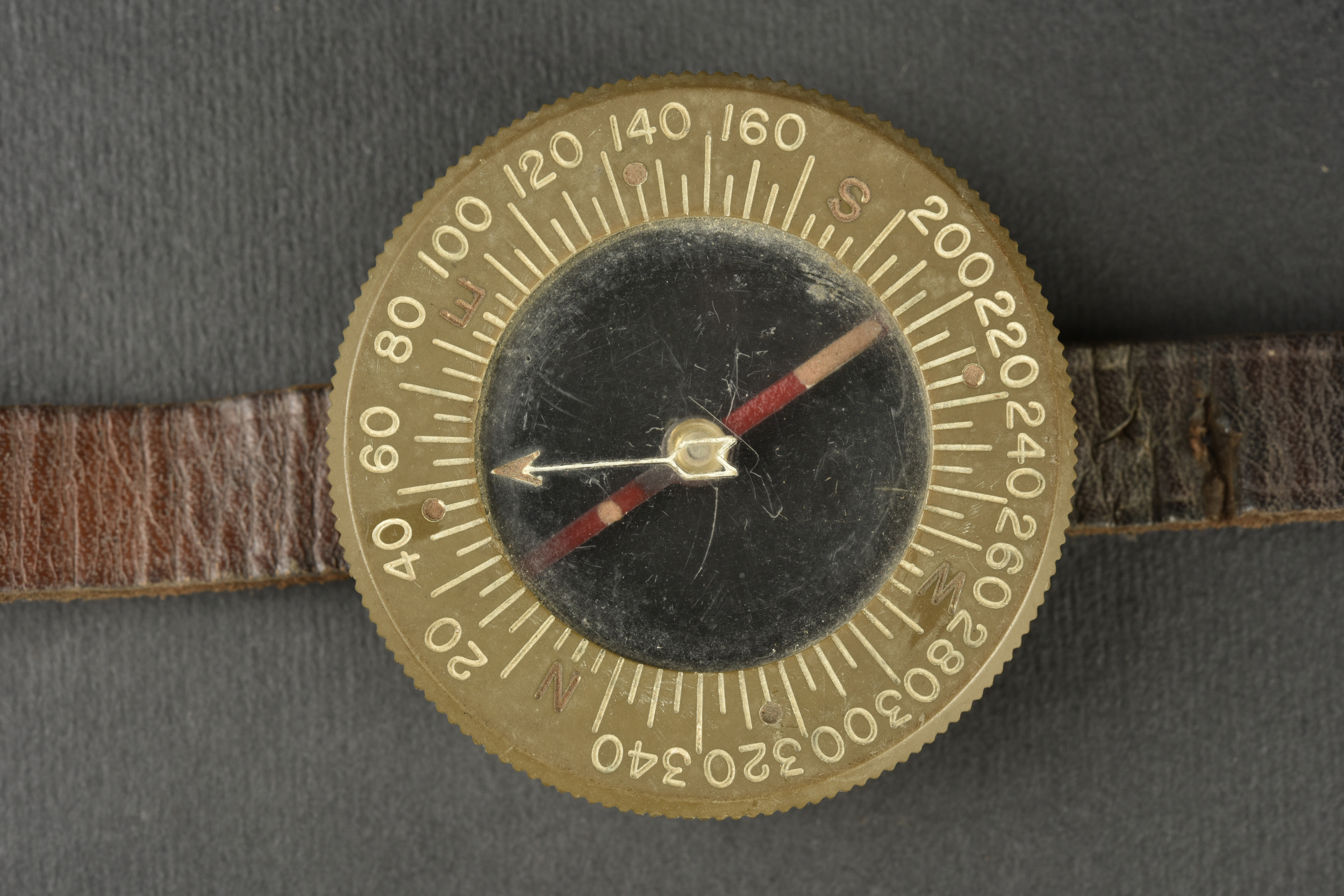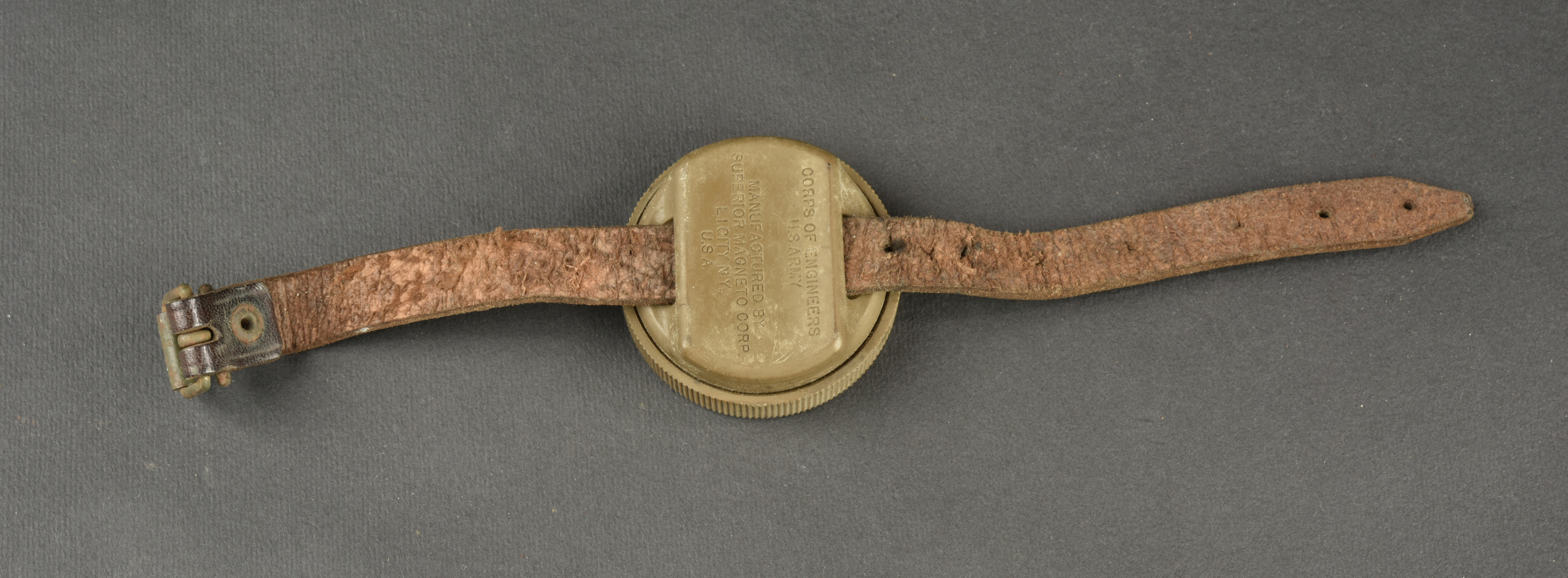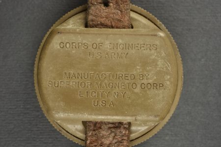 Boussole de poignée US. En bakélite kaki. Fond noir, fonctionnelle. Marquages US ARMY Corps of Engineers Manufactured by Superior Magneto Corp LI City NY. Bracelet en cuir marron, celui-ci est partiellement craquelé. A noter une certaine usure et patine de la pièce. Etat II+.