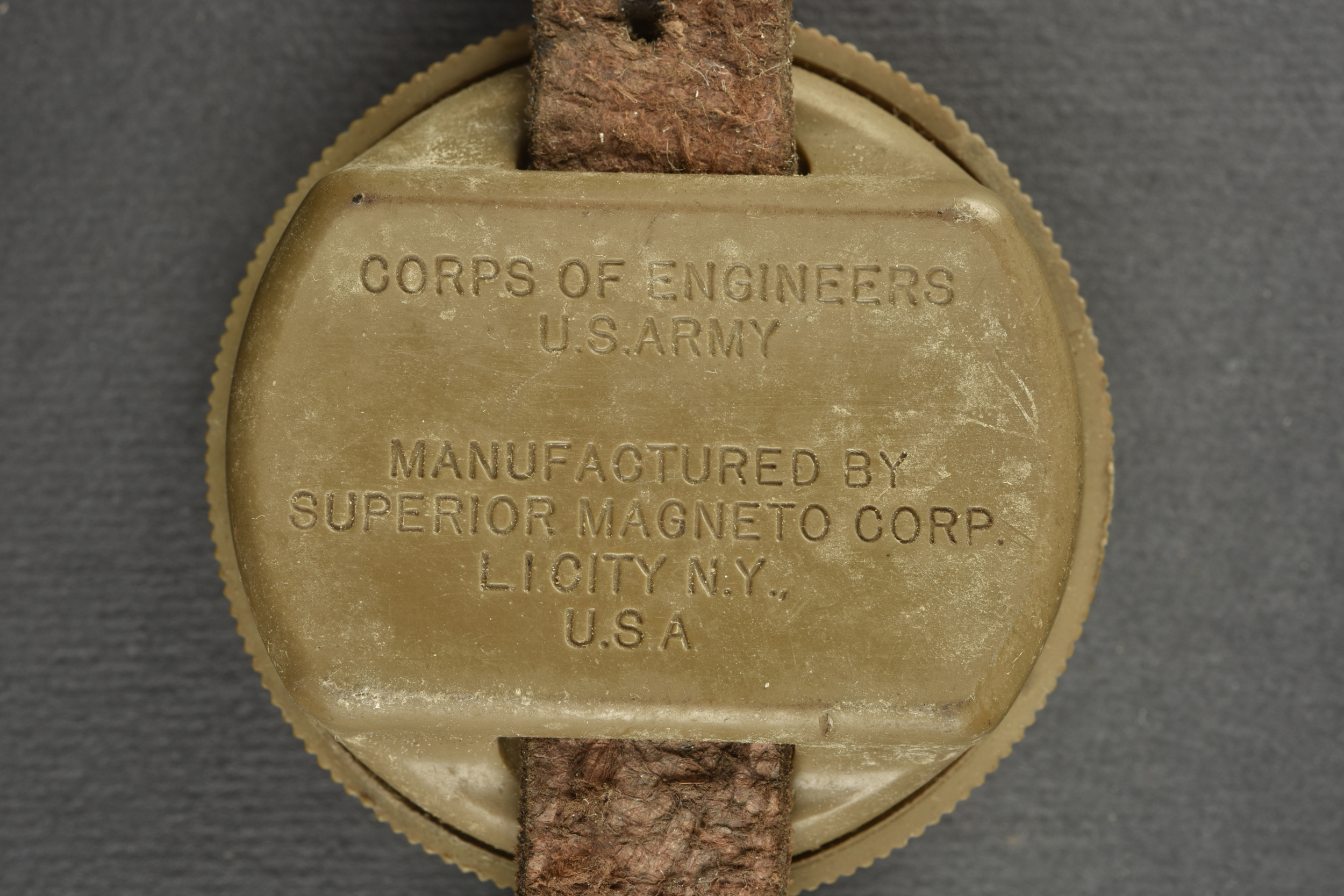 Détails de la vente >Boussole de poignée US. En bakélite kaki. Fond noir, fonctionnelle. Marquages US ARMY Corps of Engineers Manufactured by Superior Magneto Corp LI City NY. Bracelet en cuir marron, celui-ci est... en savoir plus