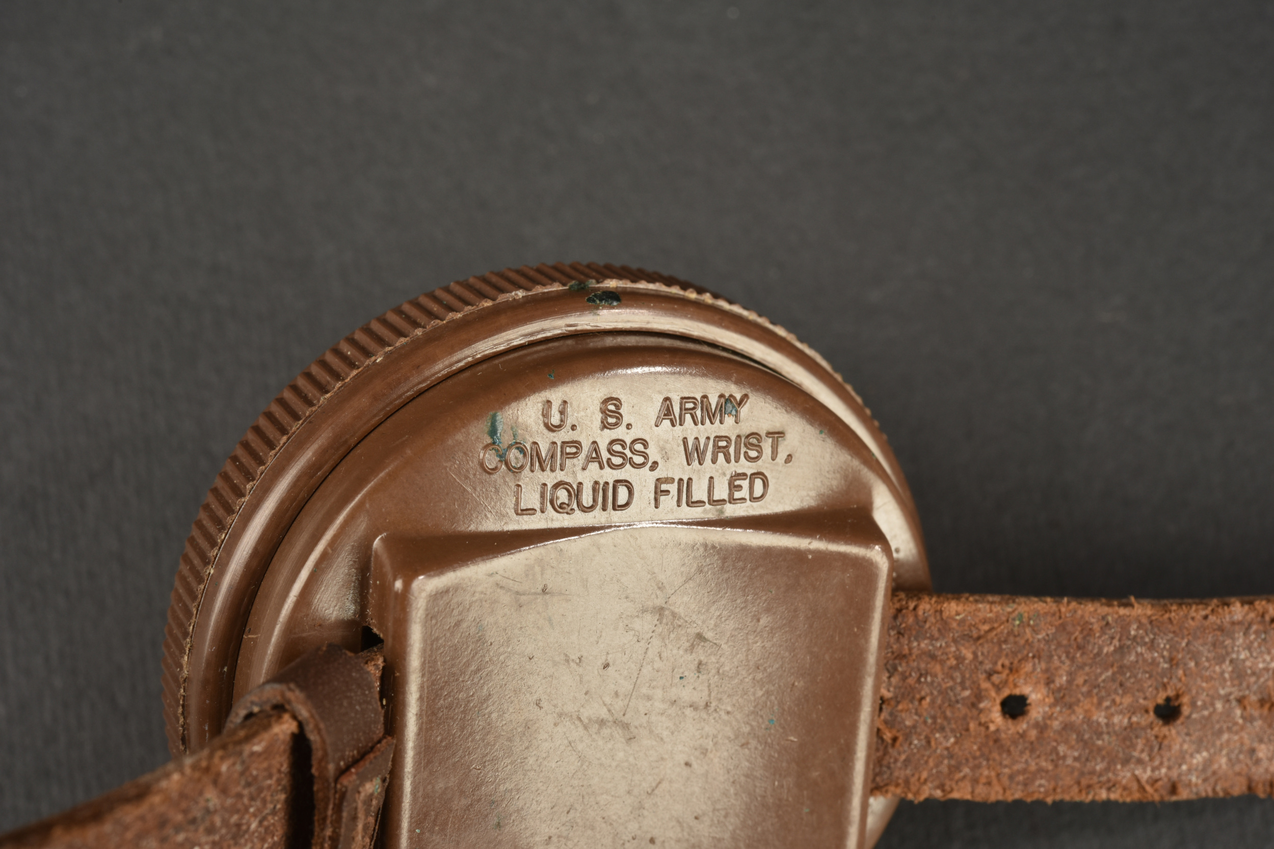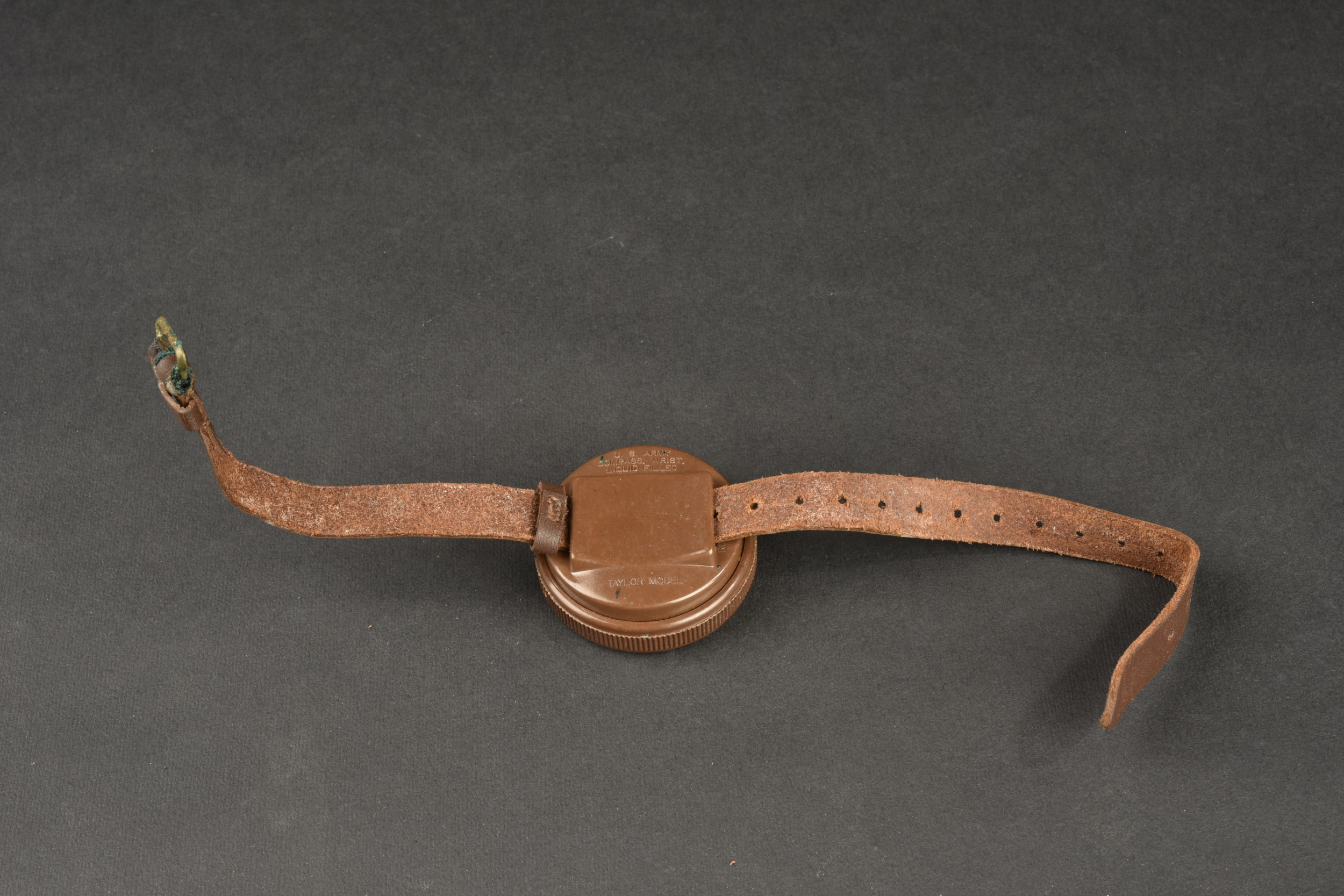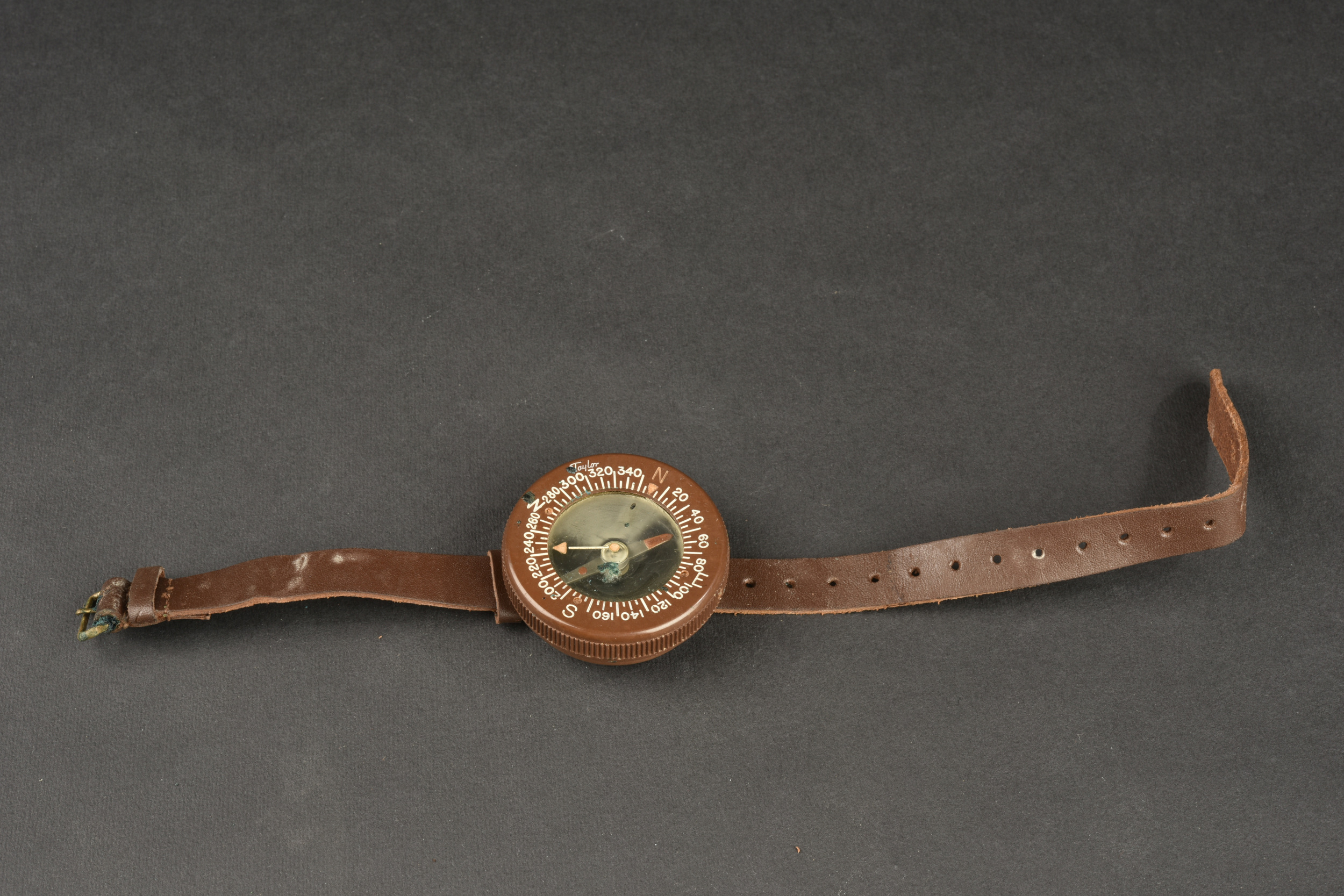 Boussole de poignet Taylor US WW2. Boussole en bakélite marron, fonctionnelle, bracelet en cuir. Fabrication Taylor Rochester N.Y. et Model, US Army Compass Wrist Liquid Filled. Oxydation sur la bouclerie du bracelet