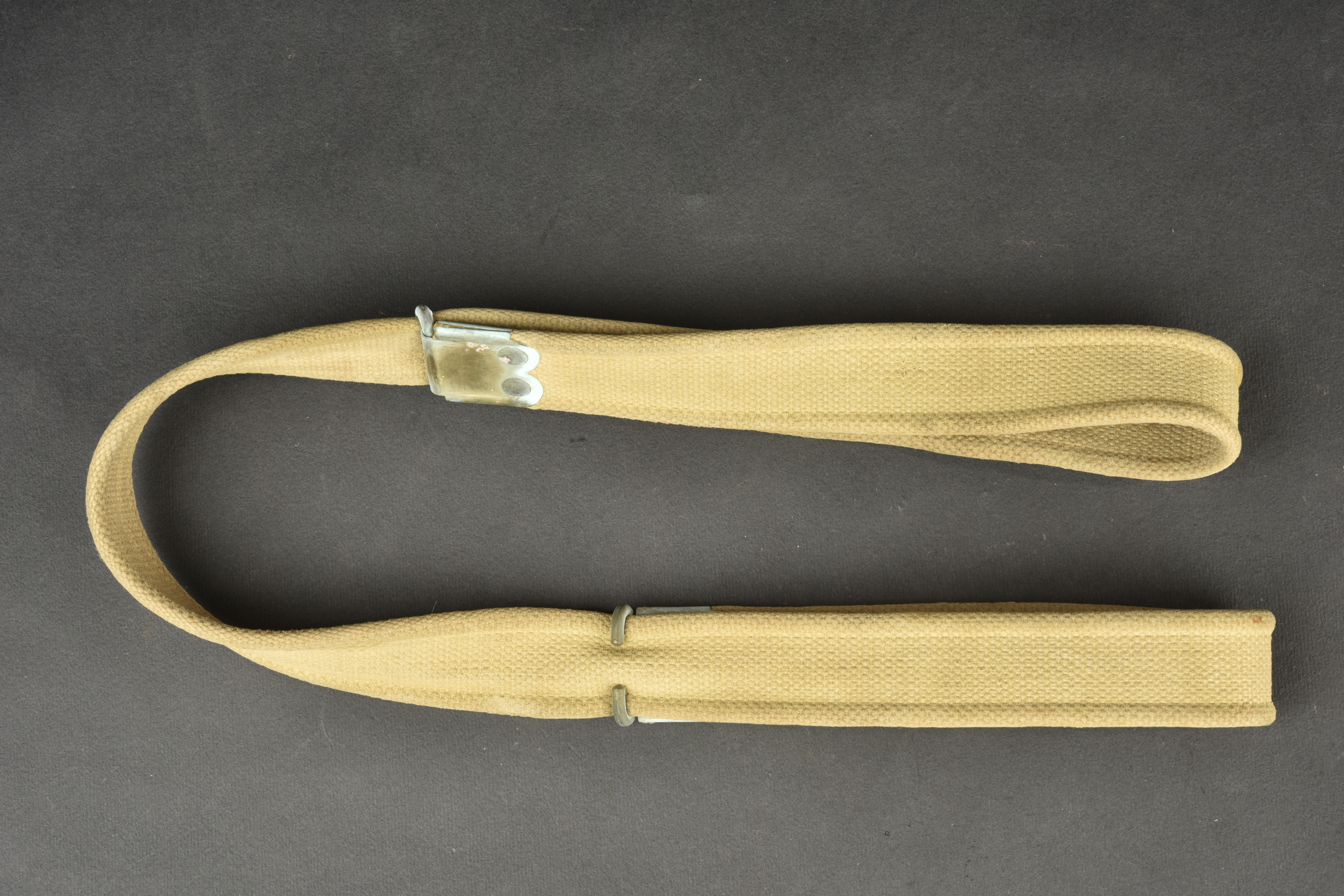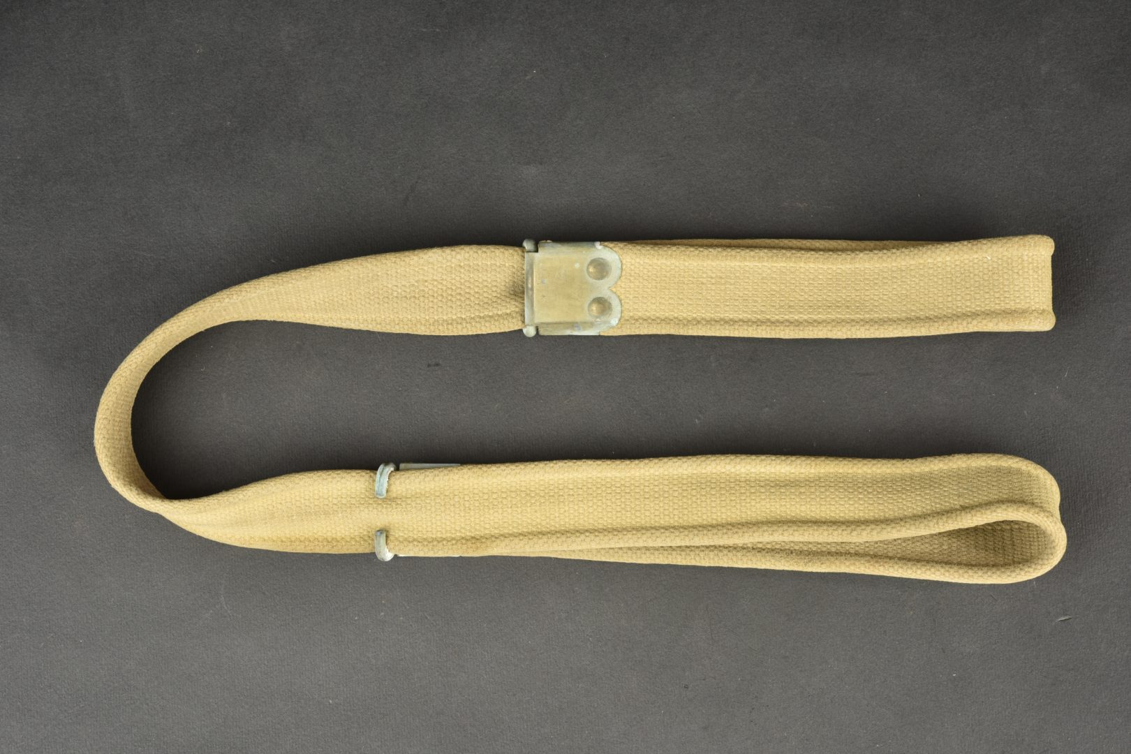 Bretelle de Lee Enfield. En forte toile web. Les parties métalliques sont partiellement oxydées. Les marquages fabricant sont illisibles. A noter une certaine usure et patine de la pièce. Etat II+.