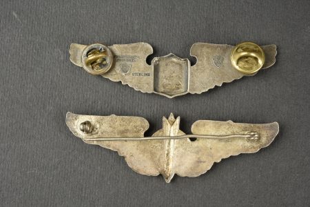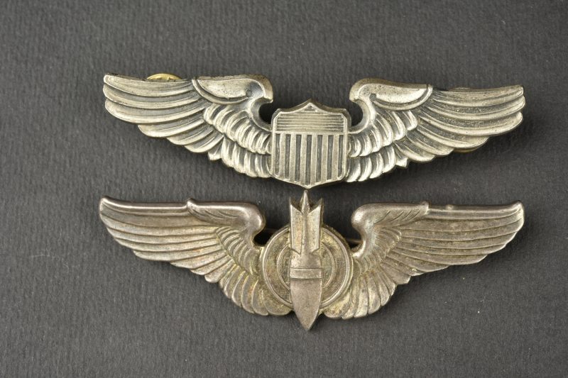 Brevets d’aviation US. Comprenant un brevet de pilote, complet avec son attache, bien marqué Sterling. Un brevet de bombardier léger, attache complète, bien marqué Sterling. A noter une certaine usure et patine des pièces. Etat II+.