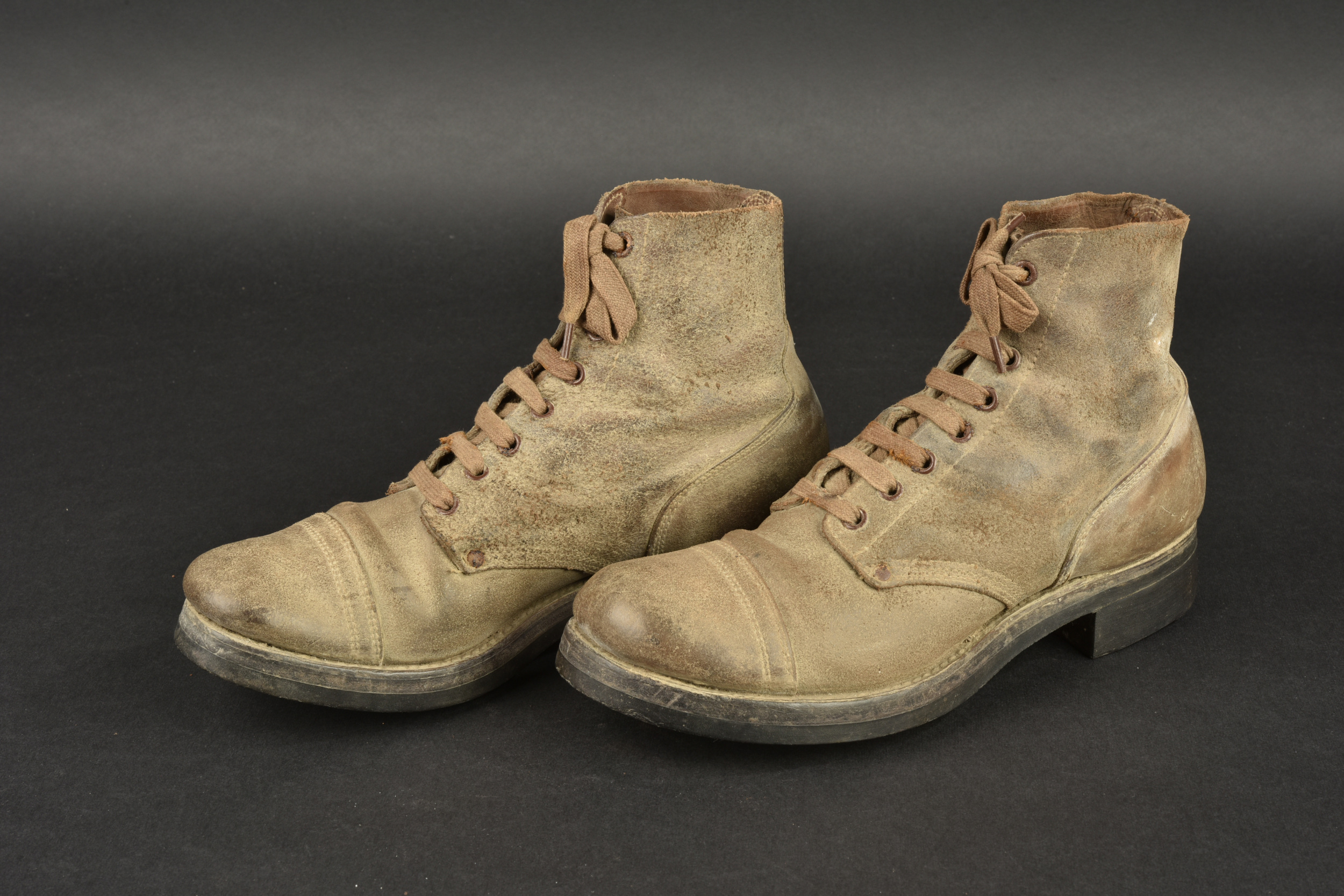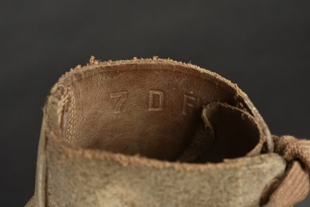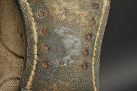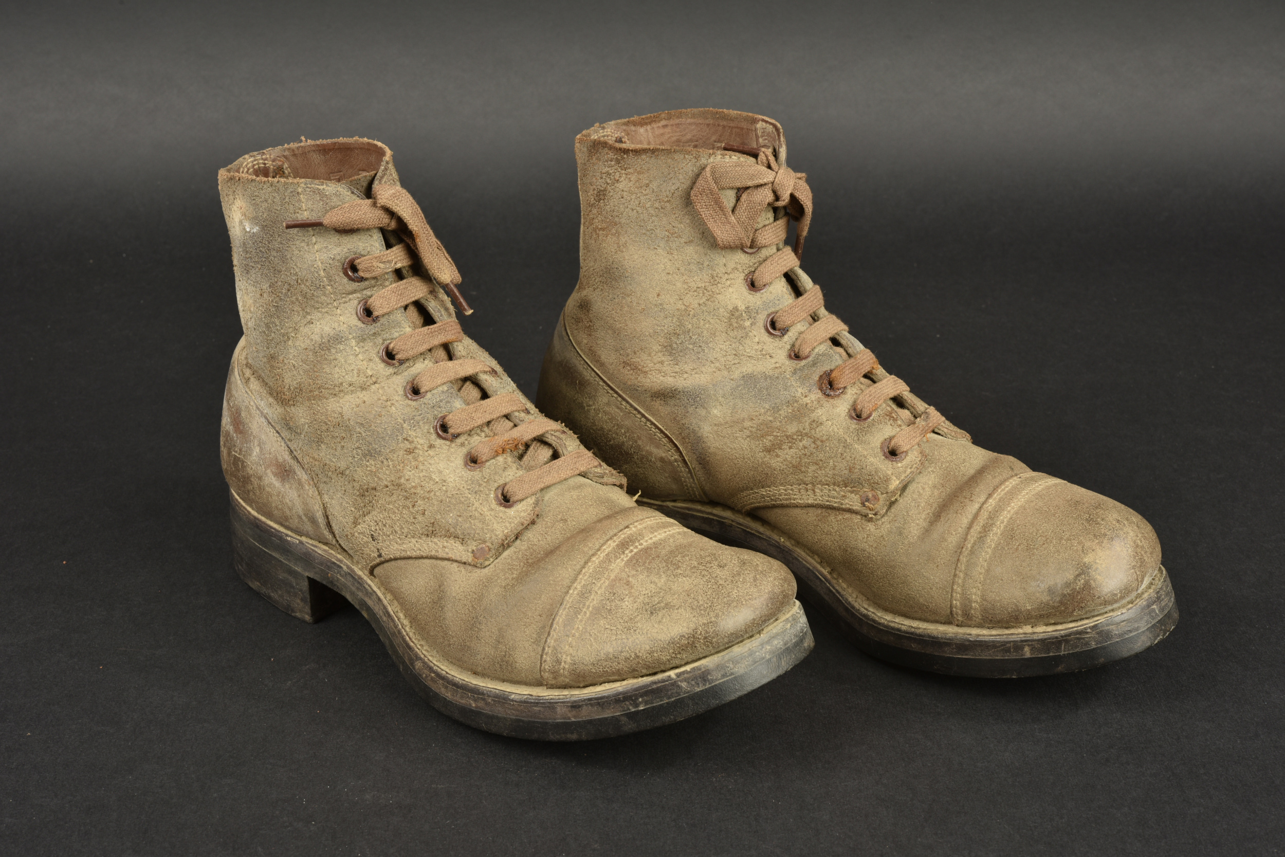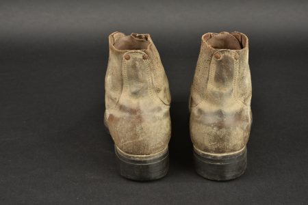 Brodequins US. Paire homogène en cuir retournés. Bouts rapportés. Les lacets sont complets. Marquages sur le côté 7 D FN. Semelles et talons en caoutchouc, marqué HB. Marquages interne partiellement illisibles, mais datés du 30 janvier 1943. Les œillets de laçage sont partiellement oxydés. A noter une certaine usure et patine des pièces. Etat II+.
