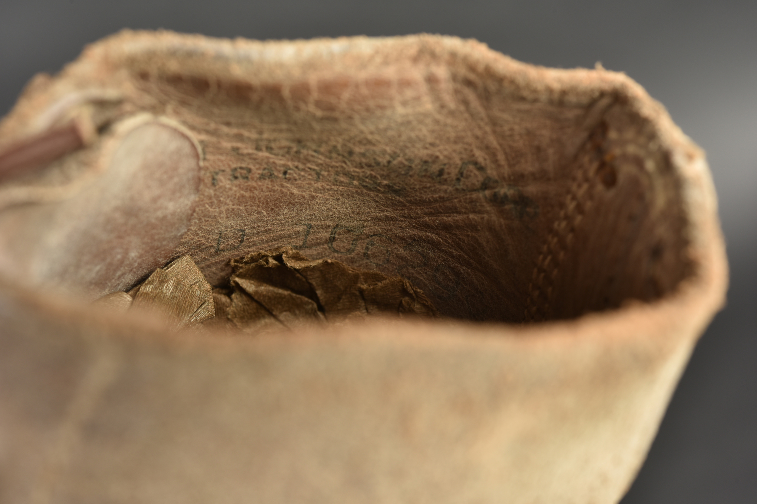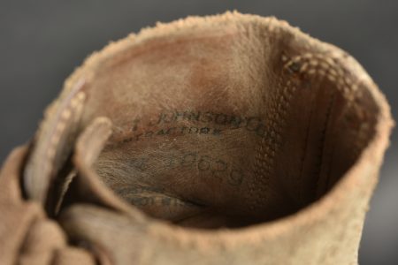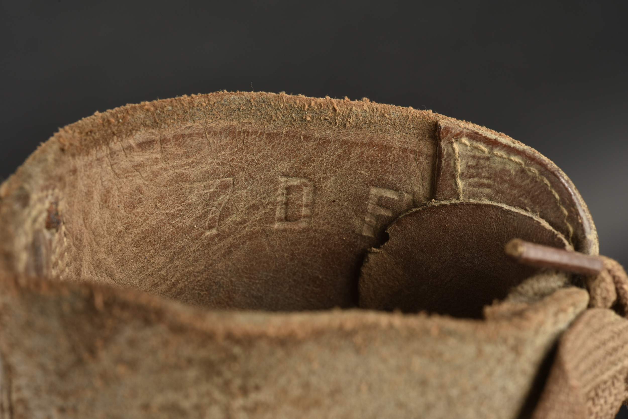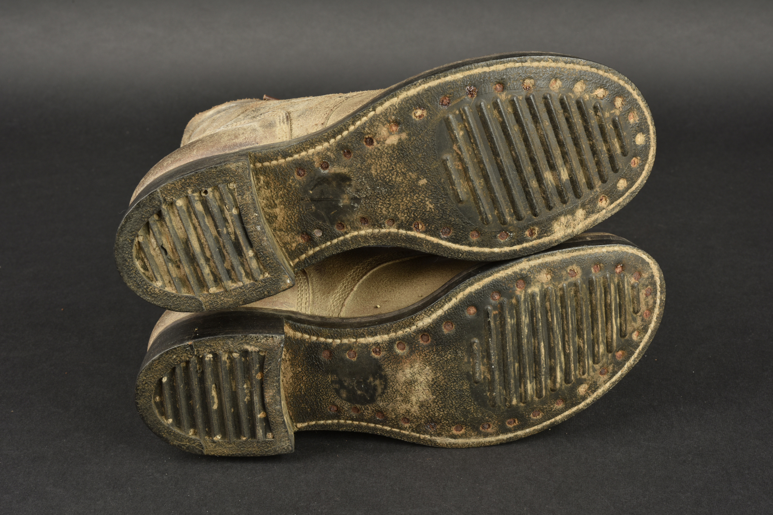 Brodequins US. Paire homogène en cuir retournés. Bouts rapportés. Les lacets sont complets. Marquages sur le côté 7 D FN. Semelles et talons en caoutchouc, marqué HB. Marquages interne partiellement illisibles, mais datés du 30 janvier 1943. Les œillets de laçage sont partiellement oxydés. A noter une certaine usure et patine des pièces. Etat II+.