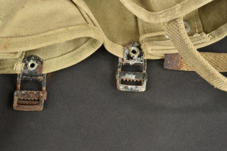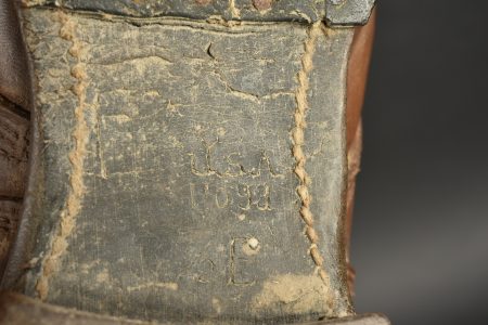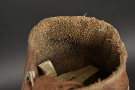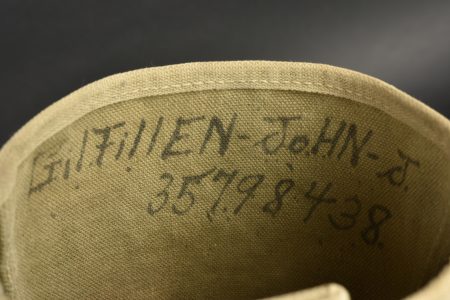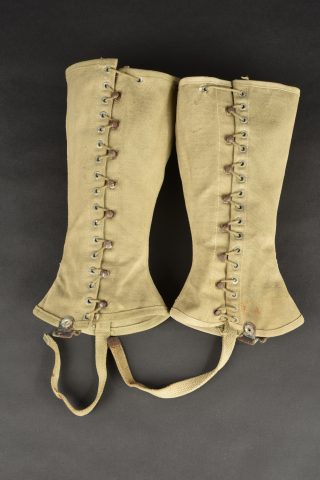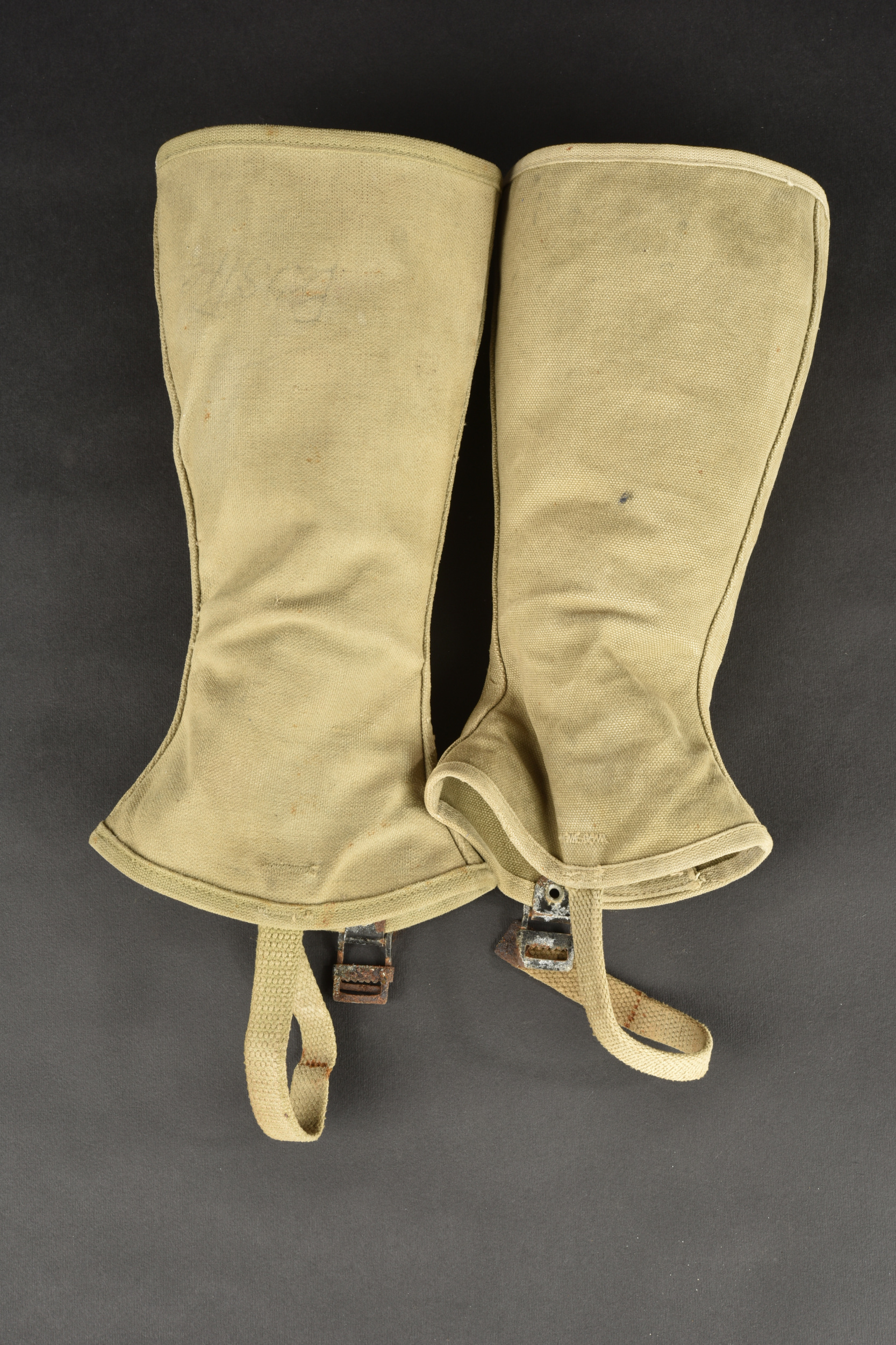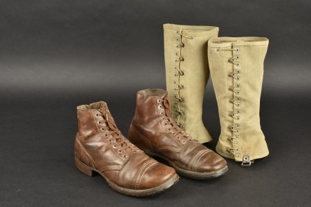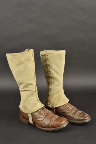 Brodequins US. Paire homogène en cuir marron lisse. Bouts rapportés. Huit œillets de laçage. Les lacets sont présents. Talons en caoutchouc. Semelles en cuir. Les marquages sont illisibles. Les marquages interne sont illisibles. On y joint une paire de guêtre en forte toile OD, les lacets sont présents. Toutes les pièces métalliques sont oxydées. Les marquages sont illisibles. Reste de marquage de fabricant illisible. A noter une certaine usure et patine des pièces, ainsi que des tâches. Etat II+.