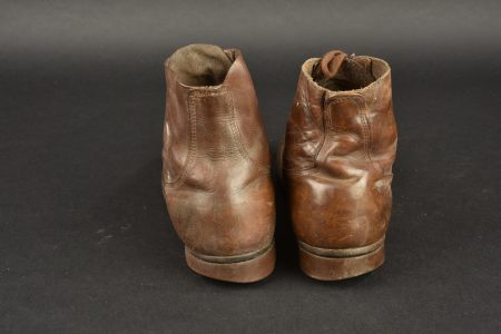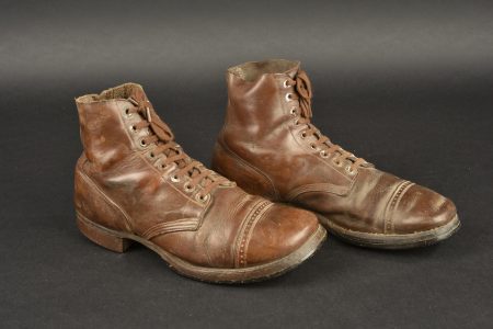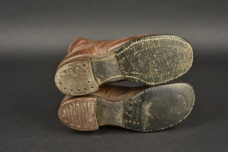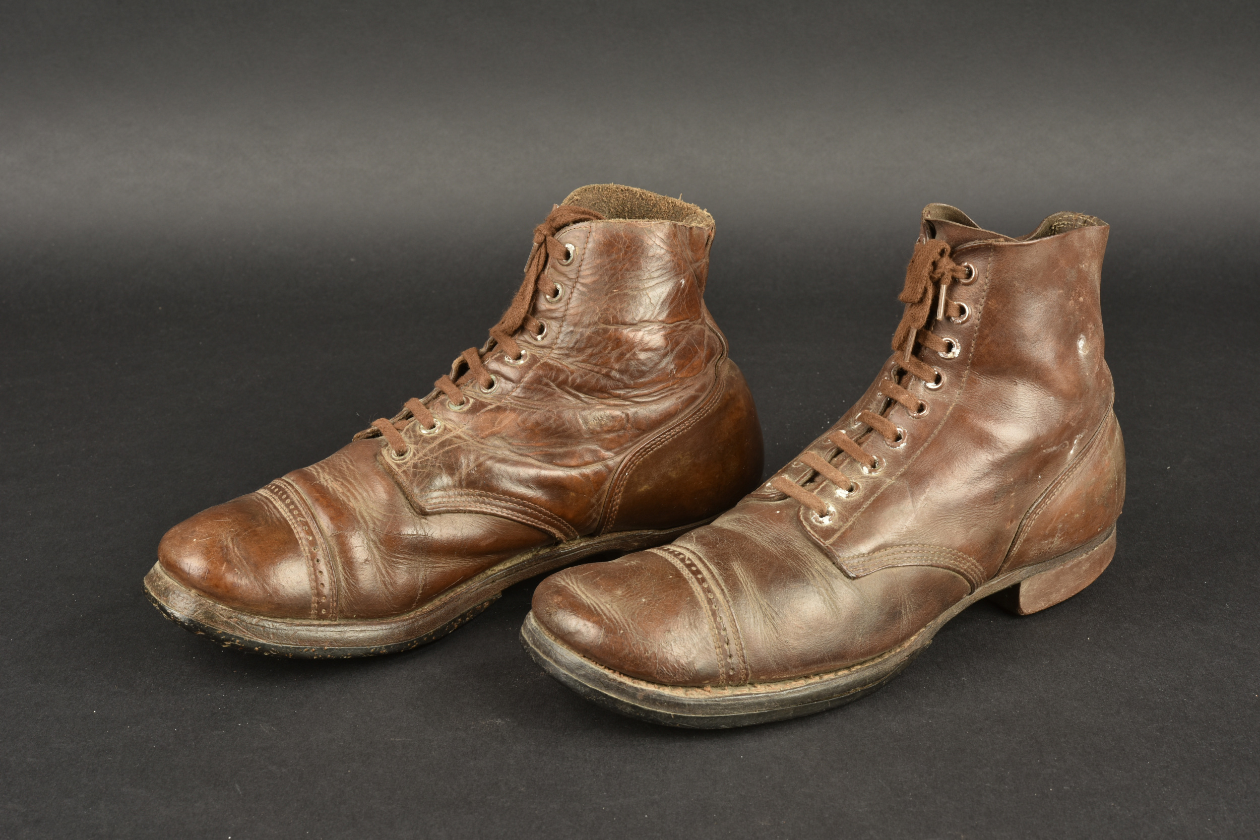 Détails de la vente >Brodequins US. Paire homogène en cuir marron lisse. Bouts rapportés. Huit œillets de laçage. Les lacets sont présents. Talons en caoutchouc. Semelles en cuir. Les marquages sont illisibles.... en savoir plus