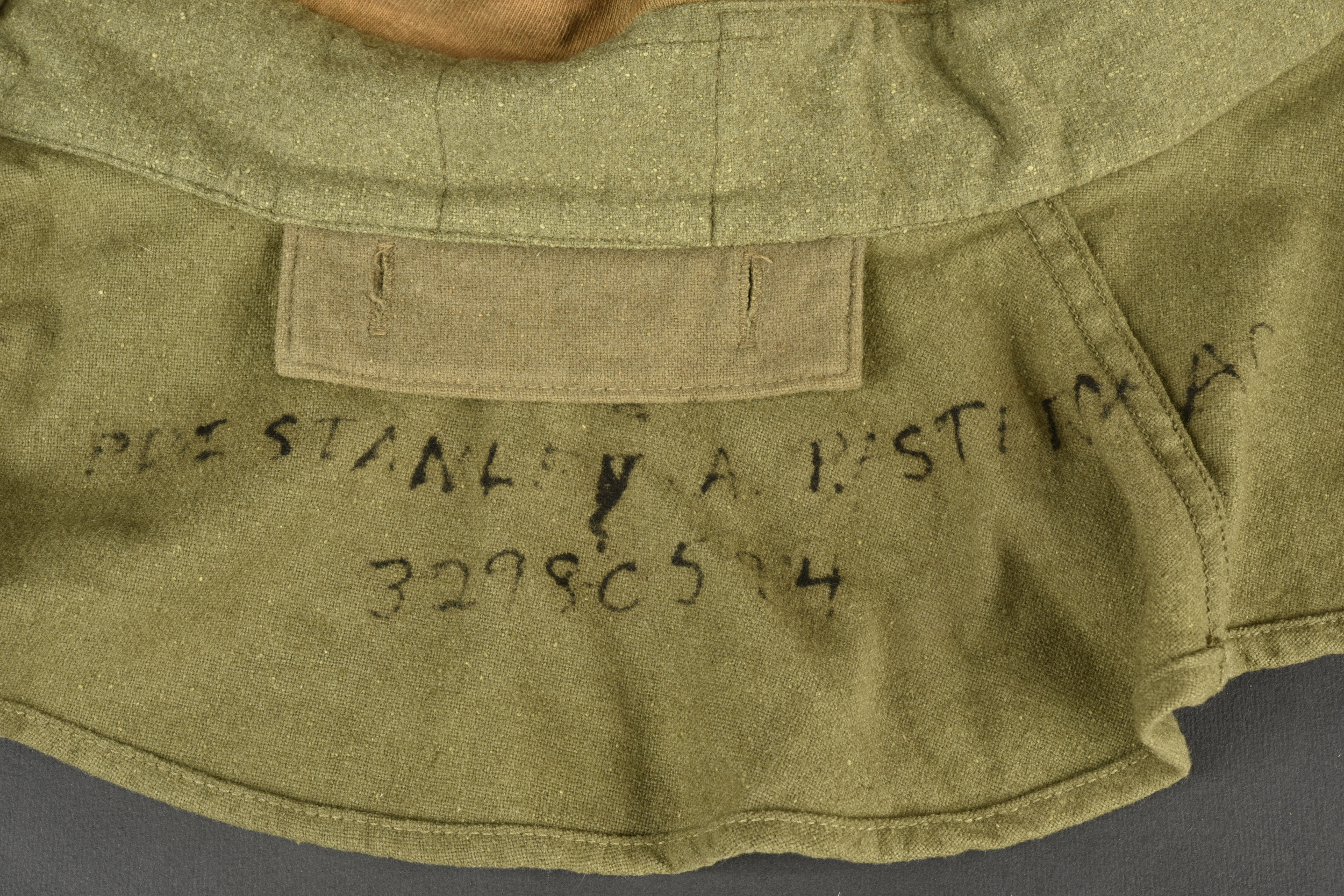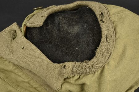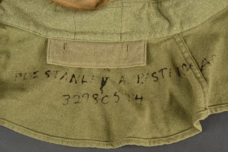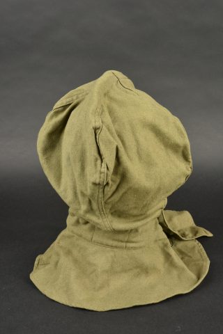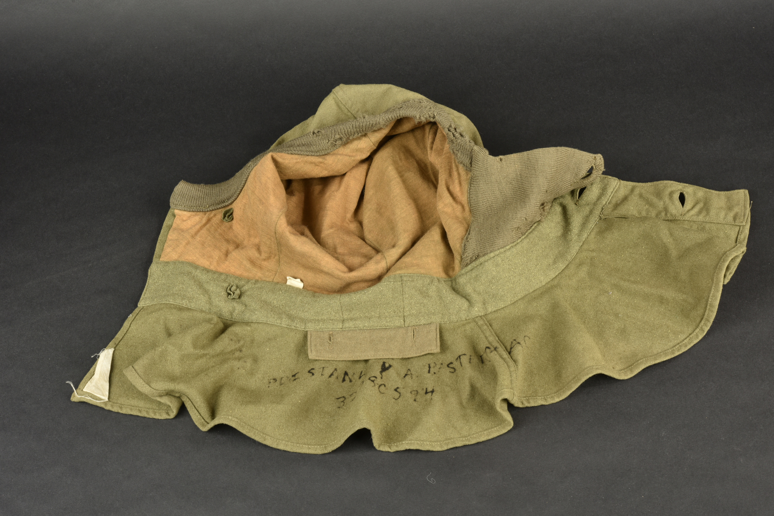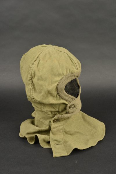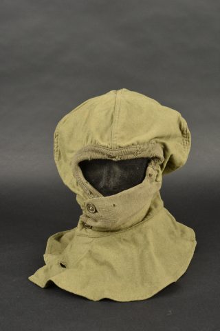 Cagoule anti-gaz. En drap de laine kaki, imprégné de produit anti-gaz. Tous les boutons sont présents. Intérieur doublé en tissu orangé. Etiquette du fabricant présente, mais illisible. Indication nominative manuscrite Stanley A Rastern 32980524. A noter une certaine usure et patine de la pièce, ainsi que des tâches et trous de mite. Etat II+.