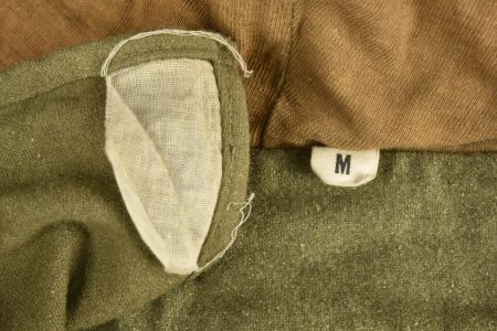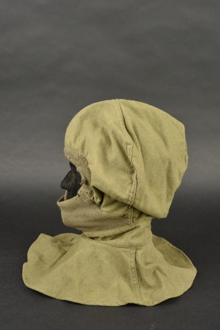 Cagoule anti-gaz. En drap de laine kaki, imprégné de produit anti-gaz. Tous les boutons sont présents. Intérieur doublé en tissu orangé. Etiquette du fabricant présente, mais illisible.... en savoir plus